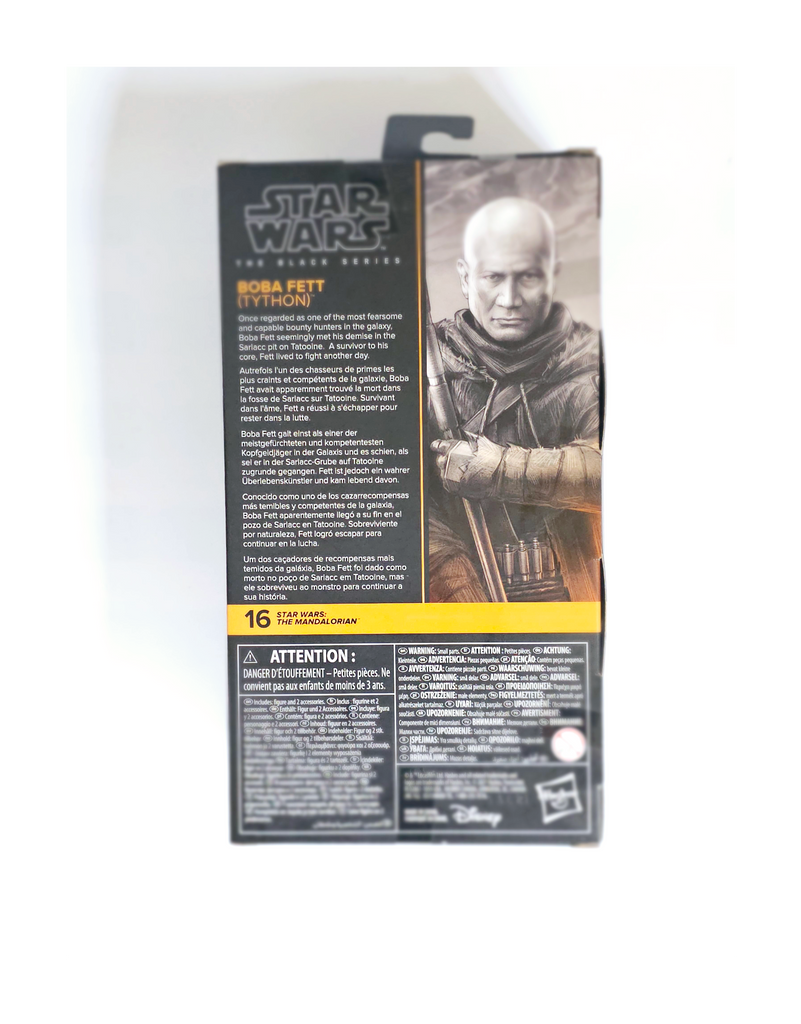 Hasbro Star Wars The Black Series F1879 - 16 Star Wars: The Mandalorian - Boba Fett (Tython) Action Figure, Disney in its original box. It weighs 199 g. Its measurements are 12.5 cm width, 22.8 height, and 5 cm depth. Brand new and In excellent condition. Collectable. Collectors' item.