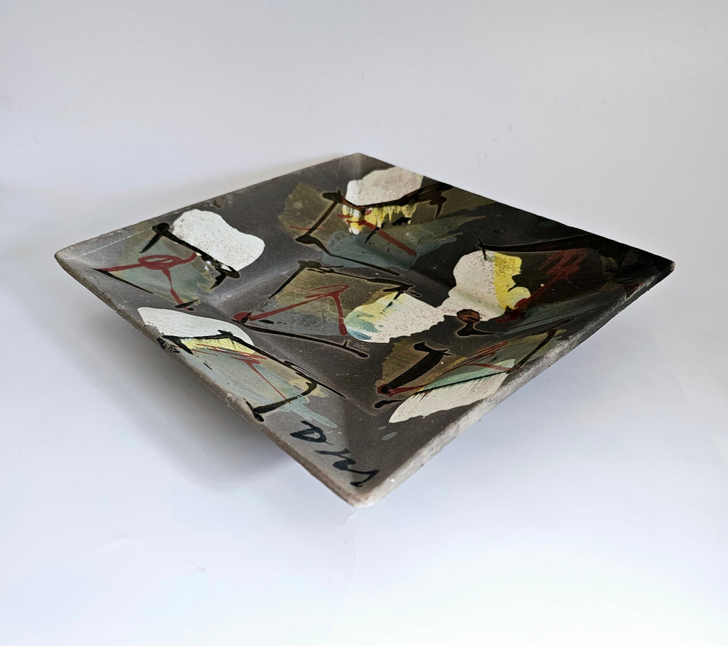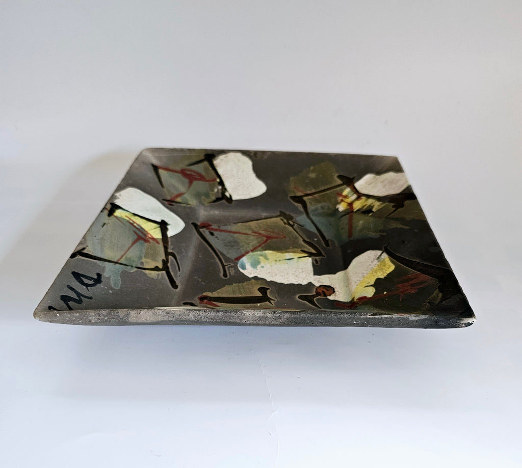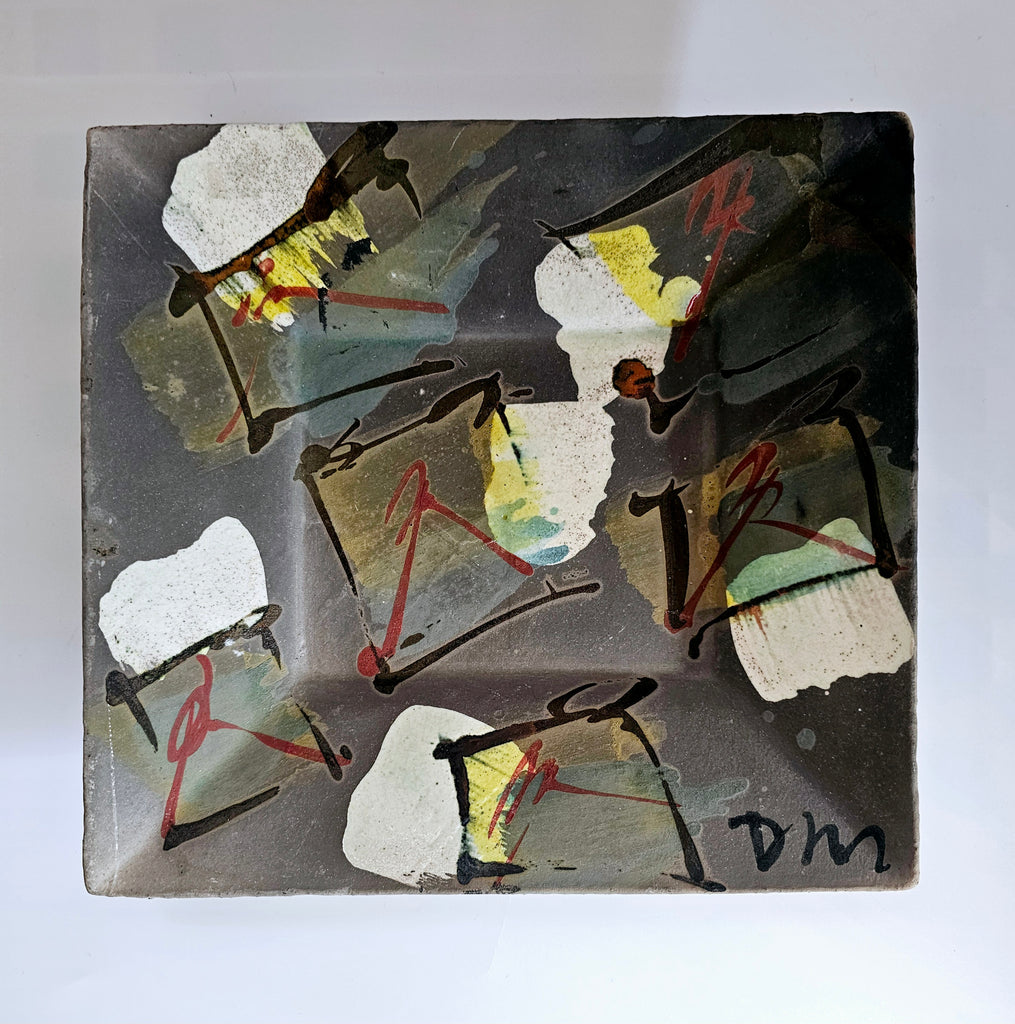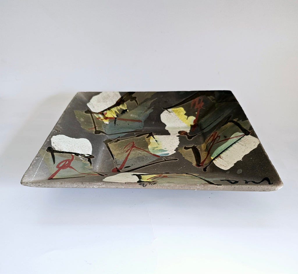 A beautiful hand made and hand painted ceramic studio art pottery square plate signed by the artist as Dm. It's painted in abstract art style, very modern and contemporary. In perfect condition, no cracks, no chippings, and no restoration.It weighs 780g, its measurements are 21.5cm x 21.5 cm, and 4cm height. A great addition to your Studio Art Pottery collection. Collectible. Collector's item.