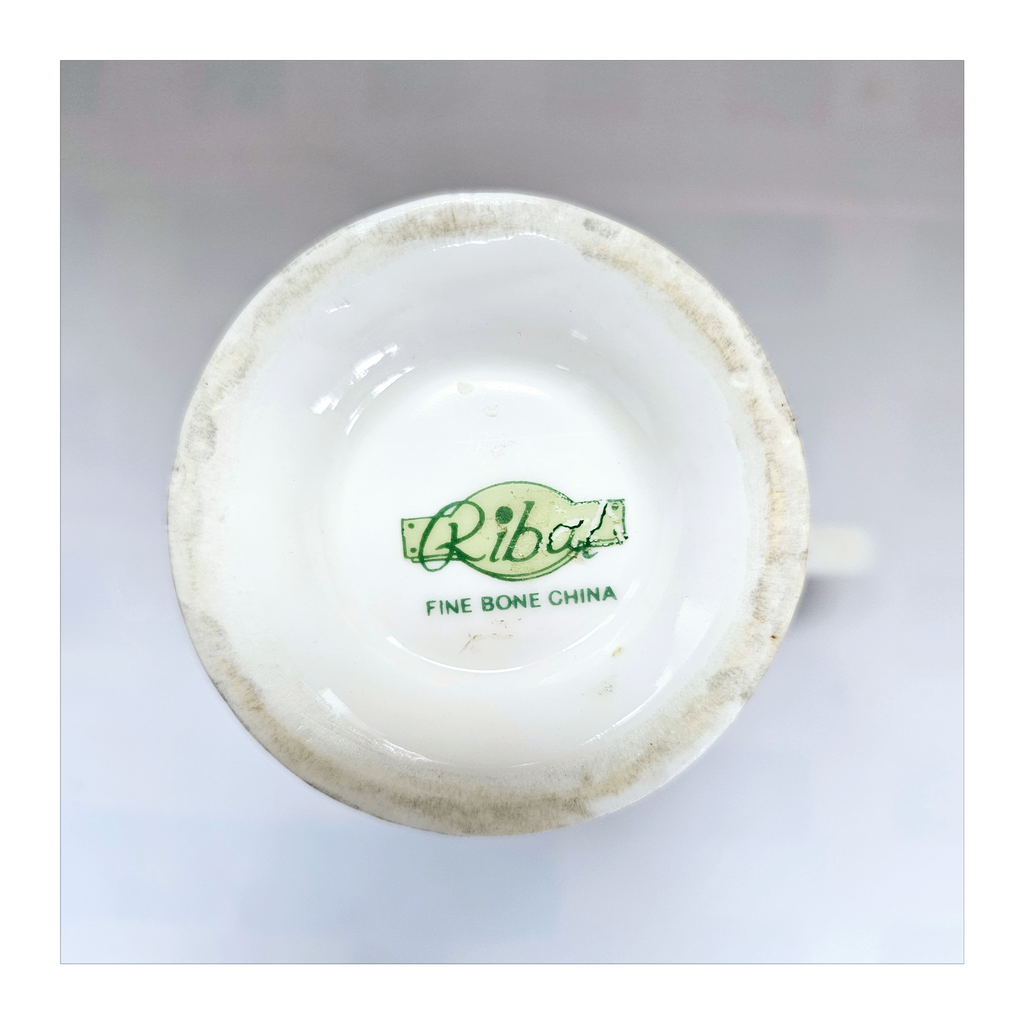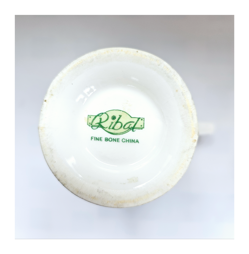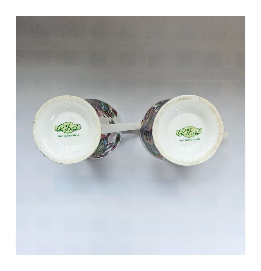 A Pair of Art Deco style Ribal fine bone china mugs. Together they weigh 367 g. The measurements of each cup are 8.7 cm diameter at the top, 6.3 cm diameter at the bottom, 11.5 cm width at its widest and 11.2 cm height. One mug is in excellent condition, no chips no cracks. The other mug is also in a very good condition, only a tiny chip on the rim as seen in the image and reflected in the price.