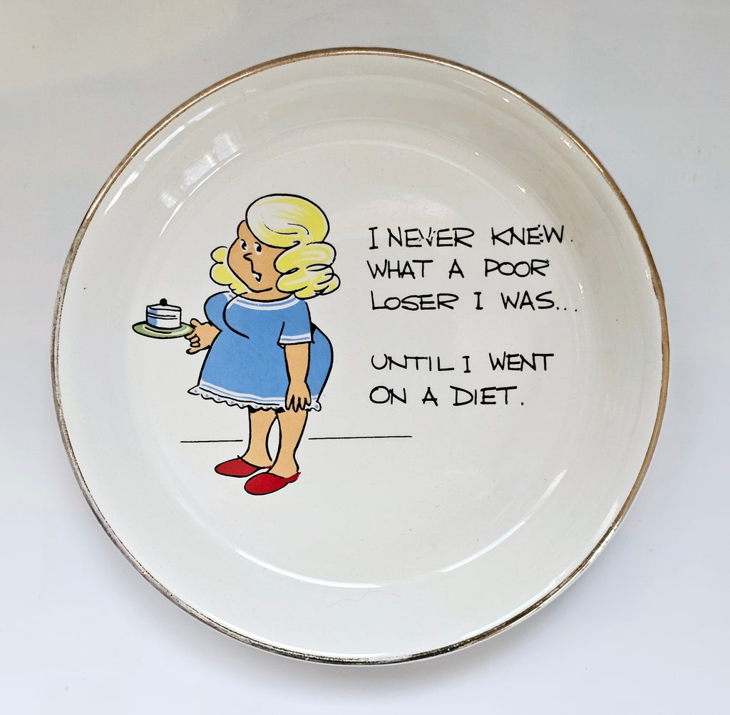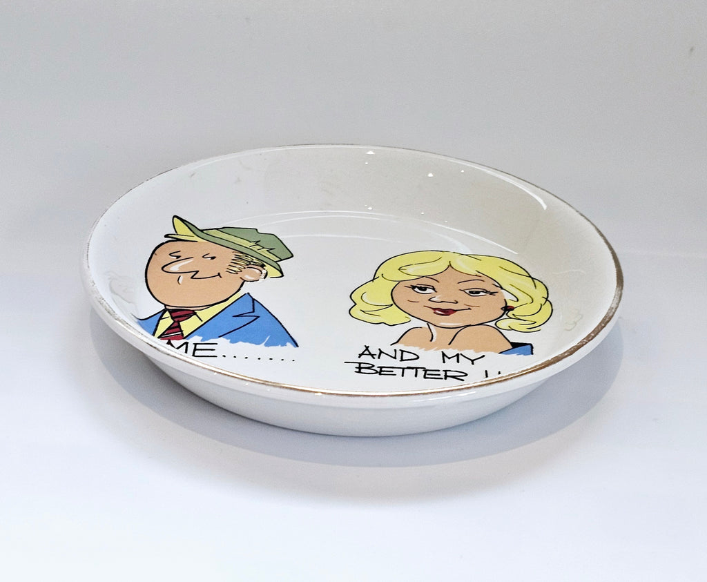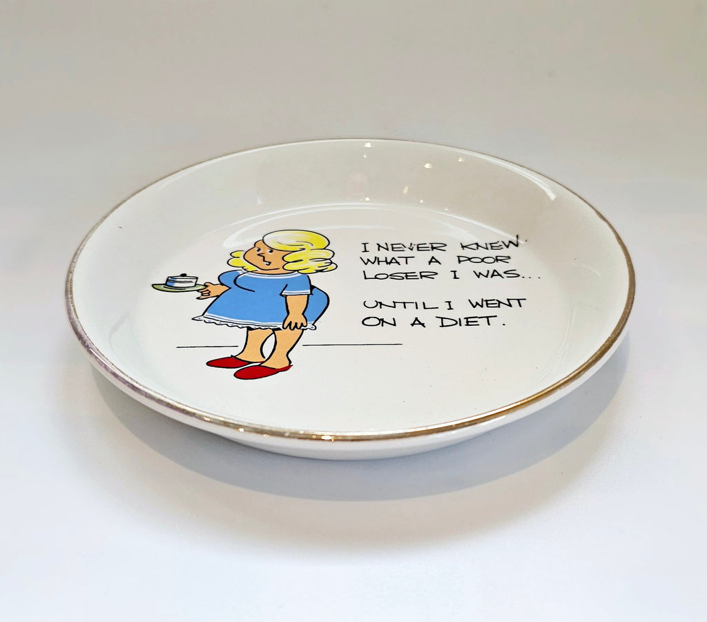 A pair of Vintage small plates/Pin Dishes - Prince William Warranted 22 Carat Gold Made in England. Illustrated with humorous quotes, "ME AND MY BETTER HALF" and "I NEVER KNEW WHAT A POOR LOSER I WAS...UNTIL I WENT ON A DIET". In overall great condition. Each weighs 150g, diameter 13.5 cm. A great addition to your decorative plate collection. Collectable. Collector's item.