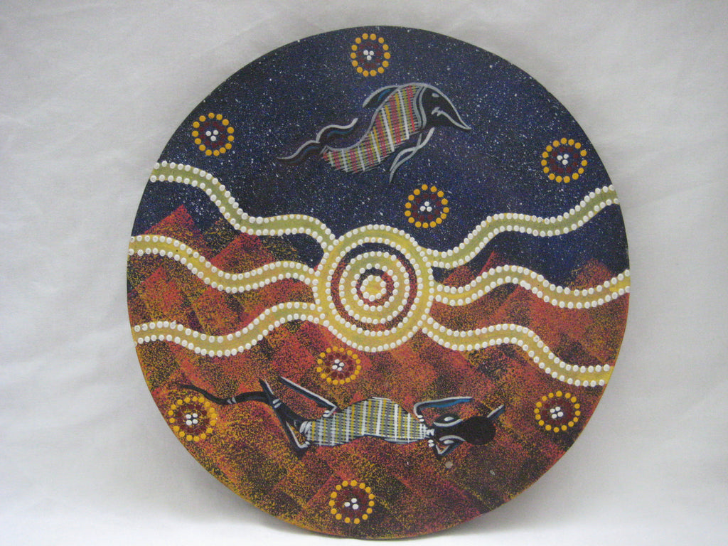 A beautiful Aboriginal Art plate from Yarramunua Dreaming Gallery in Australia. It weighs 0.5 kg, its diameter is 29.5 cm. Collector's item.