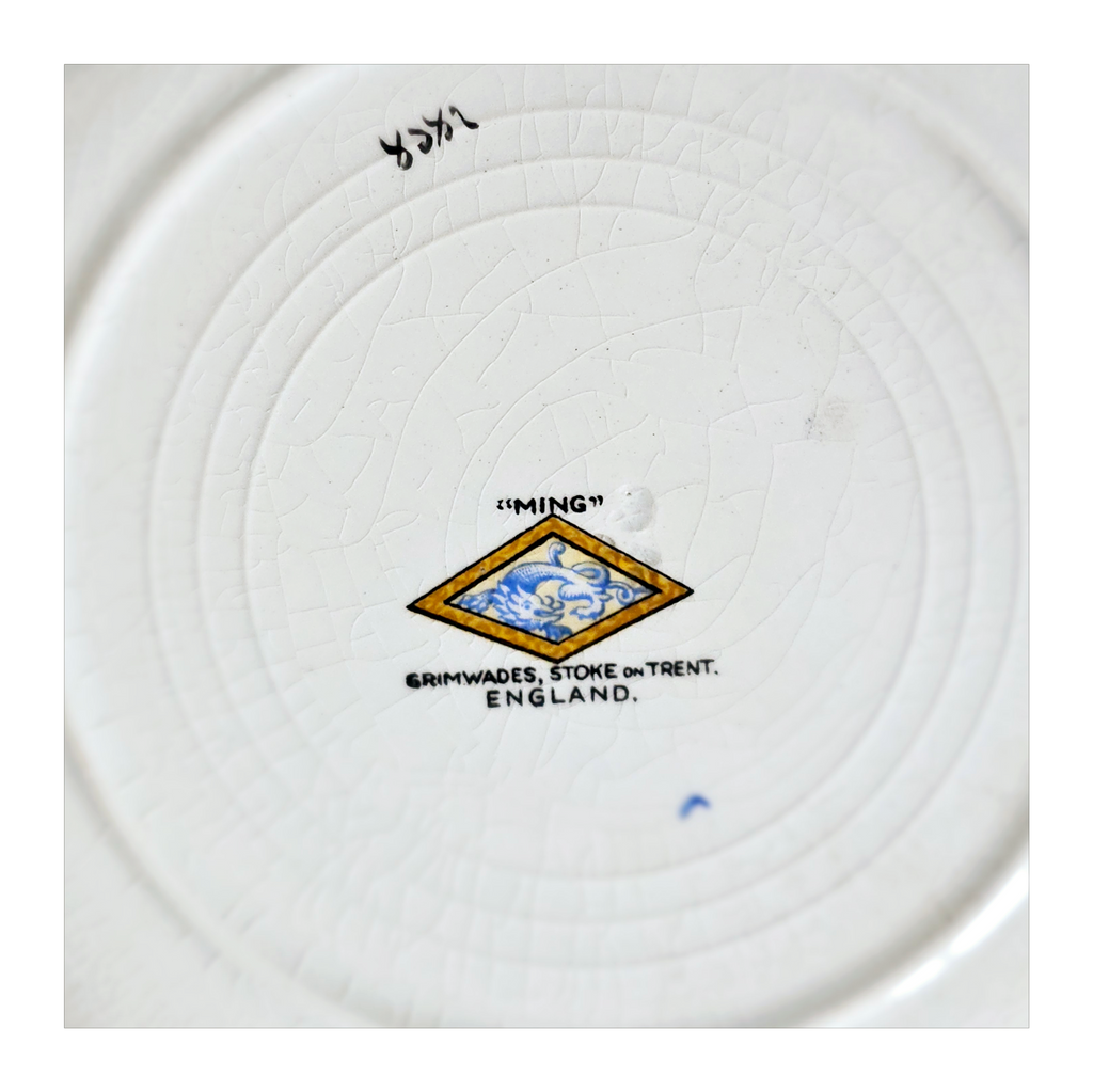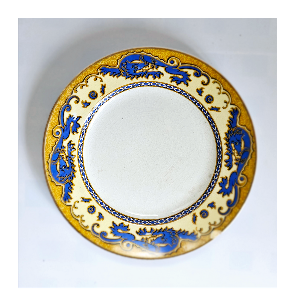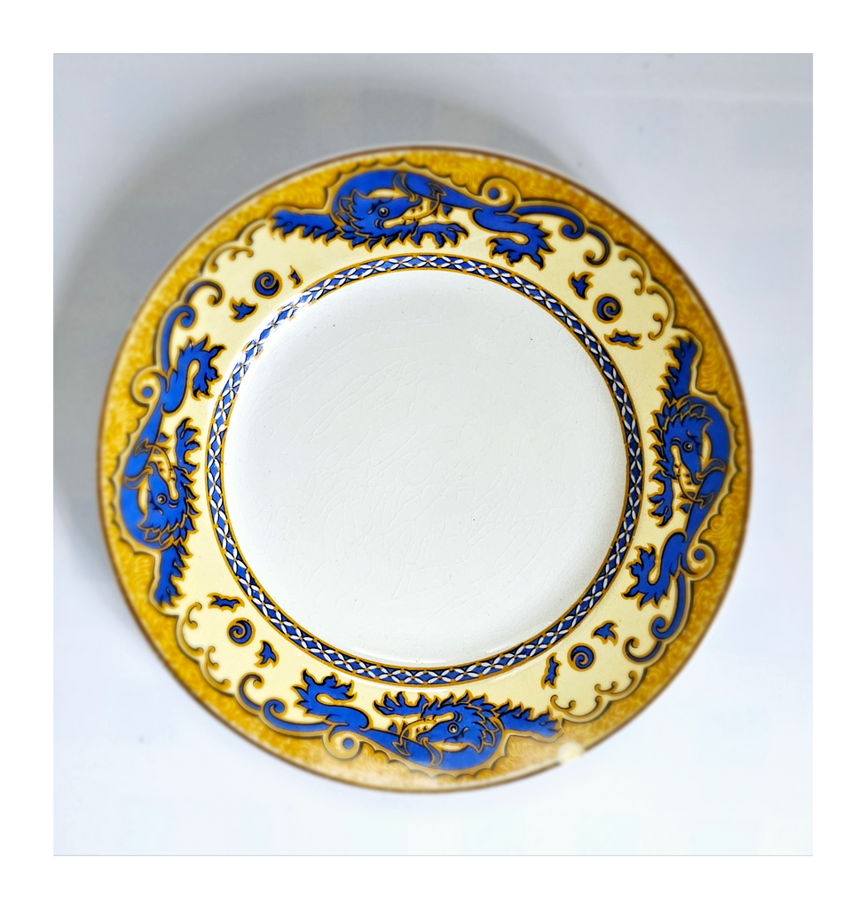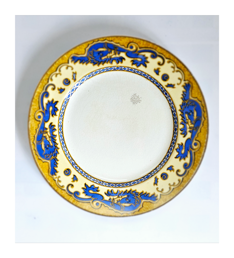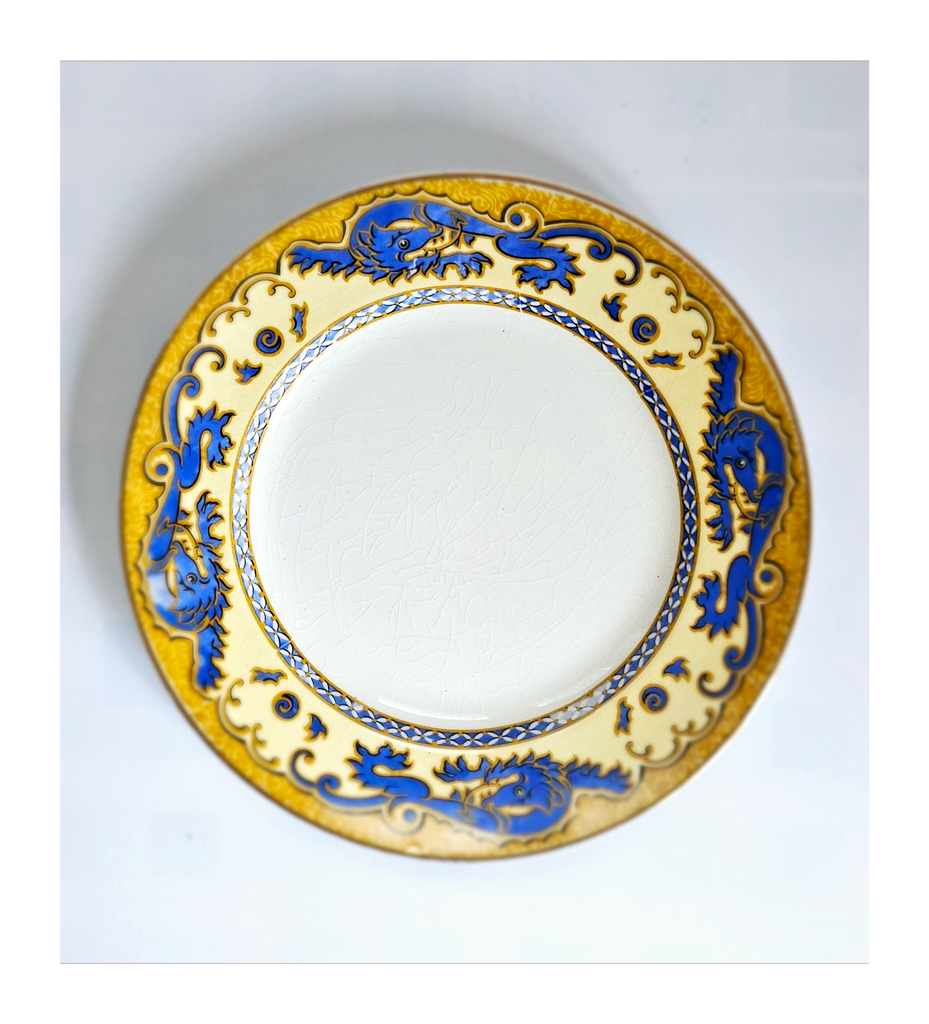 Antique 1930's Set of 5 Grimwades Stoke-On-Trent England "Ming" Serving Dishes / Dessert Plates. Each plate is decorated with blue dragons in the cream border with mustard yellow decoration at the edge and a gilt rim. Together they weigh 1495 g. Measurement of each plate is 20.7 cm diameter and 2 cm height. In overall good condition, but two plates have slight chips and all 5 plates have crazing as seen in the images and reflected in the price. A great addition to your Grimwades Pottery. Collectable. Collector's item.