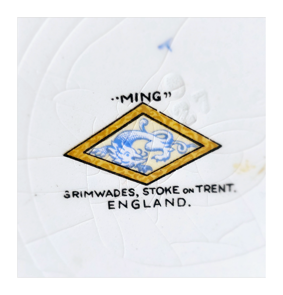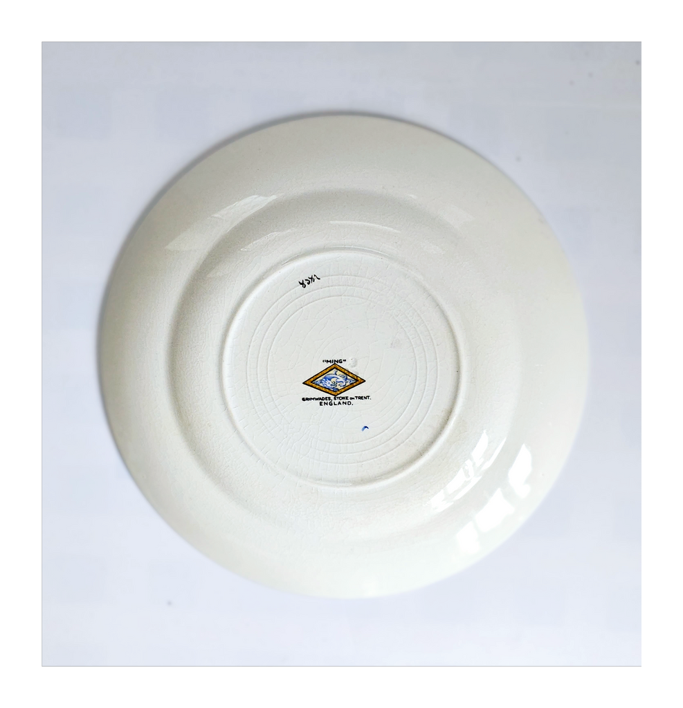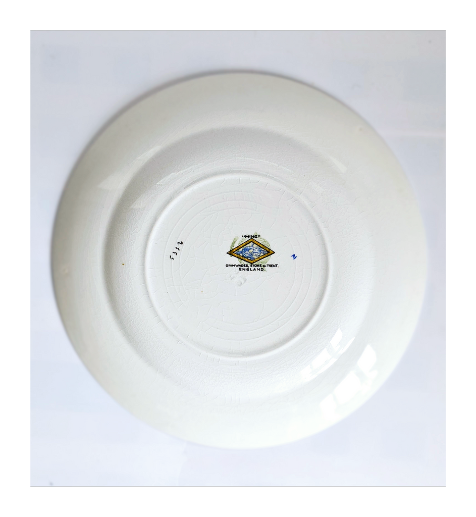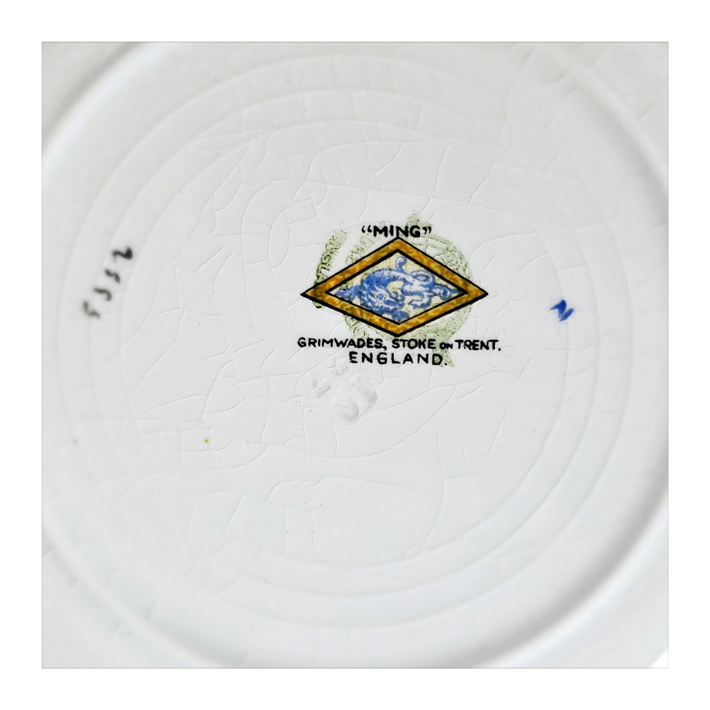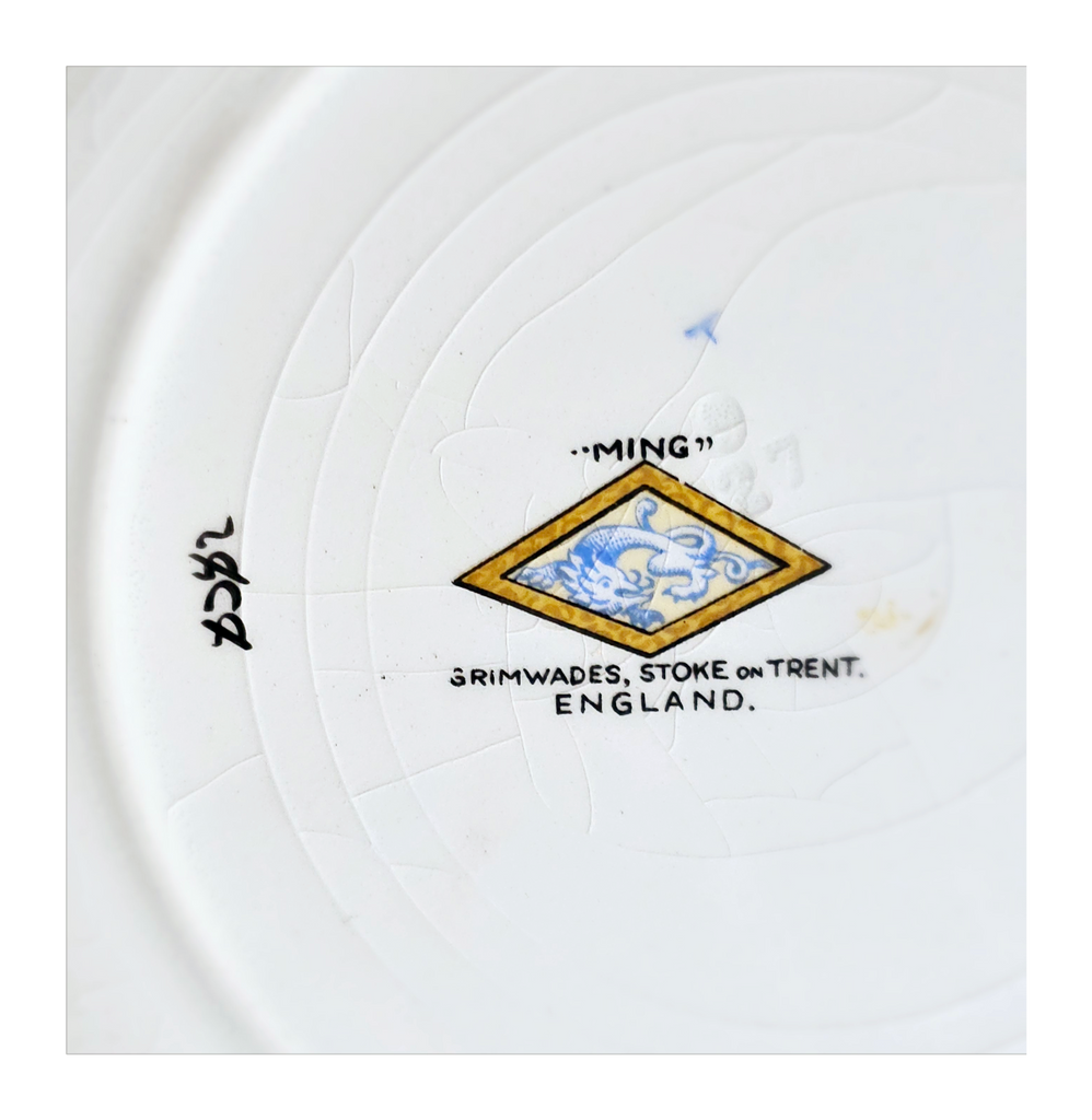 Antique 1930's Set of 5 Grimwades Stoke-On-Trent England "Ming" Serving Dishes / Dessert Plates. Each plate is decorated with blue dragons in the cream border with mustard yellow decoration at the edge and a gilt rim. Together they weigh 1495 g. Measurement of each plate is 20.7 cm diameter and 2 cm height. In overall good condition, but two plates have slight chips and all 5 plates have crazing as seen in the images and reflected in the price. A great addition to your Grimwades Pottery. Collectable. Collector's item.