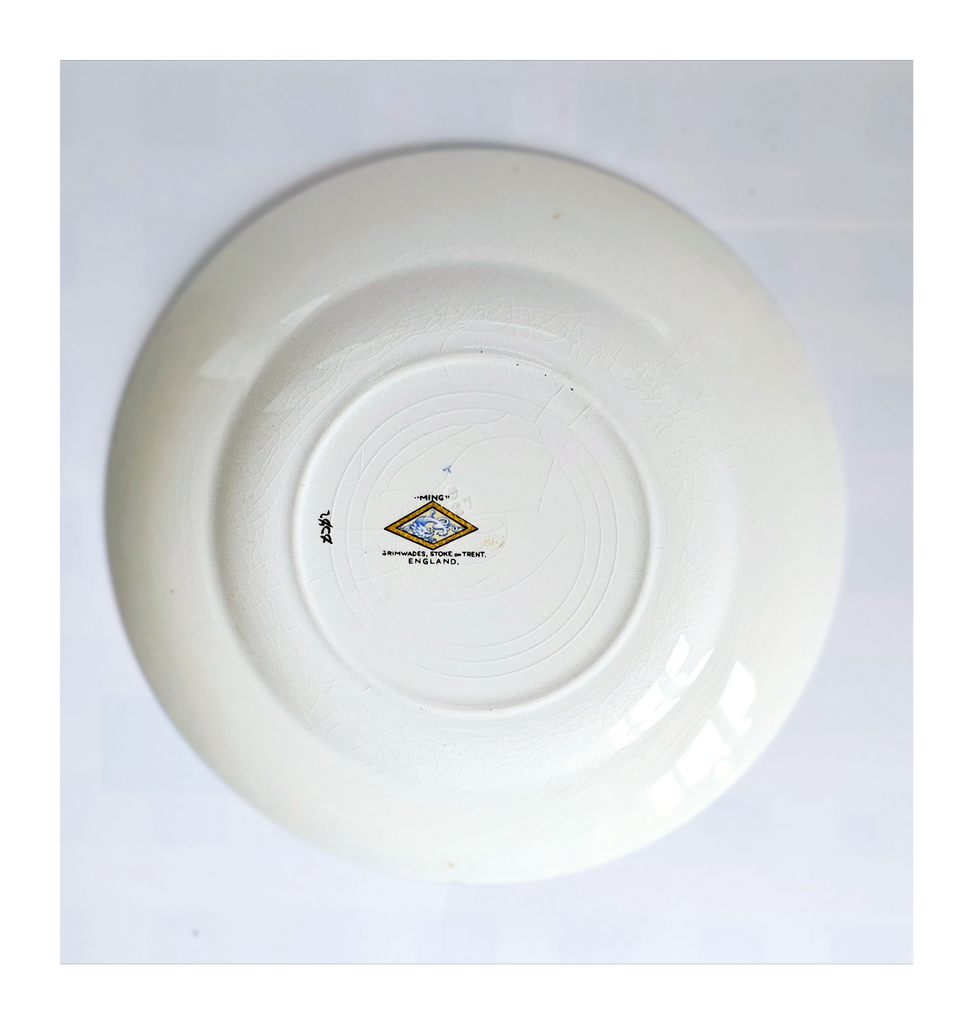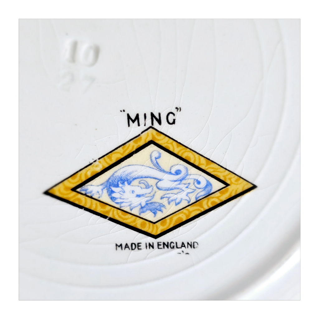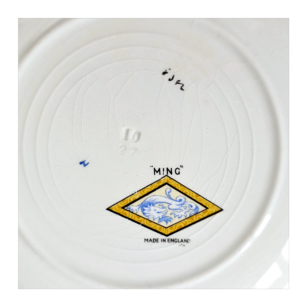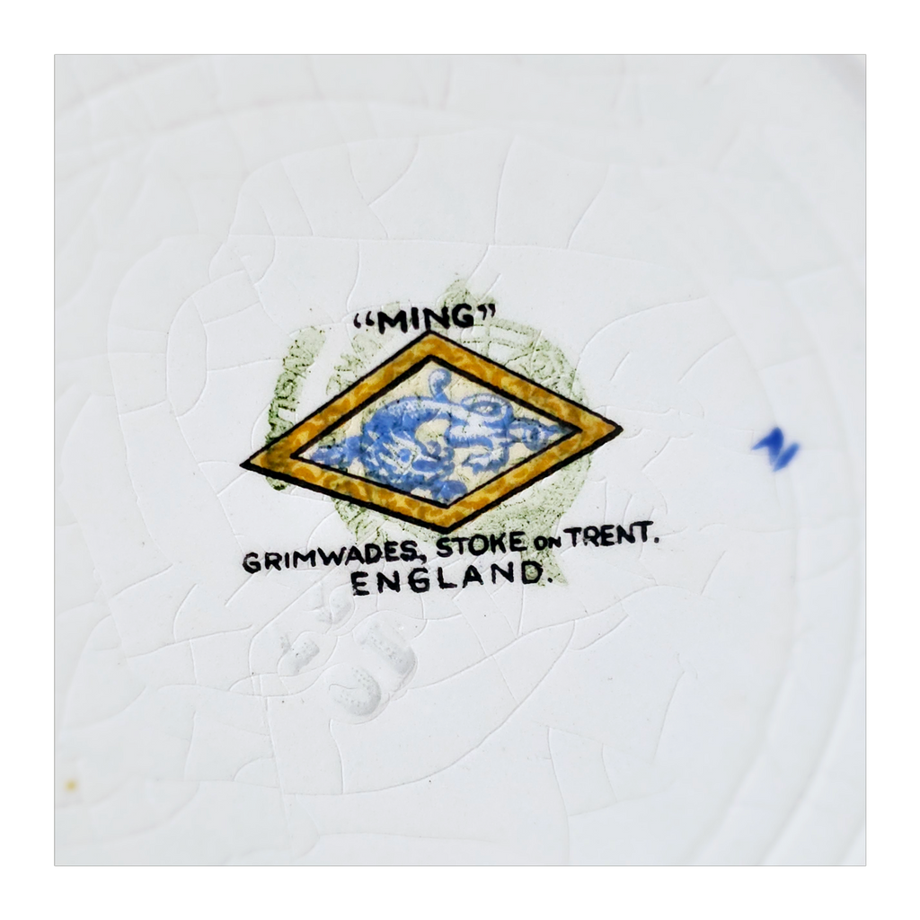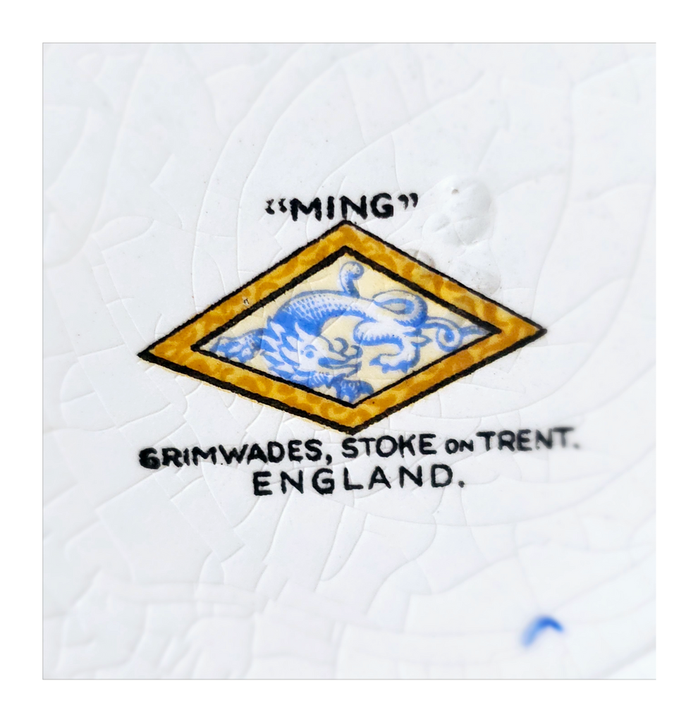 Antique 1930's Set of 5 Grimwades Stoke-On-Trent England "Ming" Serving Dishes / Dessert Plates. Each plate is decorated with blue dragons in the cream border with mustard yellow decoration at the edge and a gilt rim. Together they weigh 1495 g. Measurement of each plate is 20.7 cm diameter and 2 cm height. In overall good condition, but two plates have slight chips and all 5 plates have crazing as seen in the images and reflected in the price. A great addition to your Grimwades Pottery. Collectable. Collector's item.
