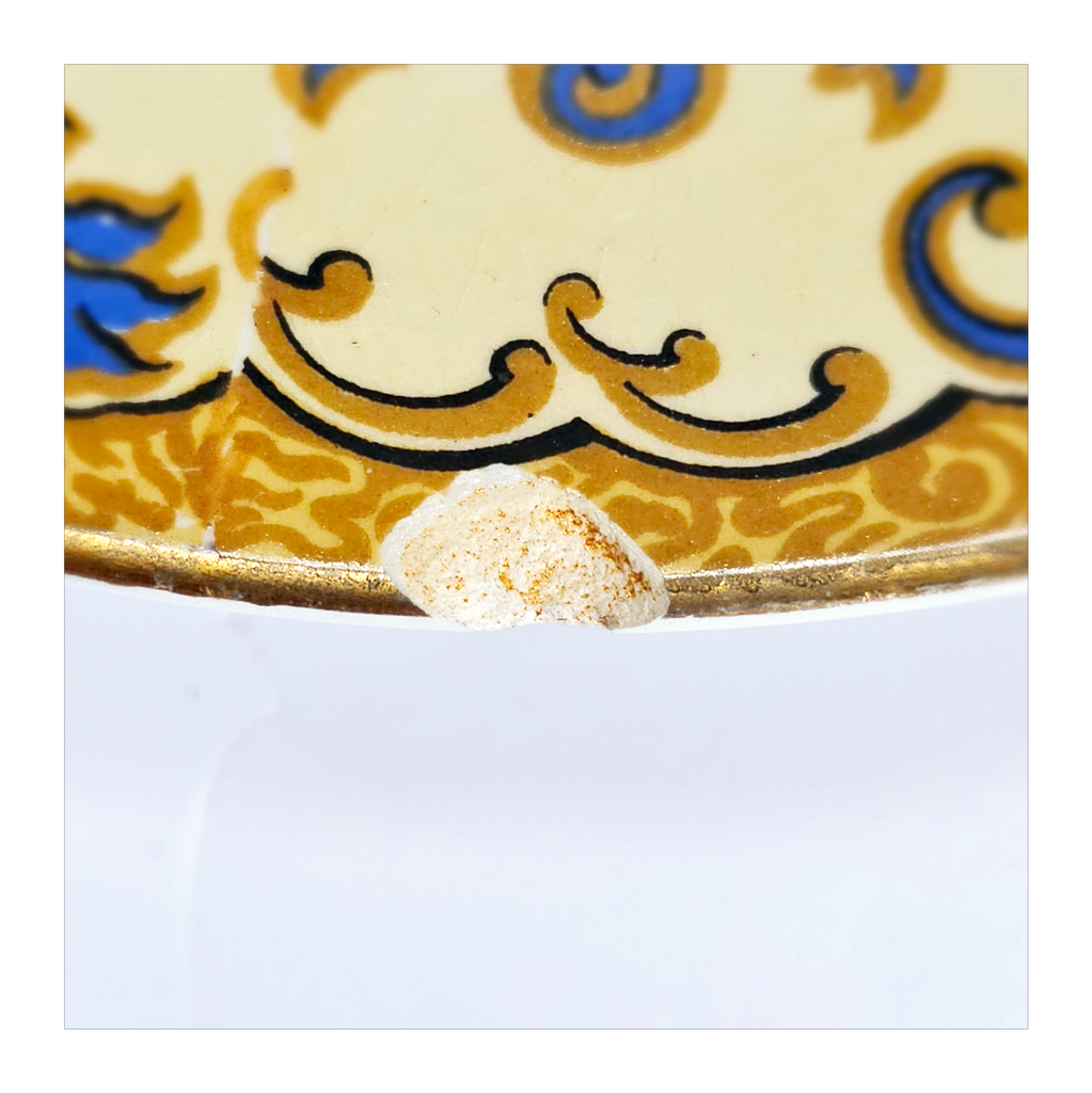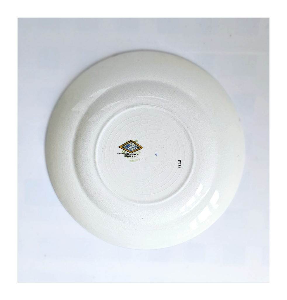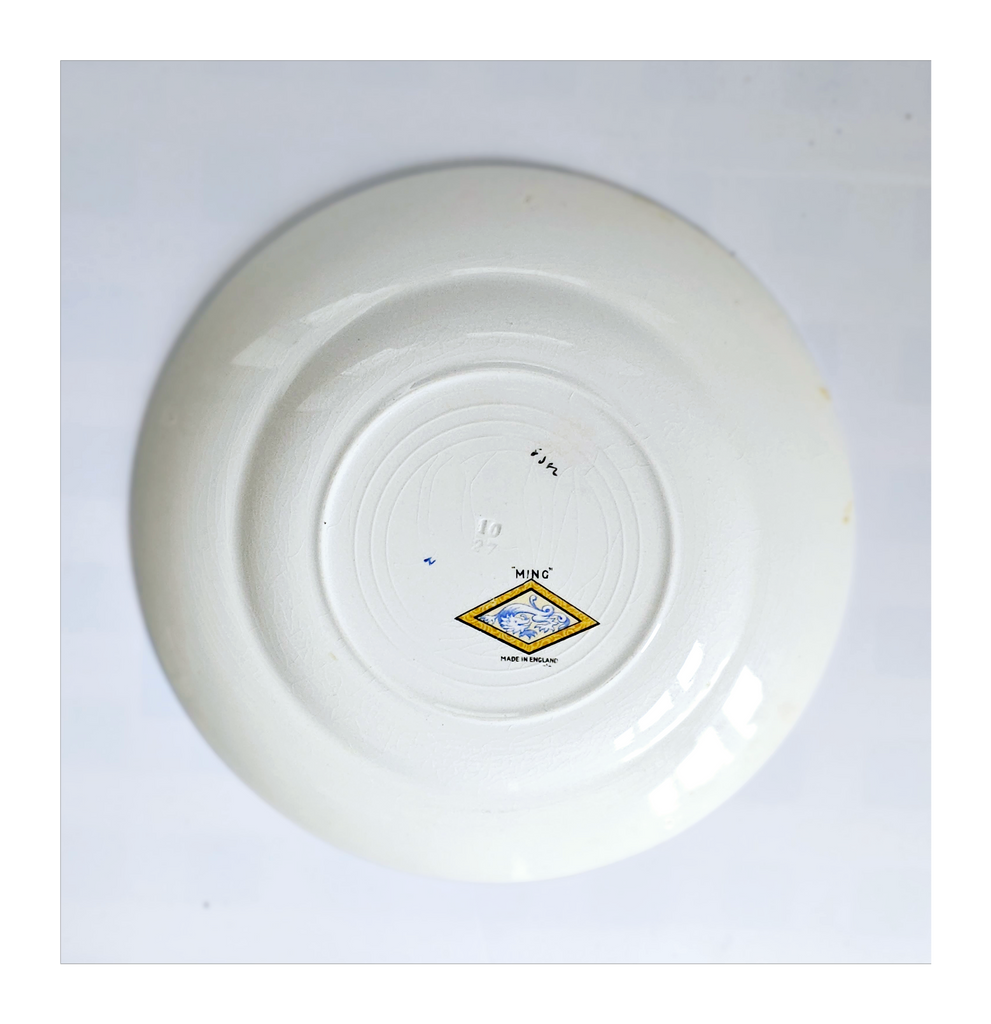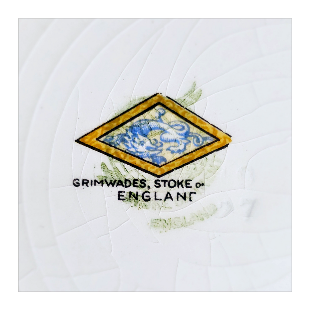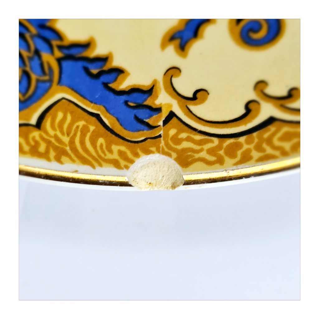 Antique 1930's Set of 5 Grimwades Stoke-On-Trent England "Ming" Serving Dishes / Dessert Plates. Each plate is decorated with blue dragons in the cream border with mustard yellow decoration at the edge and a gilt rim. Together they weigh 1495 g. Measurement of each plate is 20.7 cm diameter and 2 cm height. In overall good condition, but two plates have slight chips and all 5 plates have crazing as seen in the images and reflected in the price. A great addition to your Grimwades Pottery. Collectable. Collector's item.