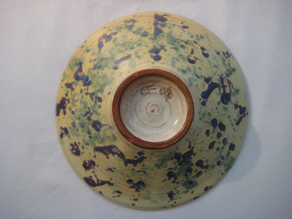 Contemporary Design Ceramic Bowl in yellow with blue and green pattens all around, signed by the artist as CF 98