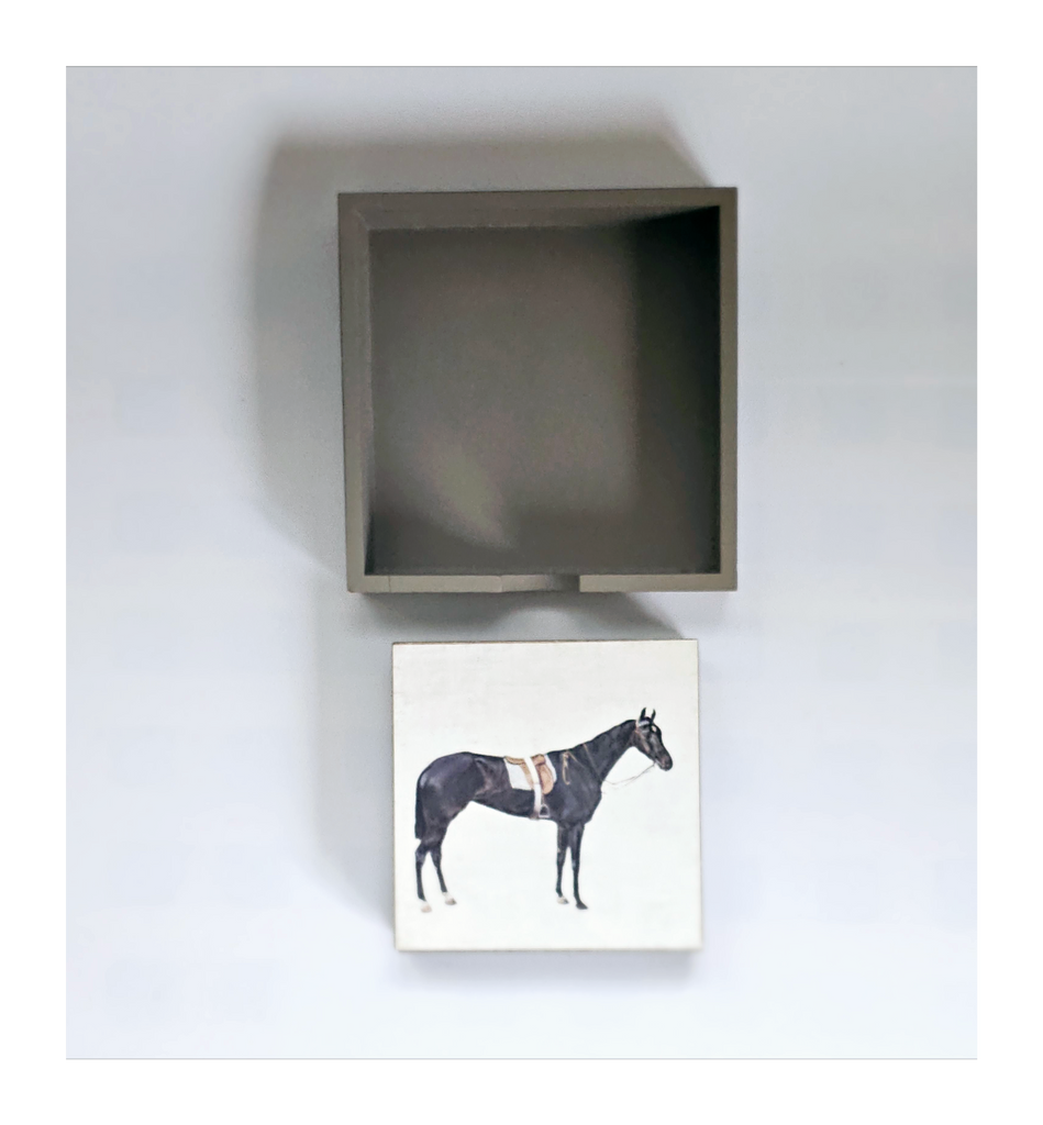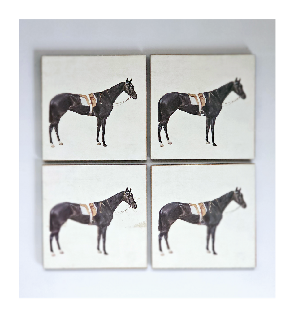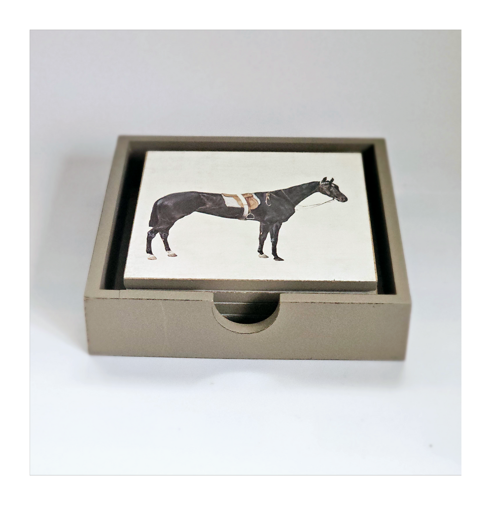 4 Contemporary Design Wooden Art Tiles / Coasters in a wooden Coaster box, each displaying an elegant racing horse. Together they weigh 257 g. Measurement of each art tile / coaster is 10 by 10 cm. The measurement of the coaster box is 12.5 by 12.5 cm and 3 cm height. They are in overall good condition. A great addition to your Art Tile / Coaster collection. Collectable. Collectors' item.