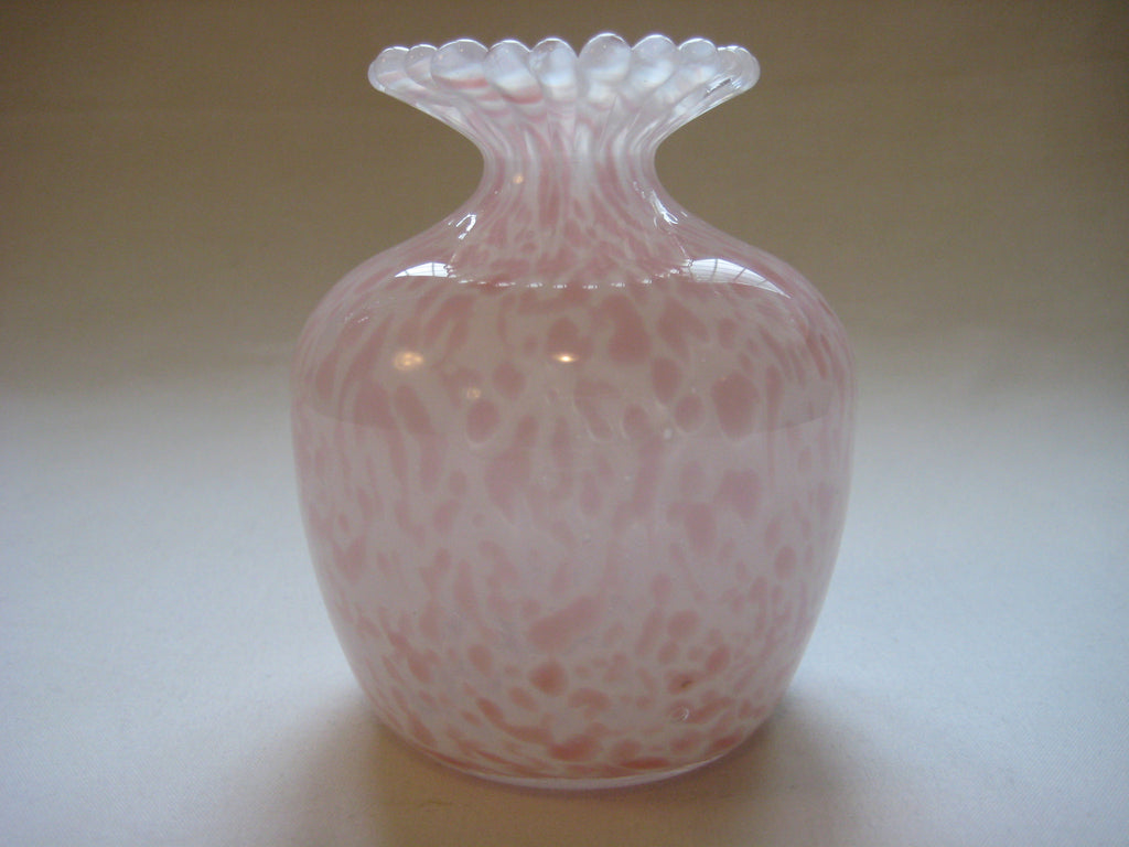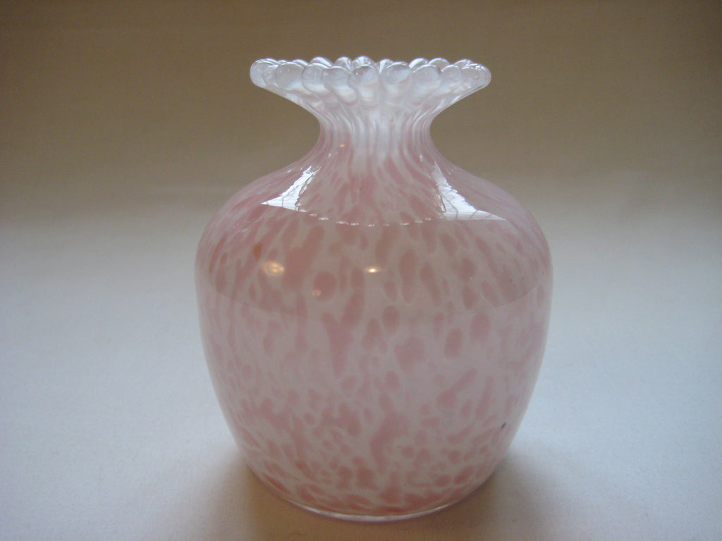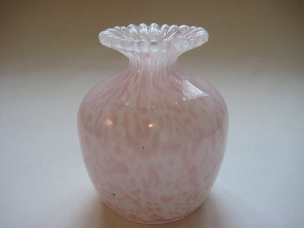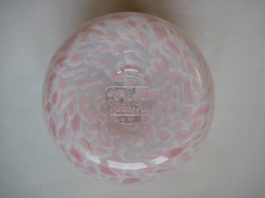 A beautiful vintage Guernsey Studio Glass vase in shades of pink and white. There is a three lions seal at the bottom. It weighs 0.39 kg, its height is 10 cm, its diameter is 8 cm at its widest.