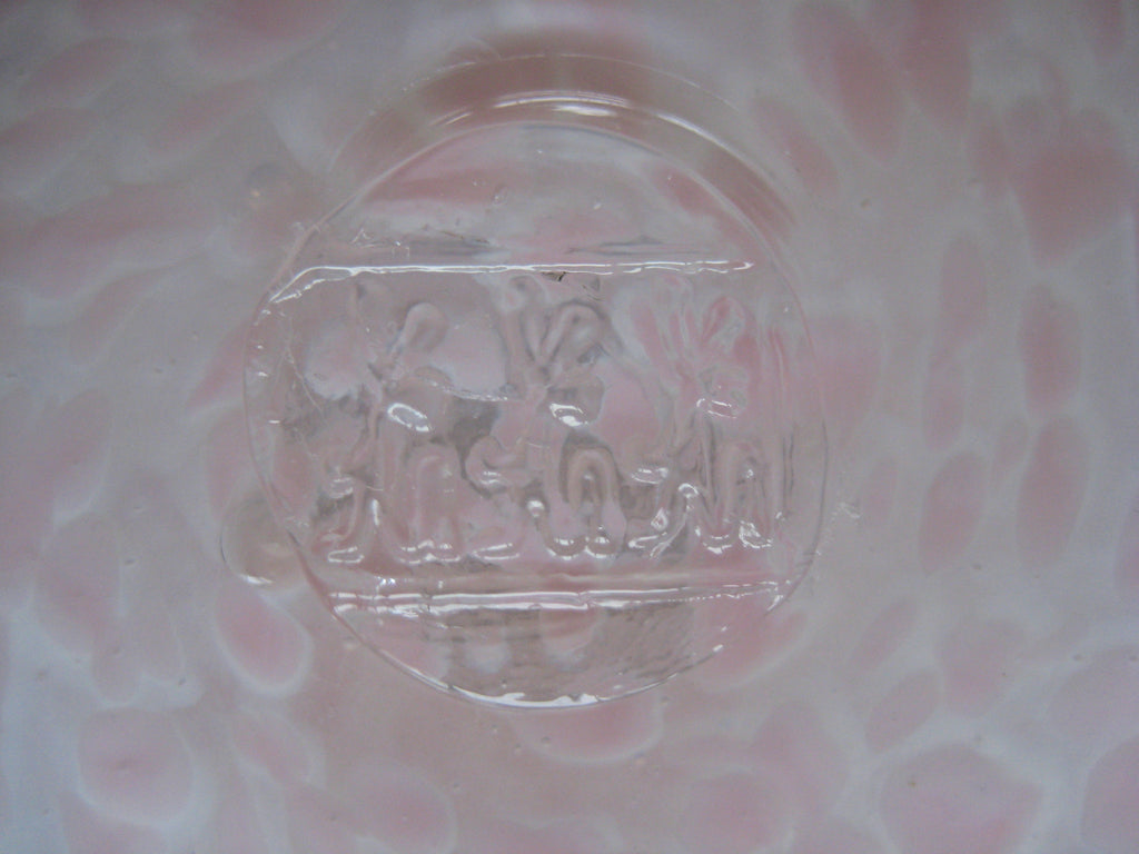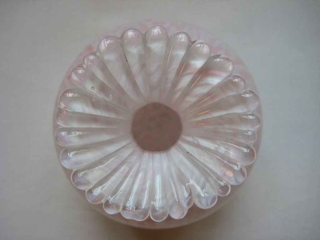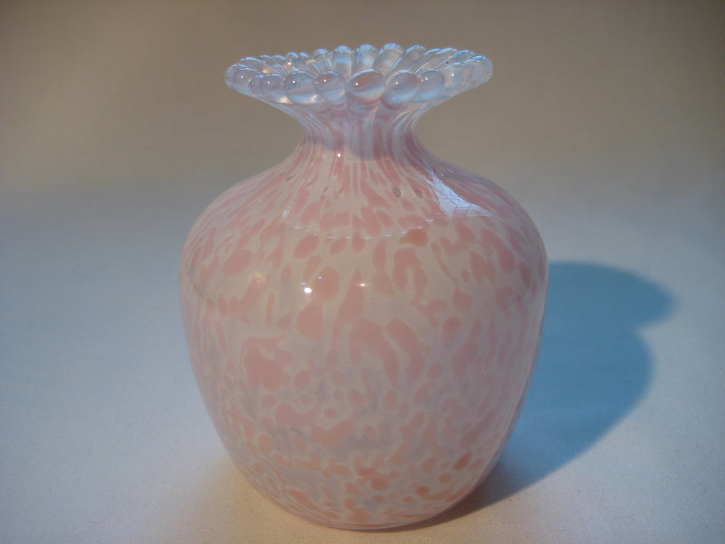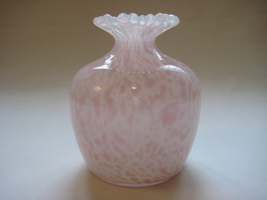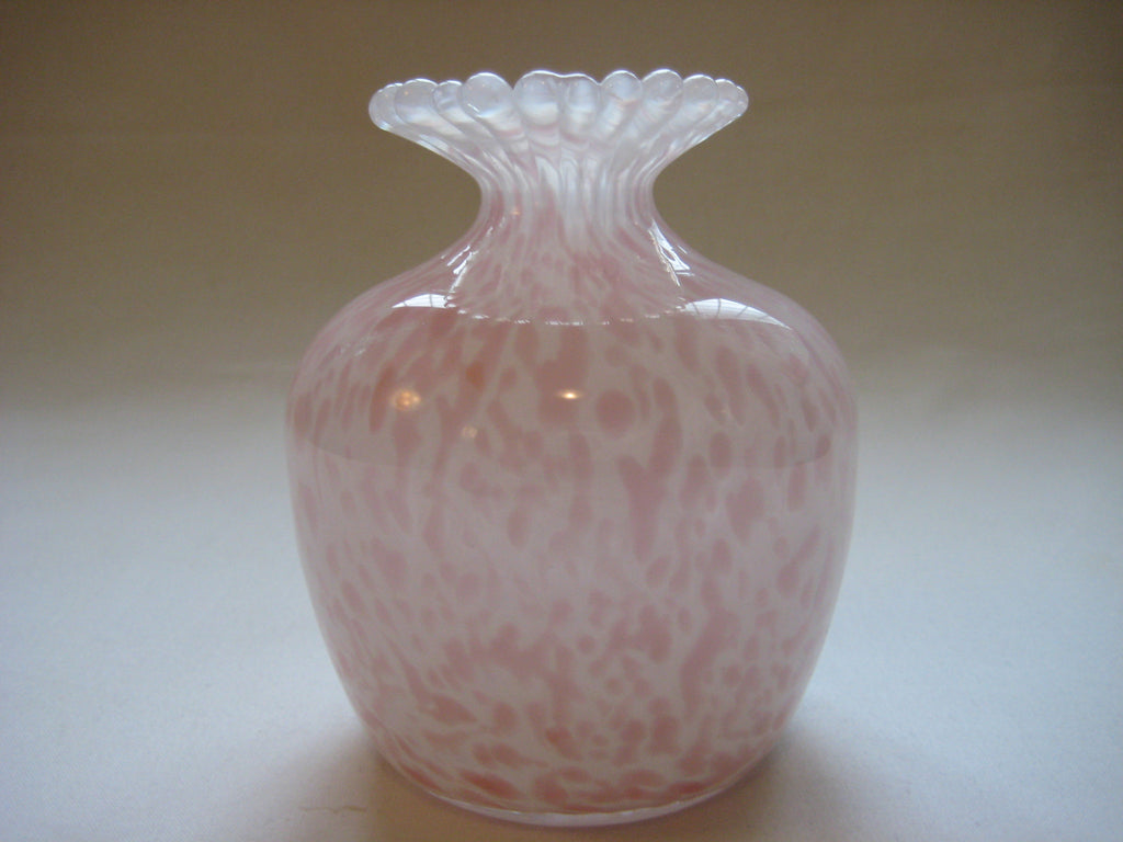 A beautiful vintage Guernsey Studio Glass vase in shades of pink and white. There is a three lions seal at the bottom. It weighs 0.39 kg, its height is 10 cm, its diameter is 8 cm at its widest.