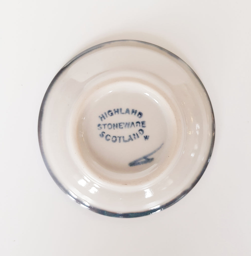 Highland Stoneware Pottery Hand Painted Rural Scene Pin Dish signed by the artist. A perfect addition to your pin dish collection. It weighs 0.1 kg. Its measurements are Height 2 cm, Diameter 10.5 cm. In perfect condition, no cracks, no chipping. Collectable. Collectors' item.