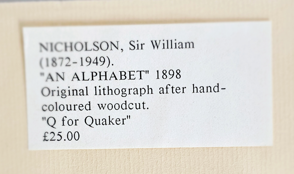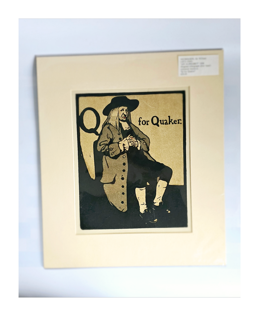Q for Quaker, 1898 from the Alphabet Series by Sir William Nicholson, Original Lithograph after Hand Coloured Woodcut. It weighs 193 g. Its measurements in the frame are 38 cm height and 33 cm width. In excellent condition. A great addition to your original Lithograph Prints Collection. Collectable. Collector's item.