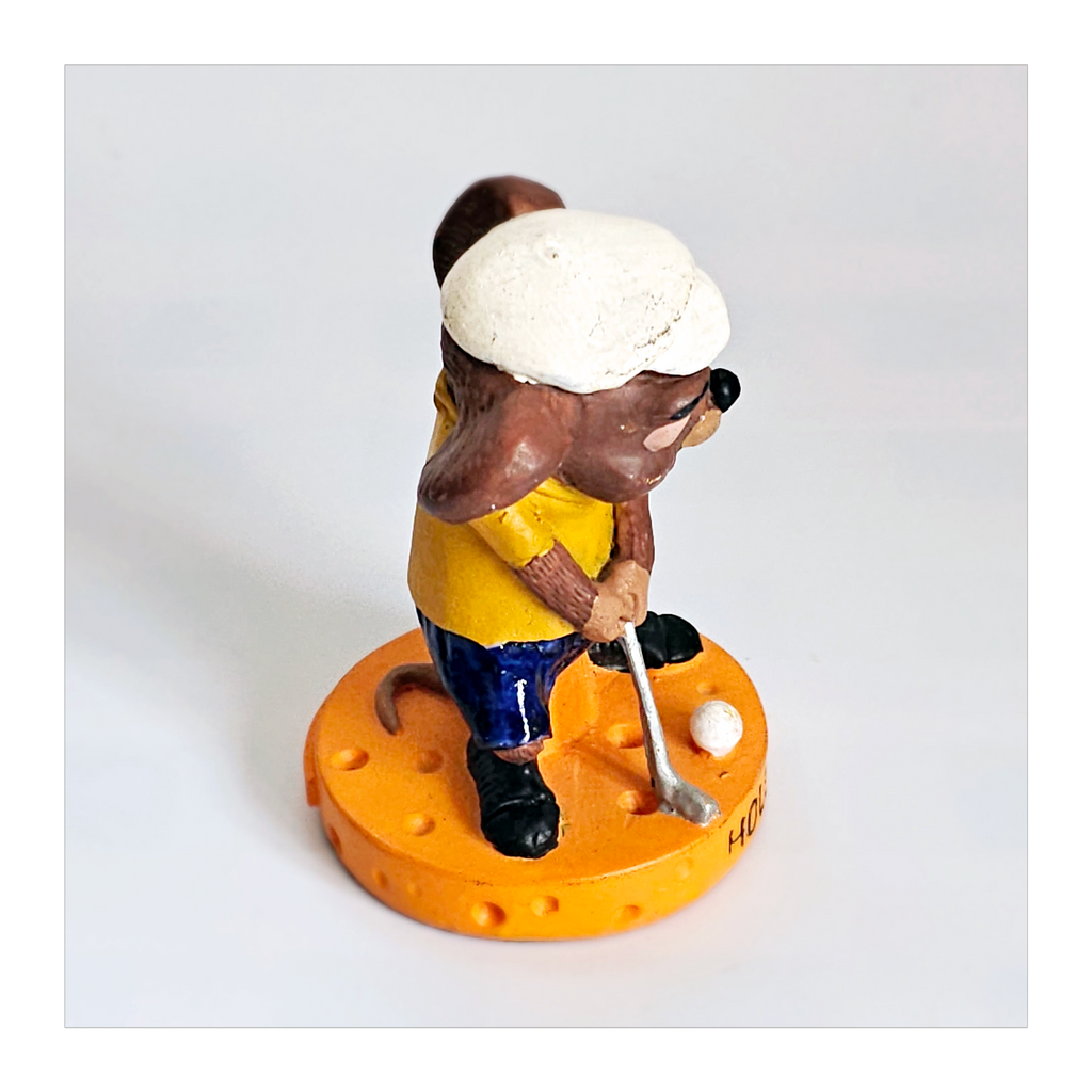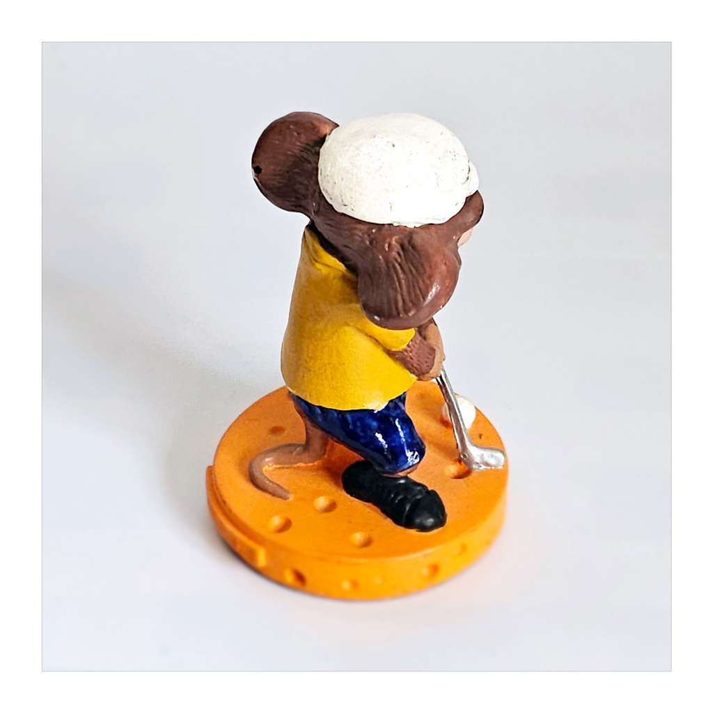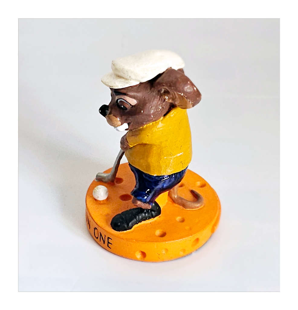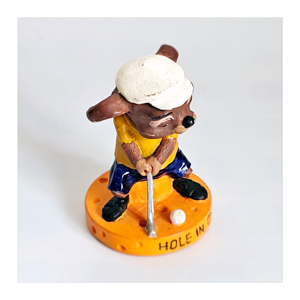 A rare golf themed ceramic mouse figurine Cheese Chasers N&T Productions 2002 - Distributed by Widdop Bingham. It weighs 112 g.