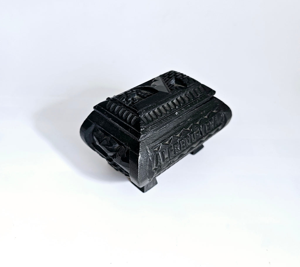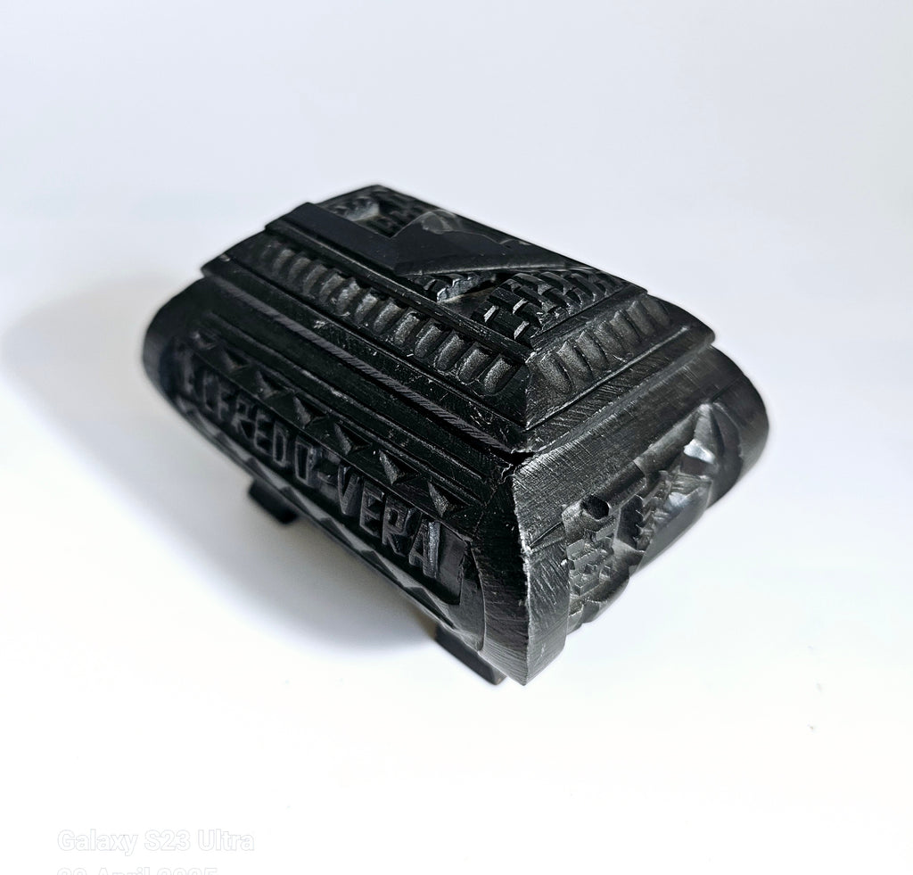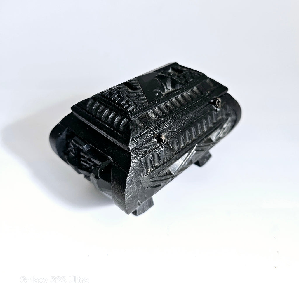 A rare vintage1950's Aztec or Mayan-inspired carved black stone miniature trinket box by the distinguished potter, Alfredo Vera, known for his work in the Barro negro tradition of pottery. In excellent condition, no chips, no cracks and no restoration. It weighs 280g, it measures 9cm width, 6cm depth, and 5.5cm height. A great addition to your Trinket Box / Jewellery Box or Mexican Art & Craft collection. Collectible, Collector's item.