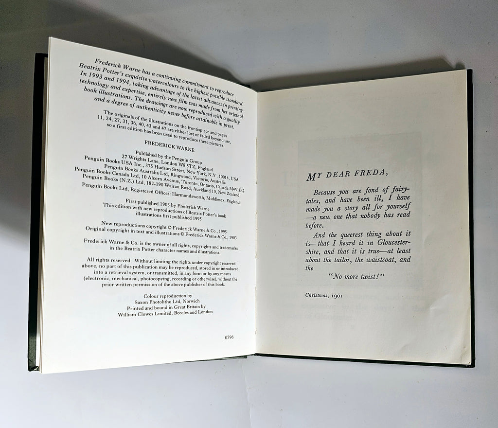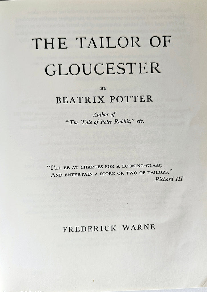 A vintage 1995 BEATRIX POTTER 'The Tailor of Gloucester', Frederick Warne & Co. It weighs 88g. Its measurements are 11cm width, 14.4cm length, and 0.5cm depth. In excellent condition. A great addition to your Beatrix Potter collection. Collectible. Collector's item.