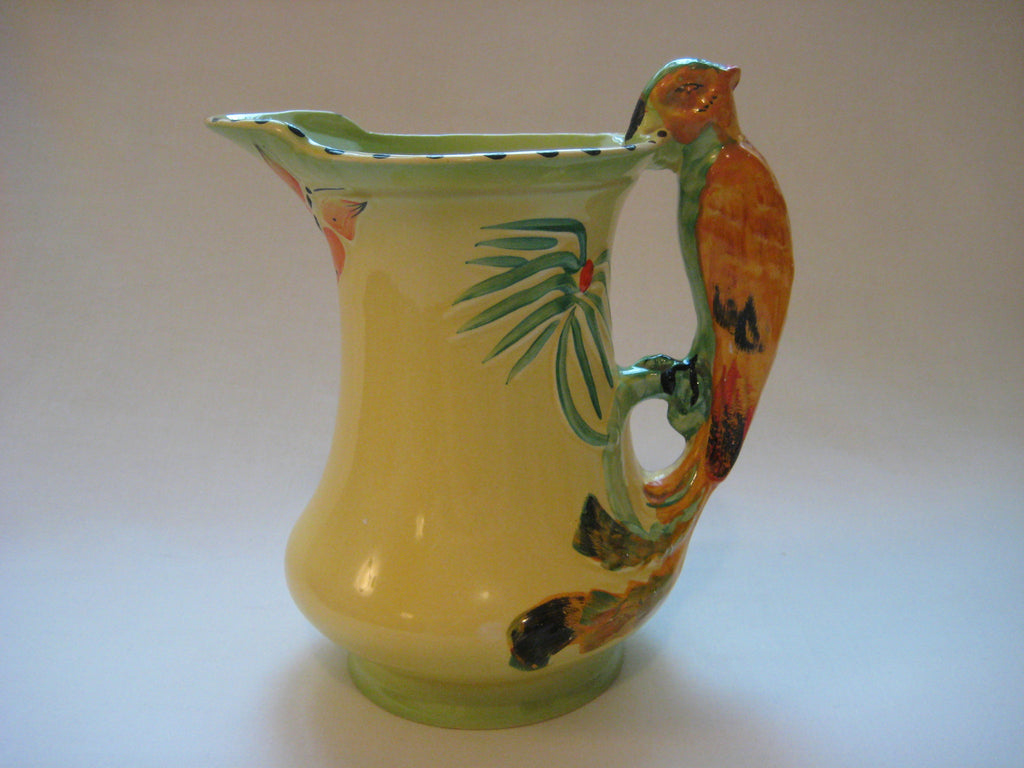 A stunning Art Deco 1940's Burgess & Leigh parrot jug designed by Ernest Bailey. It weighs 0.73 kg. Its height is 18.5 cm, its diameter is 13 cm at its widest point. The jug is in excellent condition. The mark on the base is "Burleigh Ware" and "Burgess & Leigh" over the Bee Hive Trade Mark with "EST" and "1851" on either side and "BURSLEM ENGLAND" underneath. In addition there is a hand written "6935". Collector's item.