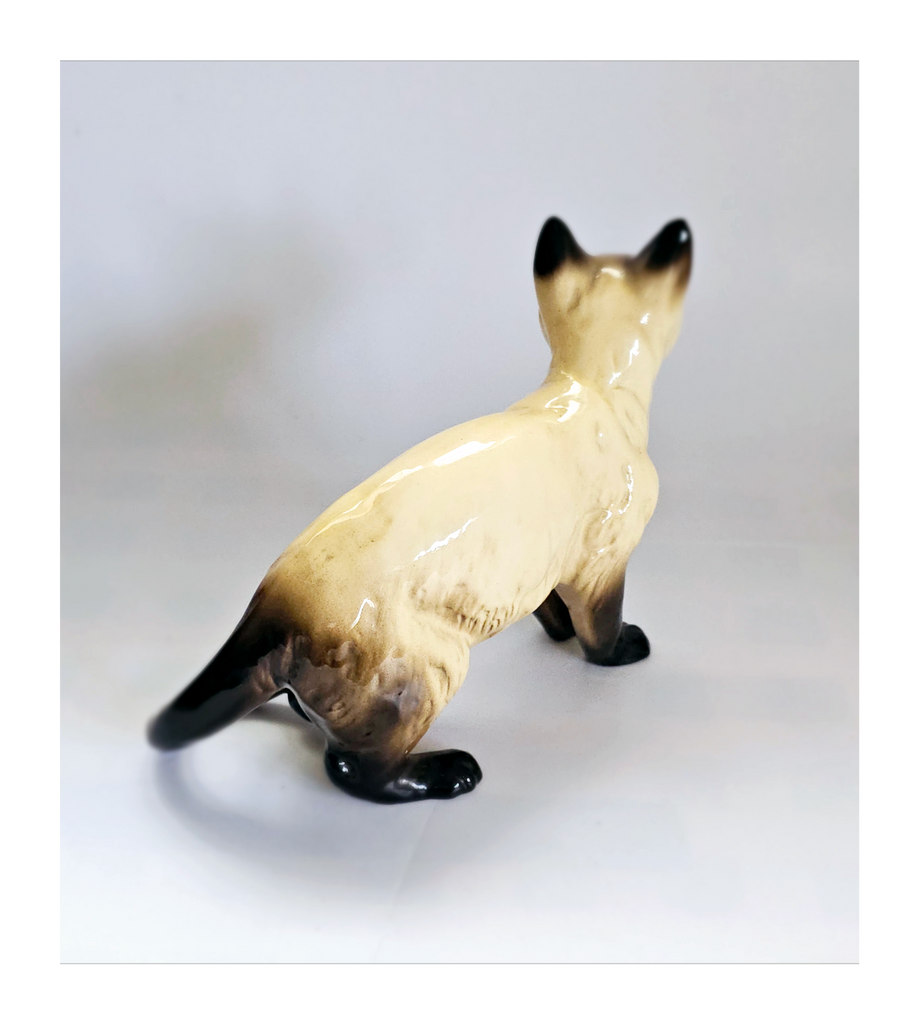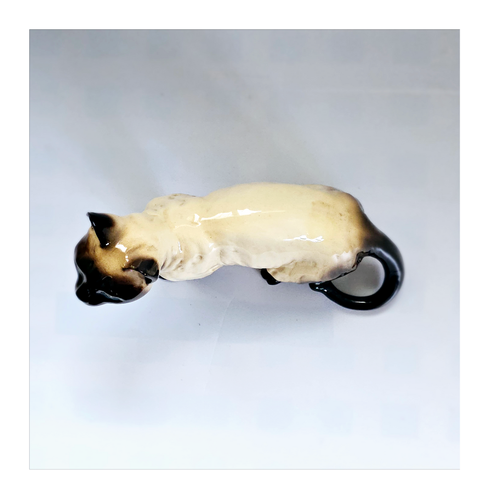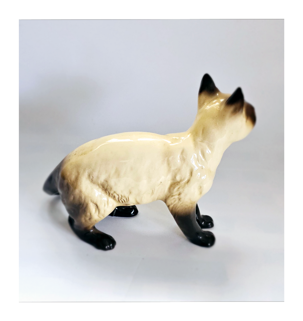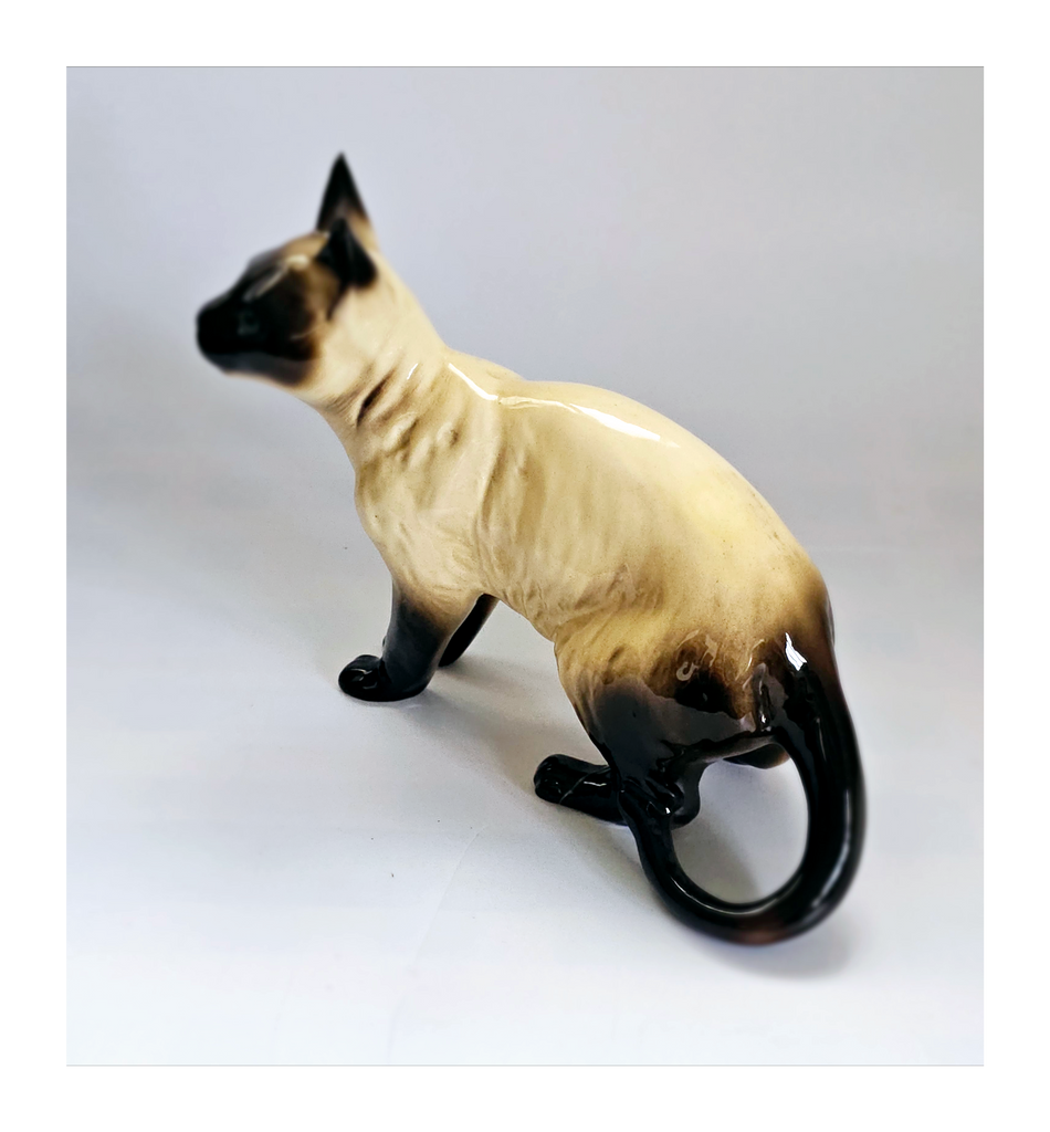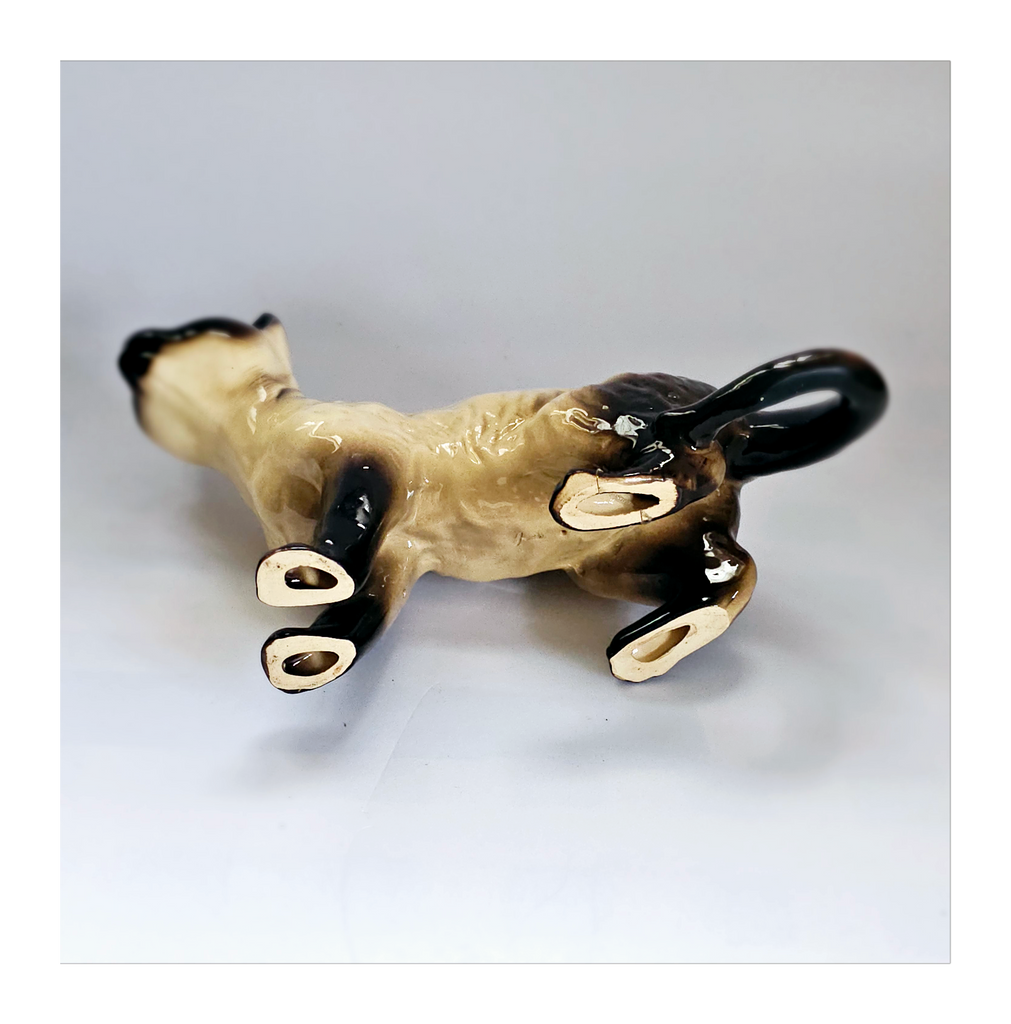 A vintage 1970's Coopercraft ceramic Siamese cat figurine. It weighs 256 g. Its measurements are 19 cm length, 5.5 cm width and 14.2 cm Height. In a very good condition, no chips, no cracks, but one small restoration to the left back paw as seen in the image and reflected in the price. A great addition to your cat figurine collection. Collectable. Collector's item.