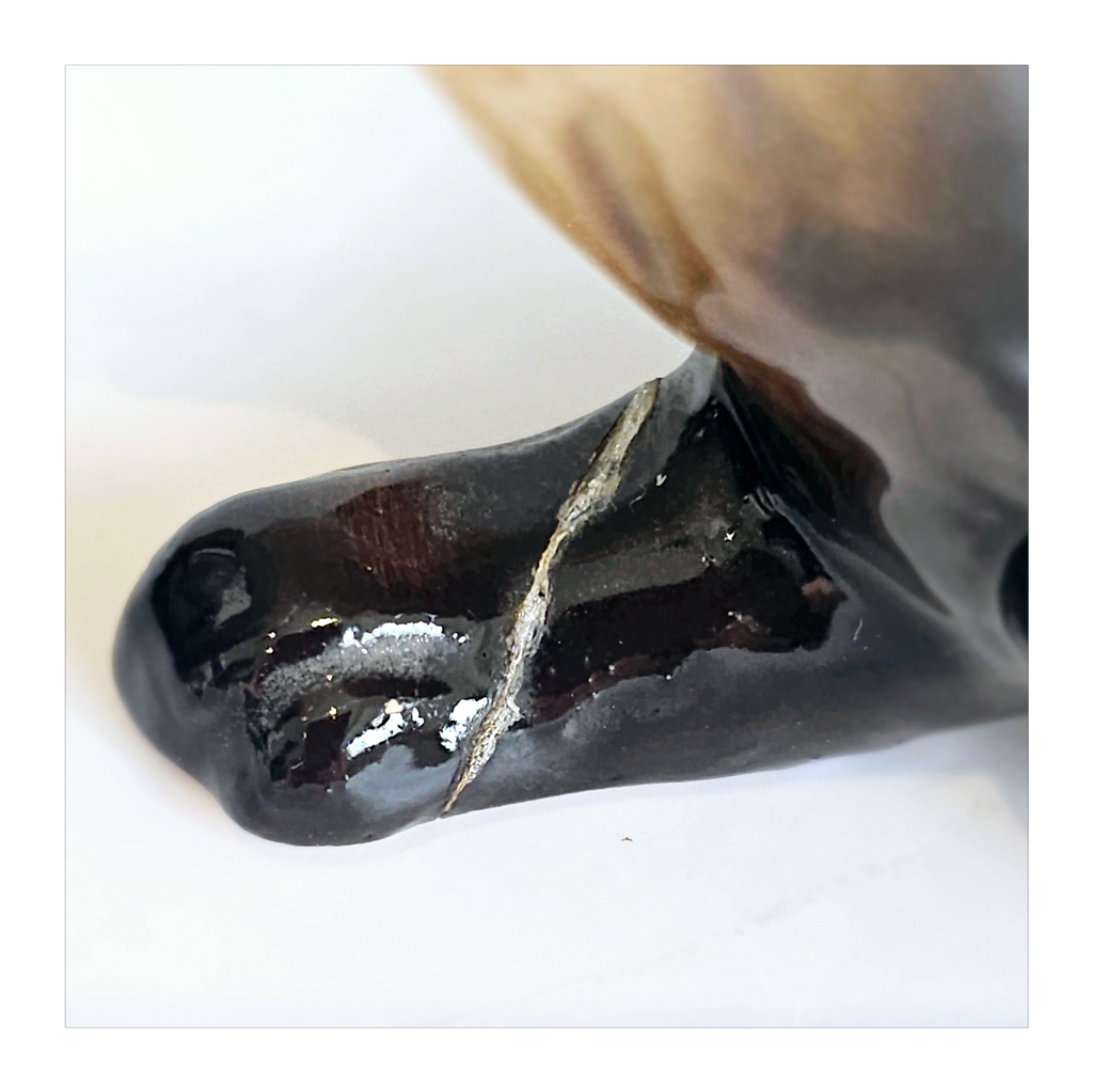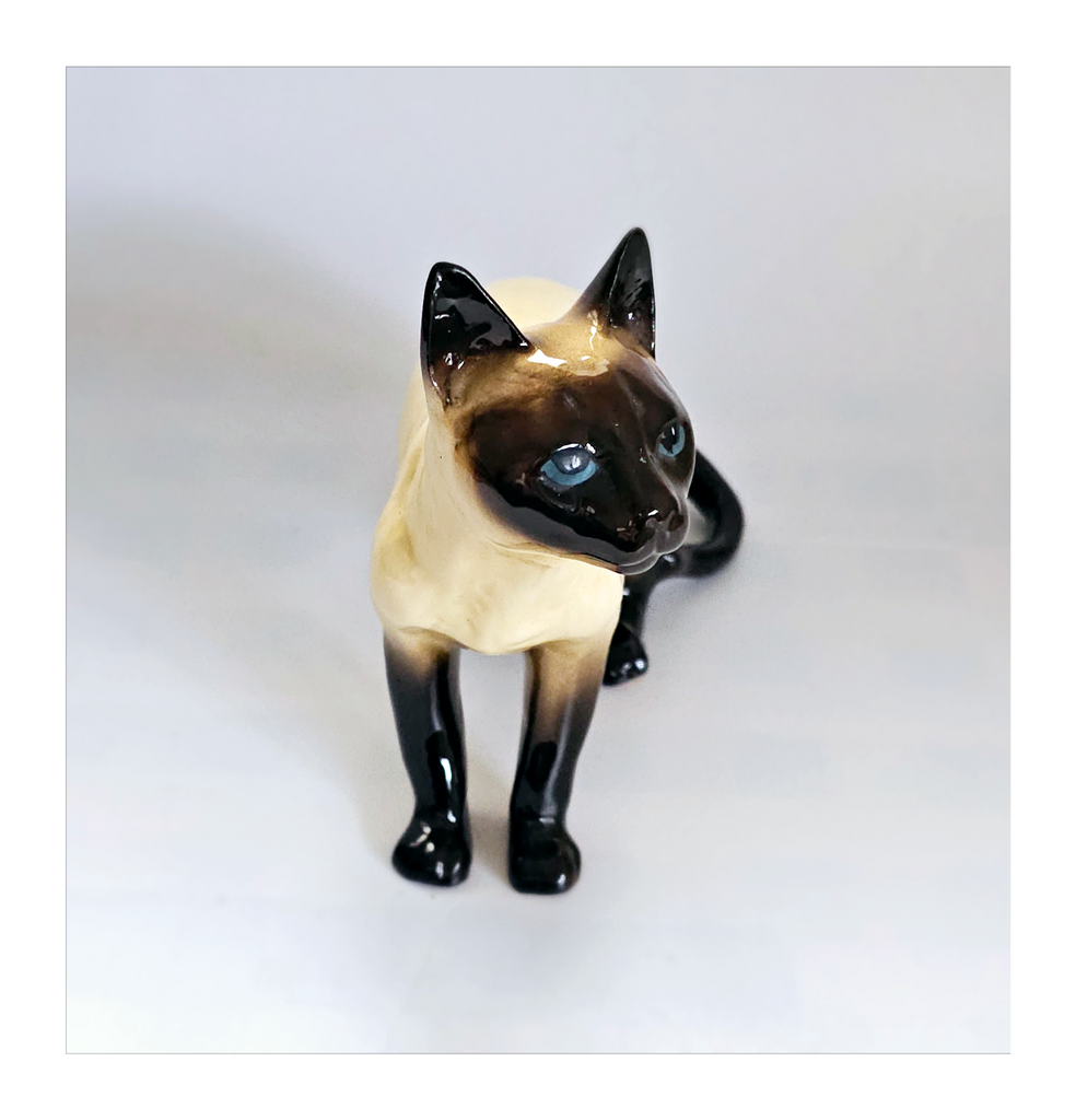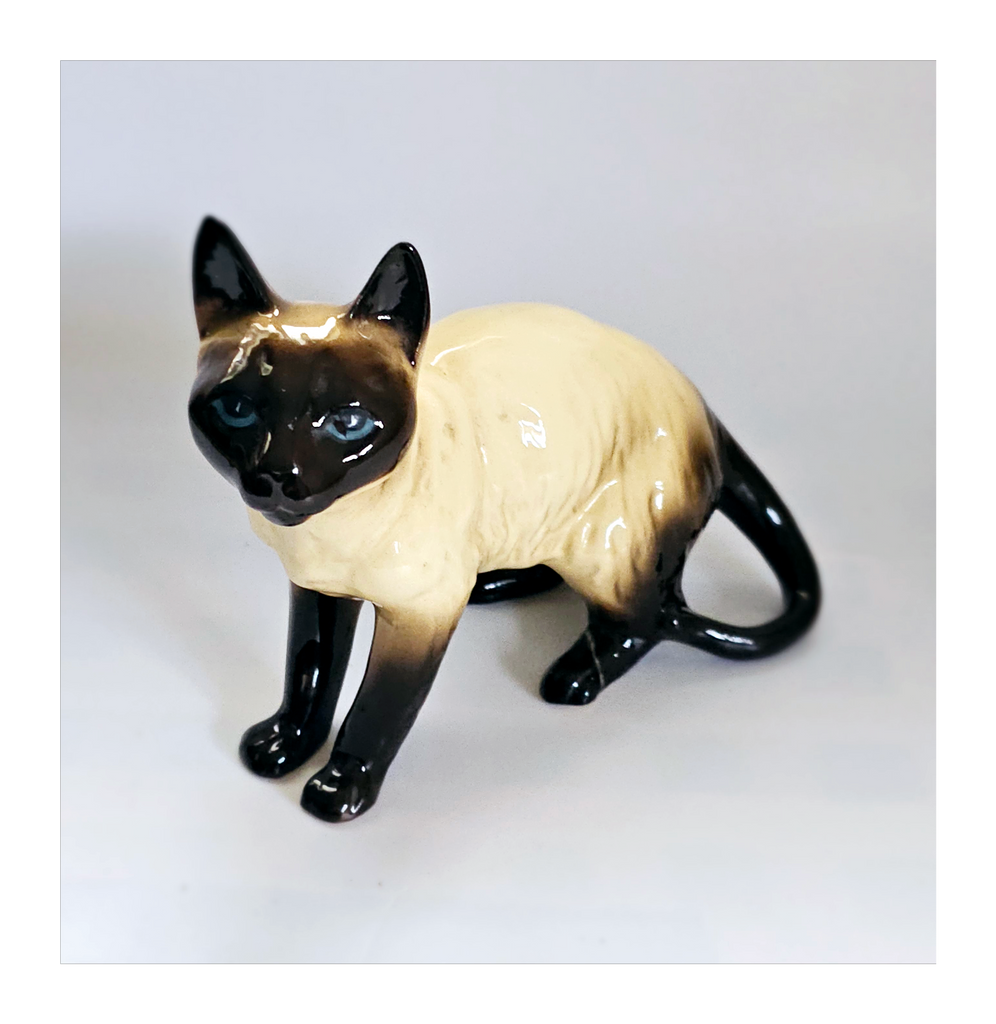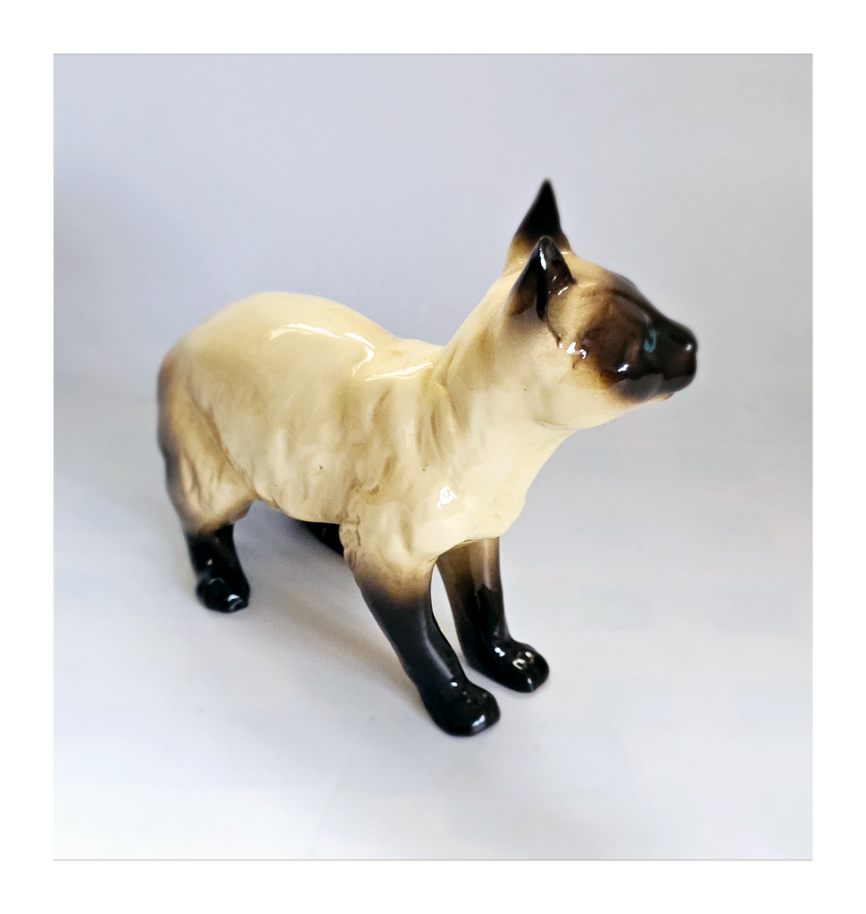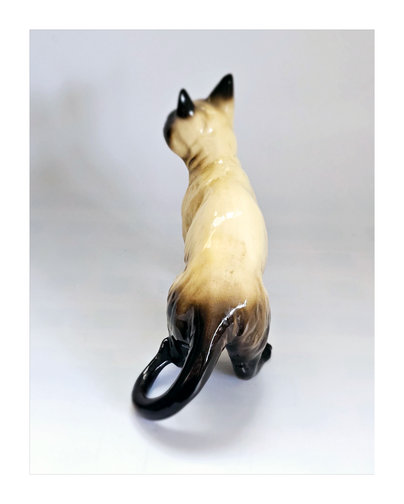 A vintage 1970's Coopercraft ceramic Siamese cat figurine. It weighs 256 g. Its measurements are 19 cm length, 5.5 cm width and 14.2 cm Height. In a very good condition, no chips, no cracks, but one small restoration to the left back paw as seen in the image and reflected in the price. A great addition to your cat figurine collection. Collectable. Collector's item.