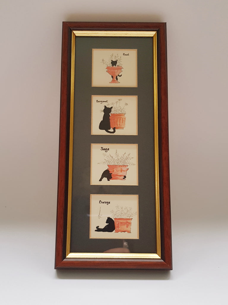 Etched Elegance print of Cat Silhouette with herb pots signed by the artist