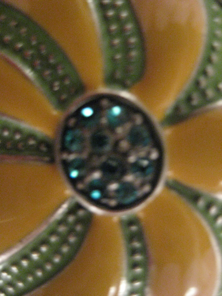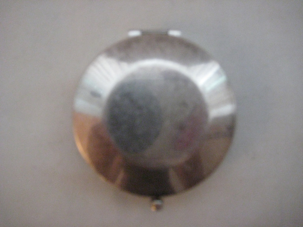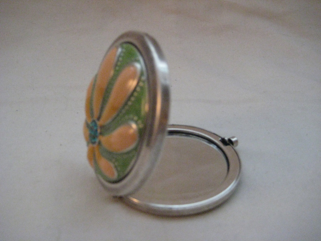 A very beautiful Victorian compact mirror made of bronze on one side, and enamel and blue diamond studs on the other side in the shape of a flower. It weighs 0.09 kg and Its diameter is 6 cm. Collectors item.