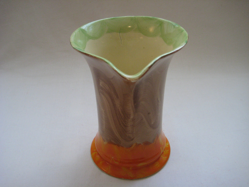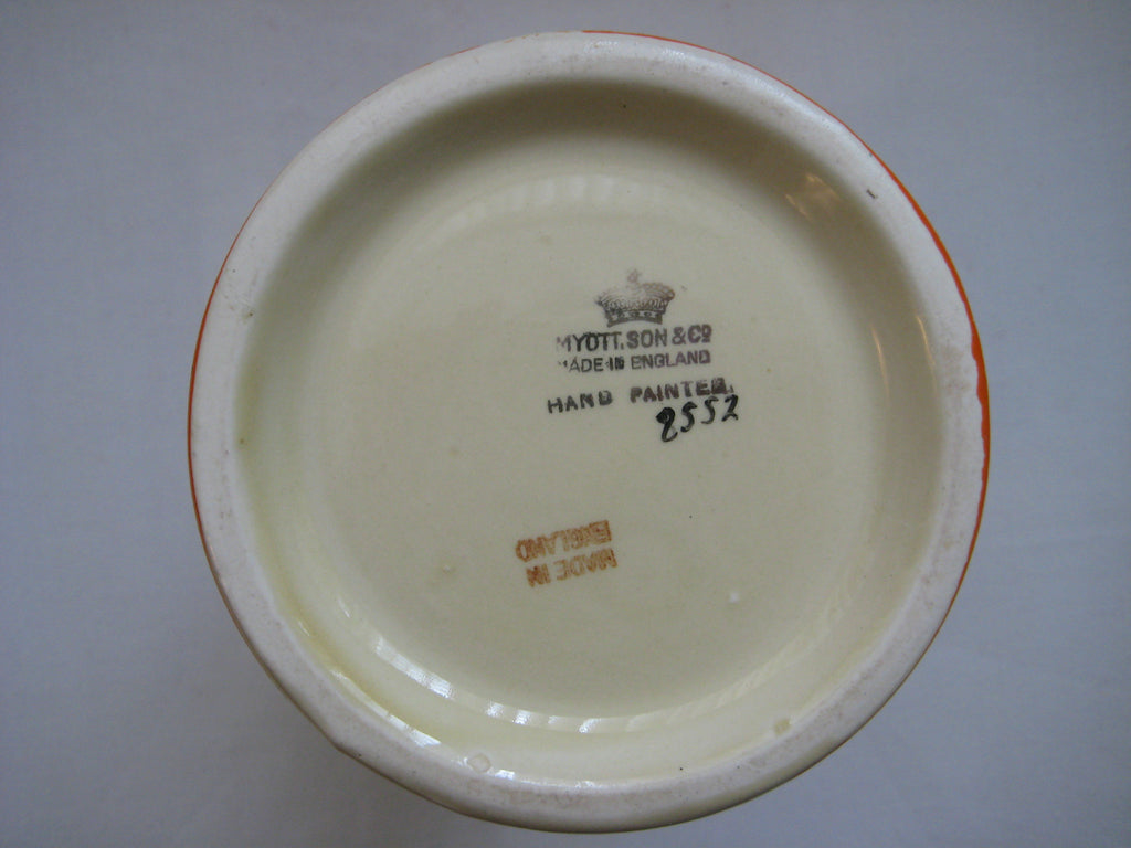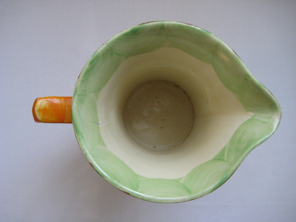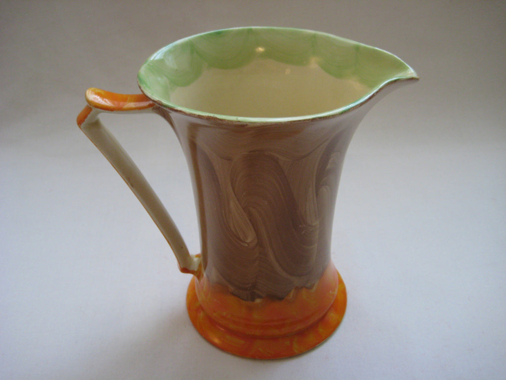 A vintage 1930's Art Deco Myott, Son & Co hand painted ceramic jug in orange, brown and green colours. It weighs 0.49 kg. Its size is 16 cm H, 18 cm W, 12 cm D at its widest. It is in a very good condition. There is a tiny hairline in the inside rim of the jug as seen in the picture. Collectable. Collectors' Item.