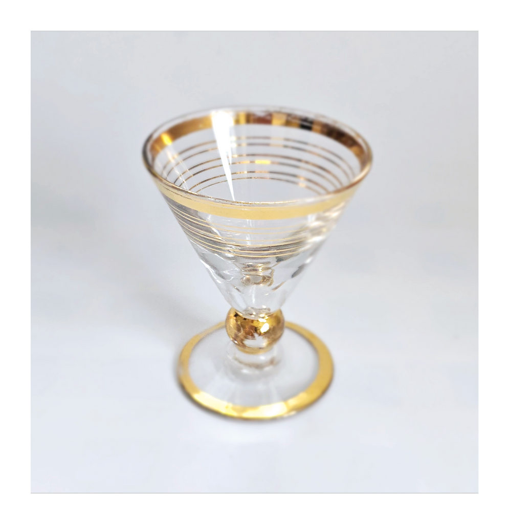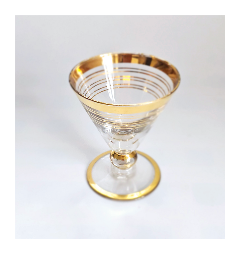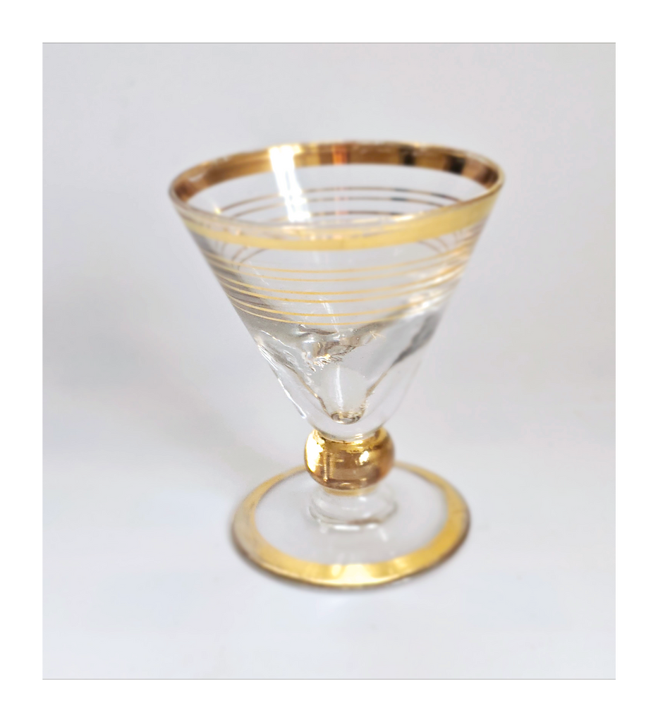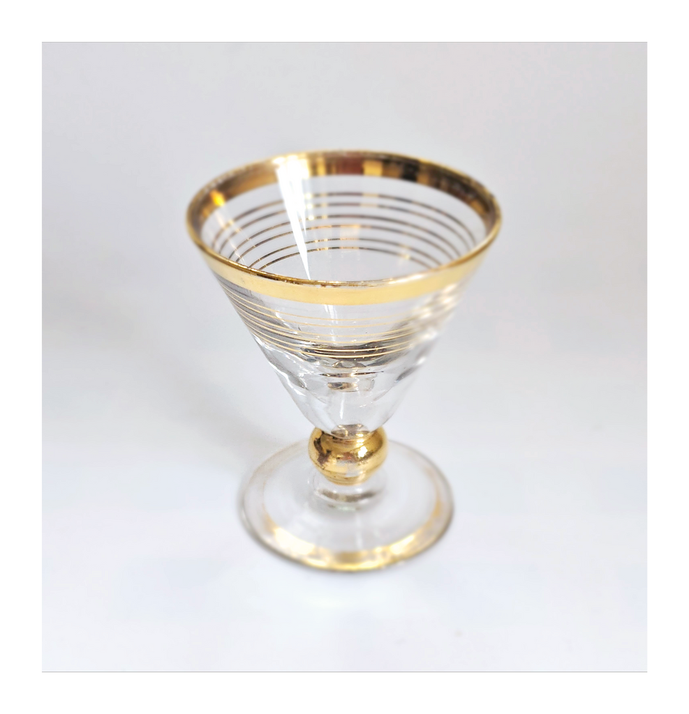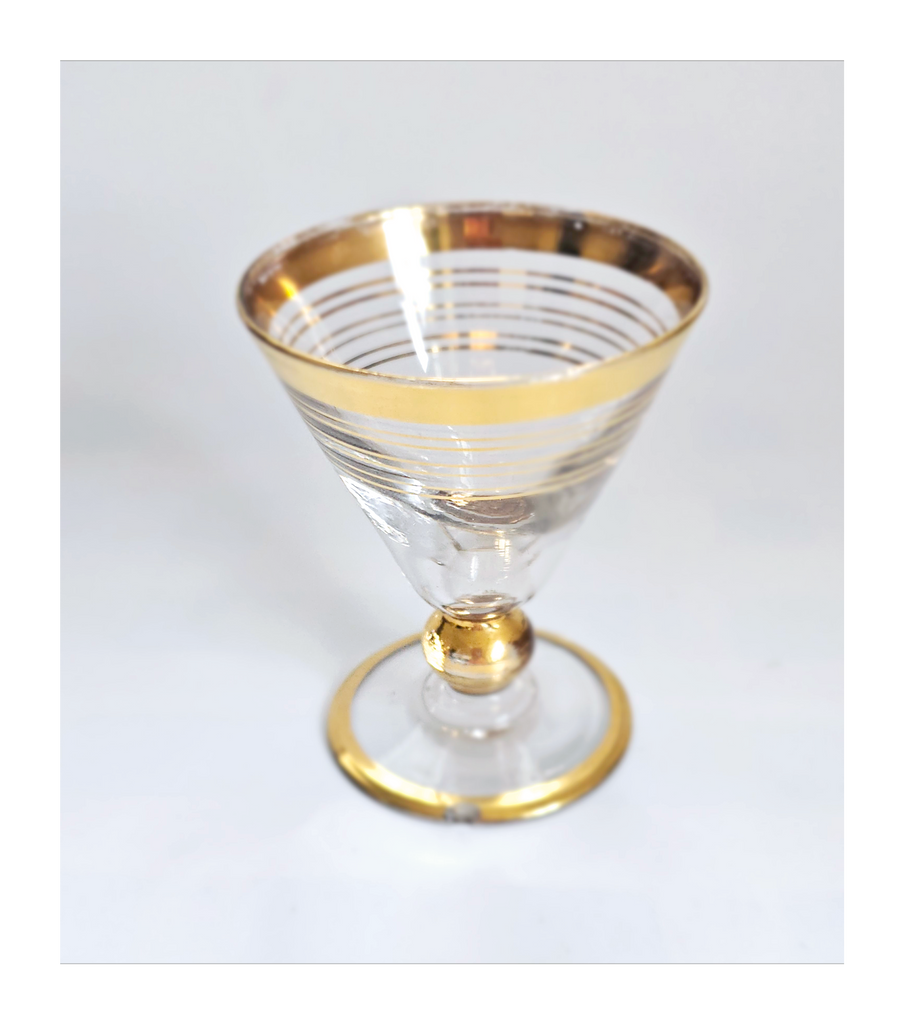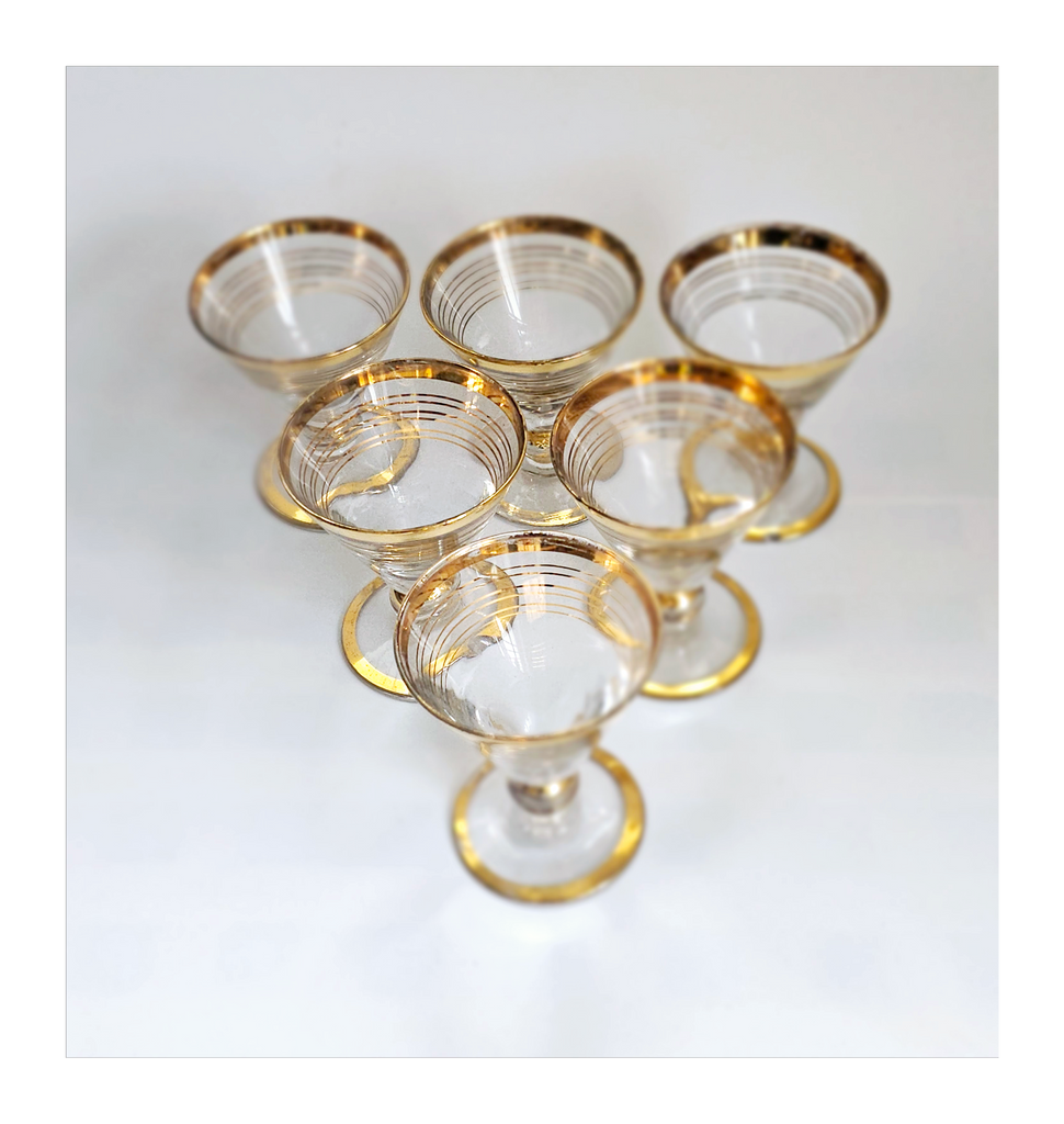 Vintage 1930's Art Deco set of 6 Red Wine Glasses with Gold Bands on Stem, Rank and Foot. Together they weigh 588 g. Each glass measures 7 cm in diameter and 8.5 cm height. In overall good condition, but two of the glasses have a chip at the base as seen in the images and reflected in the price. A great addition to your Art Deco / Wine Glass collection. Collectable. Collectors' Item.