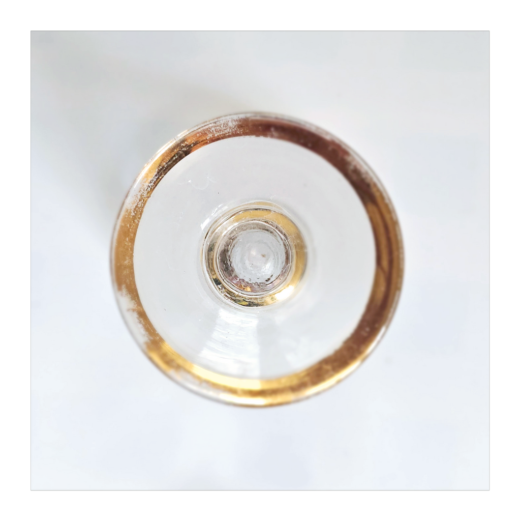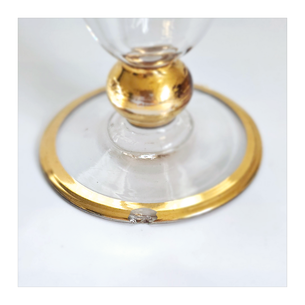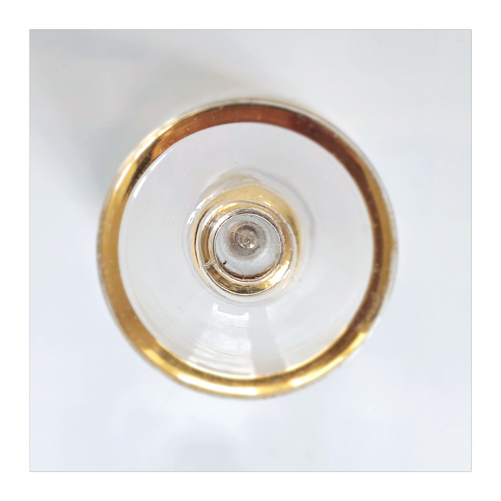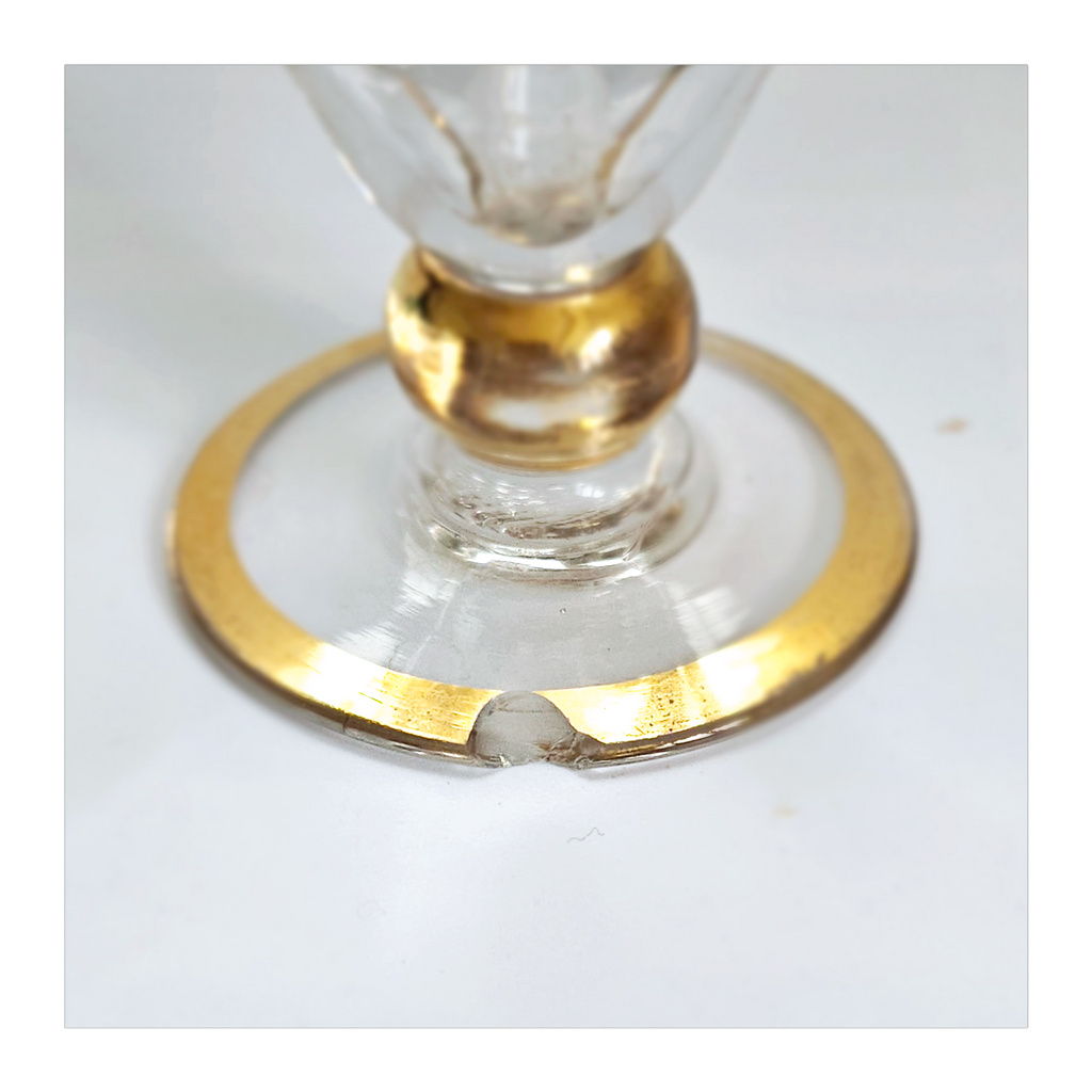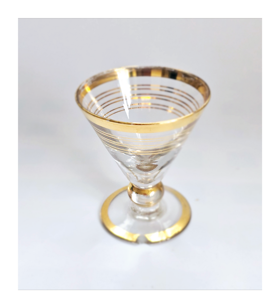 Vintage 1930's Art Deco set of 6 Red Wine Glasses with Gold Bands on Stem, Rank and Foot. Together they weigh 588 g. Each glass measures 7 cm in diameter and 8.5 cm height. In overall good condition, but two of the glasses have a chip at the base as seen in the images and reflected in the price. A great addition to your Art Deco / Wine Glass collection. Collectable. Collectors' Item.