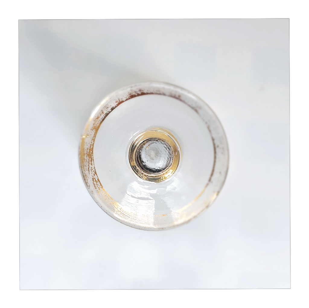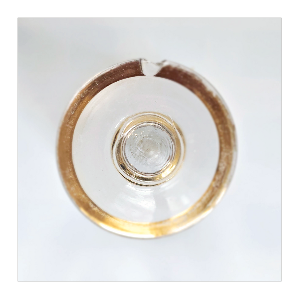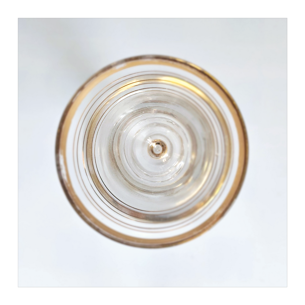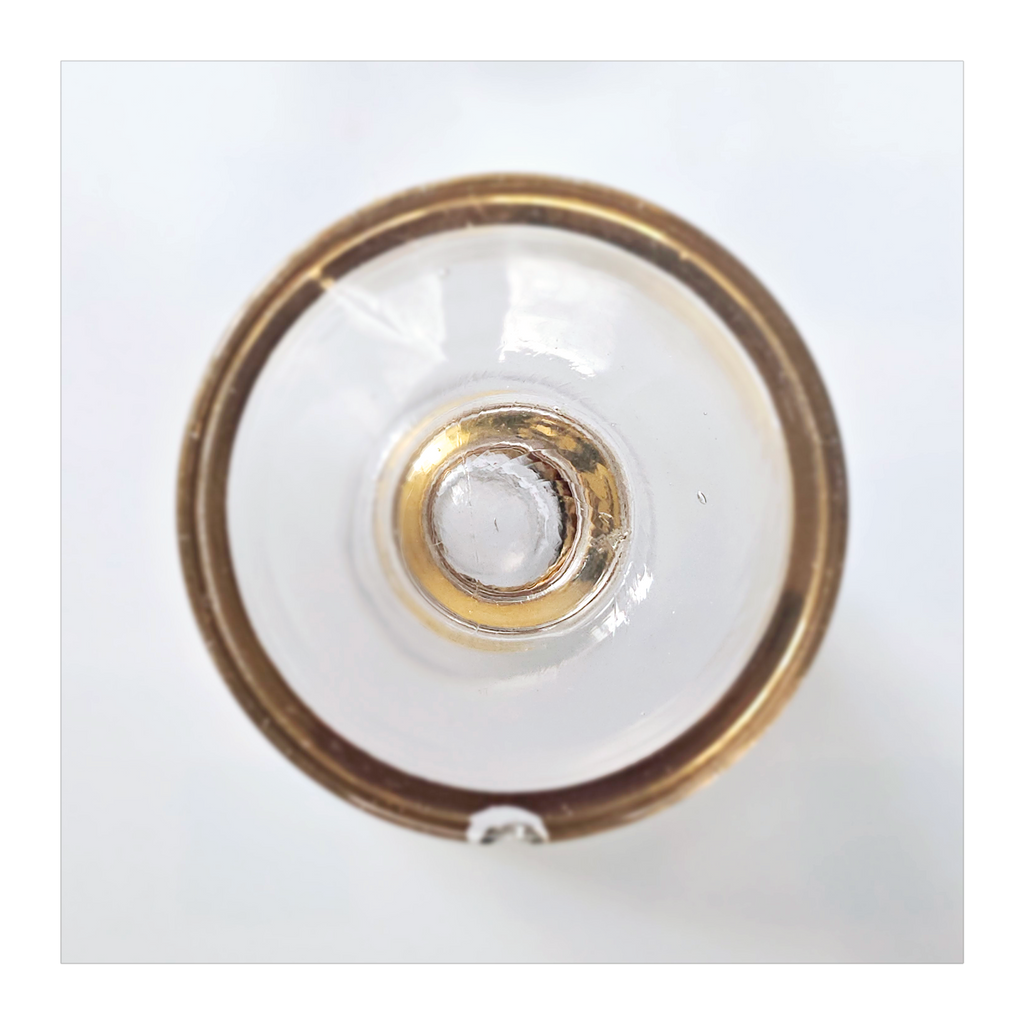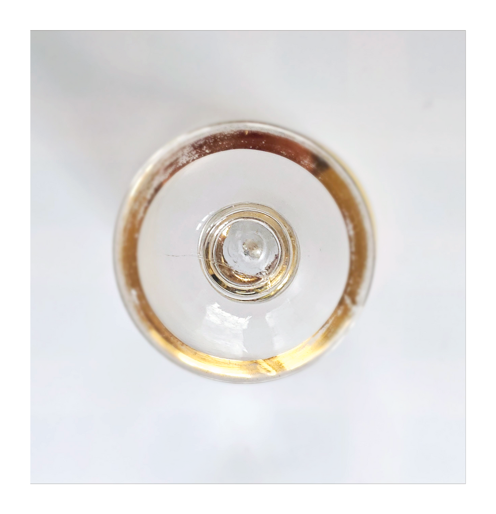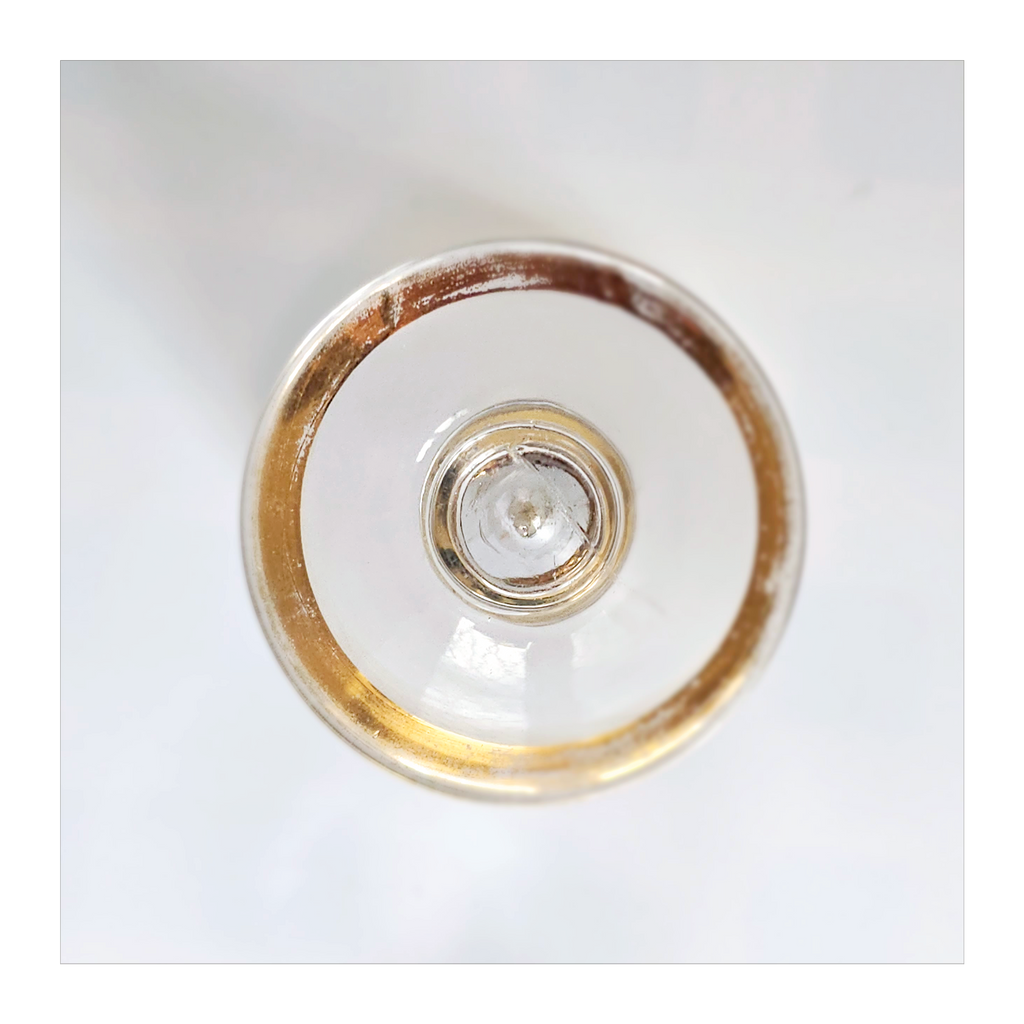 Vintage 1930's Art Deco set of 6 Red Wine Glasses with Gold Bands on Stem, Rank and Foot. Together they weigh 588 g. Each glass measures 7 cm in diameter and 8.5 cm height. In overall good condition, but two of the glasses have a chip at the base as seen in the images and reflected in the price. A great addition to your Art Deco / Wine Glass collection. Collectable. Collectors' Item.