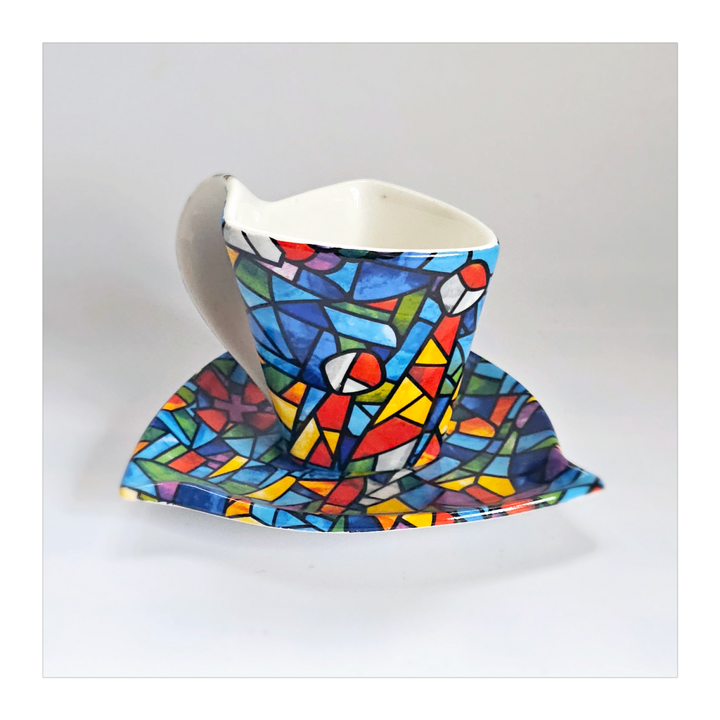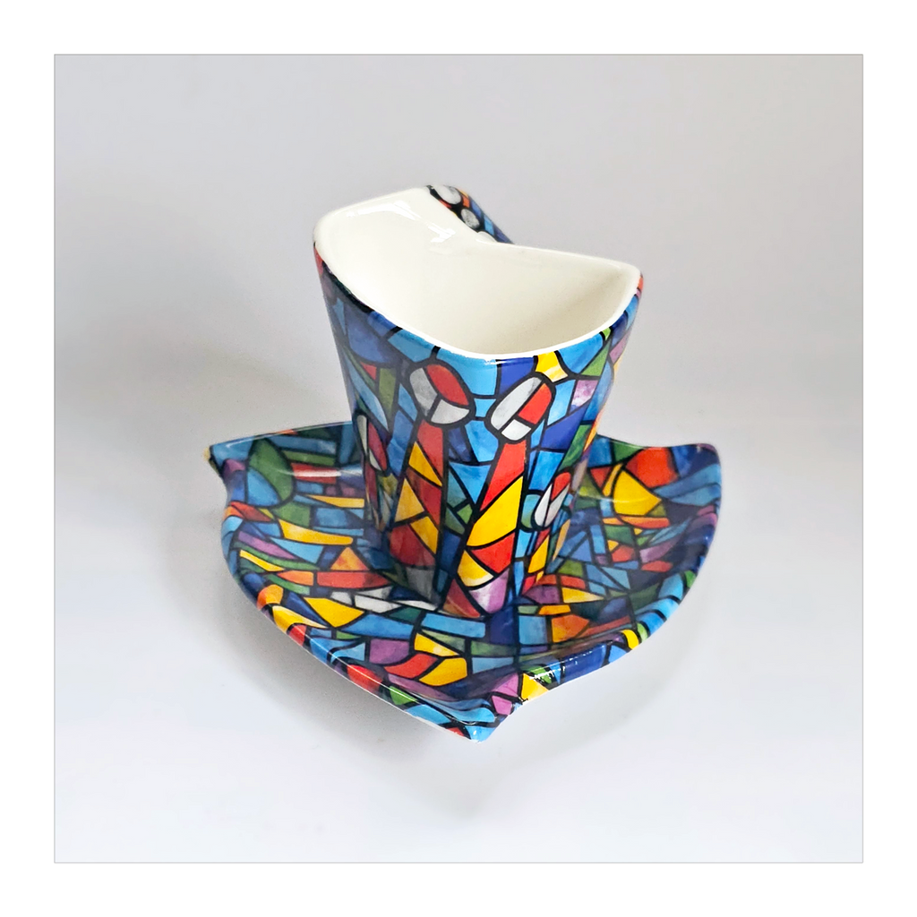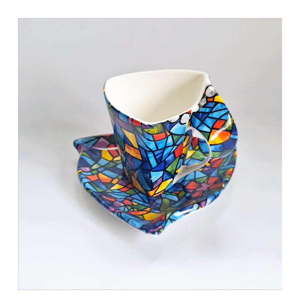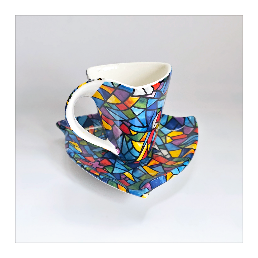 Beautiful Vintage Art Trencadis S.L. Barcelona Glazed Ceramic Gaudi Mosaic pattern Cup and Saucer