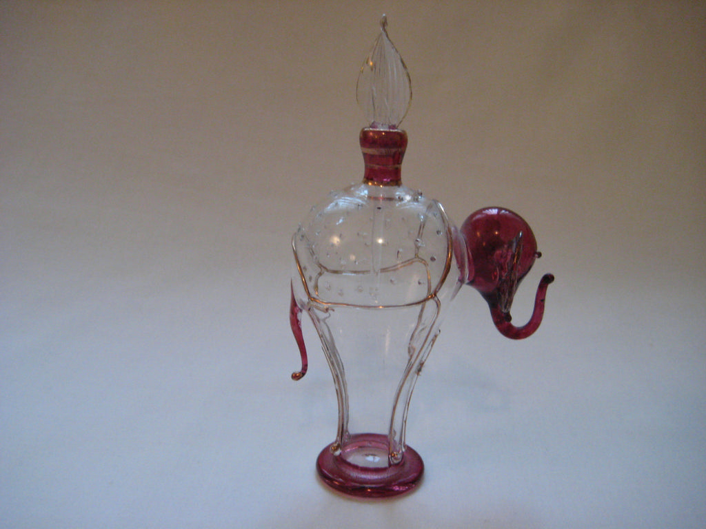 A very delicate perfume bottle in clear and maroon colour glass with gold trimmings in the shape of an elephant. It weighs 0.05 kg, its size is 14 by 9 by 5 cm.