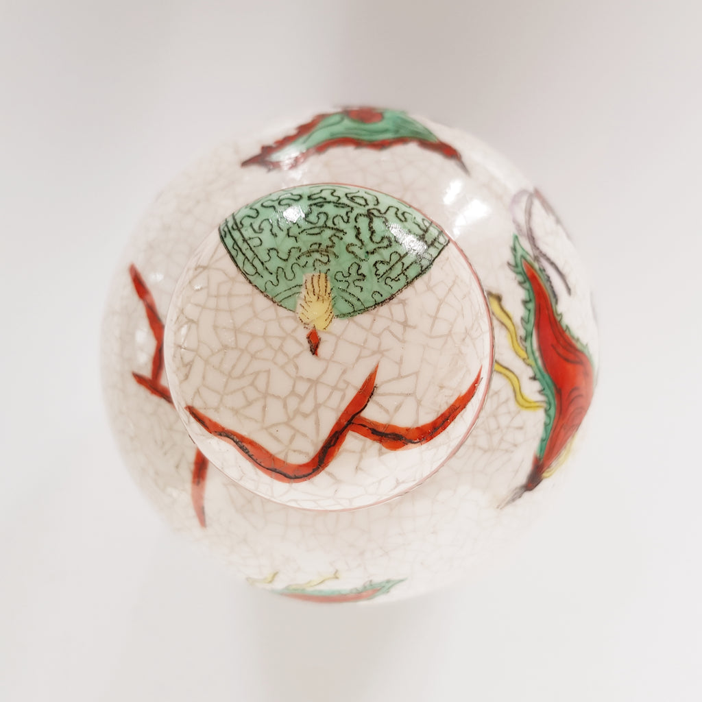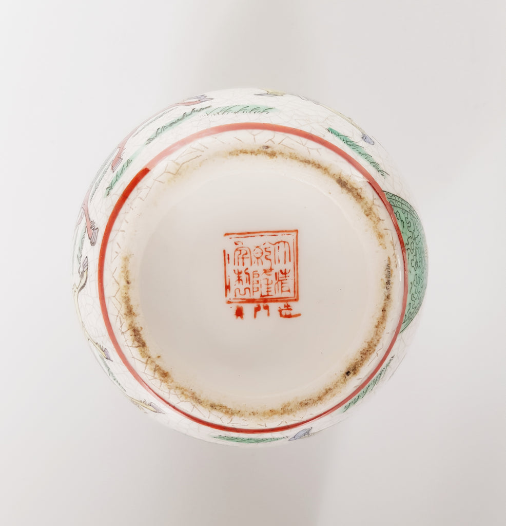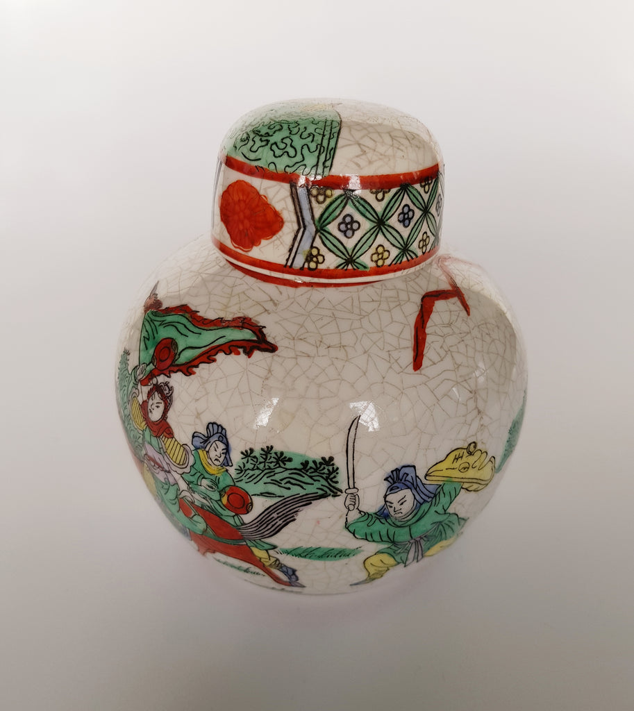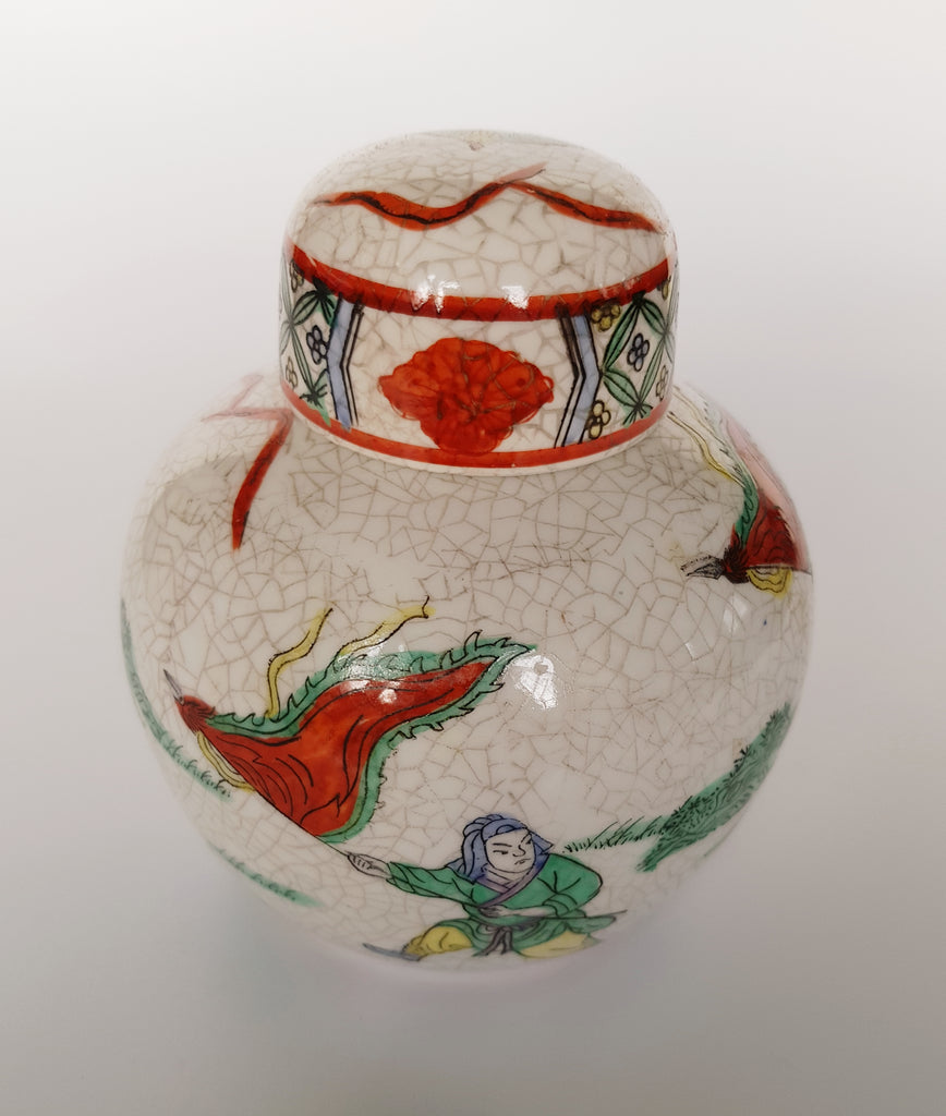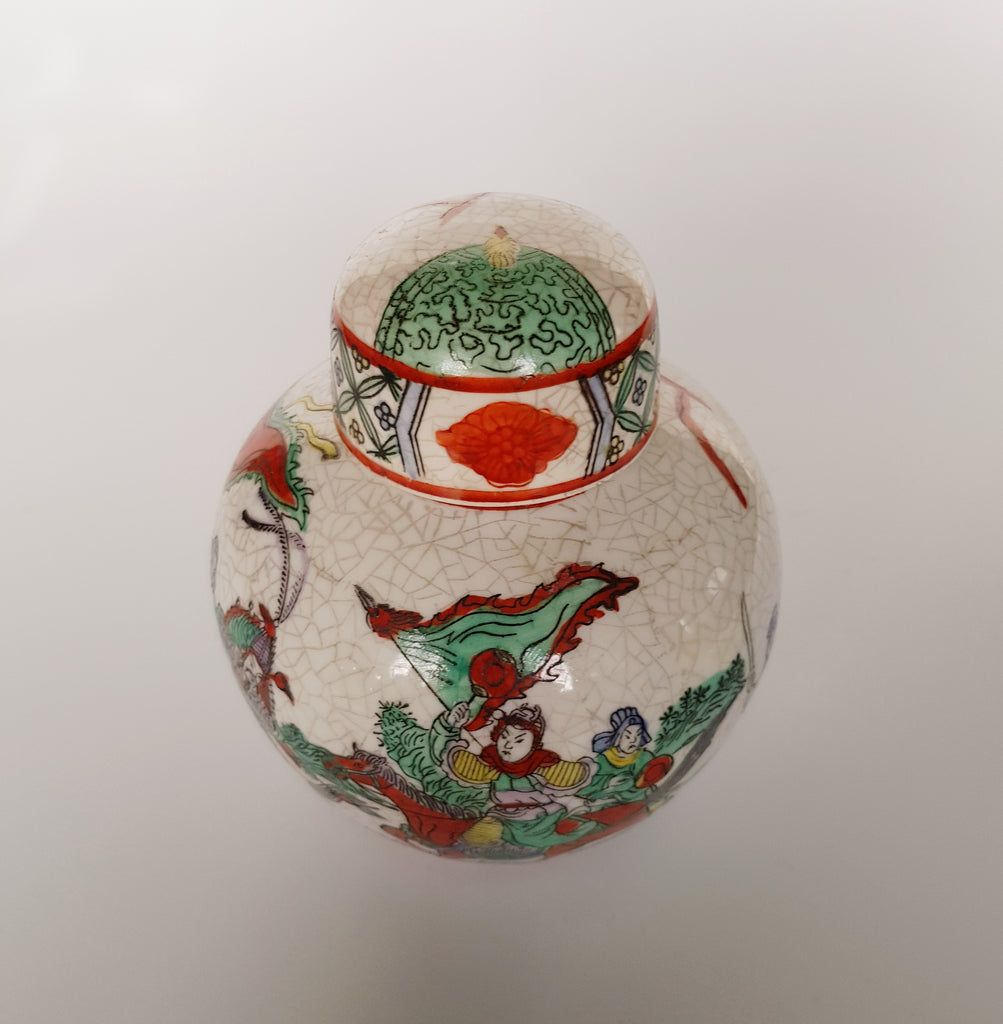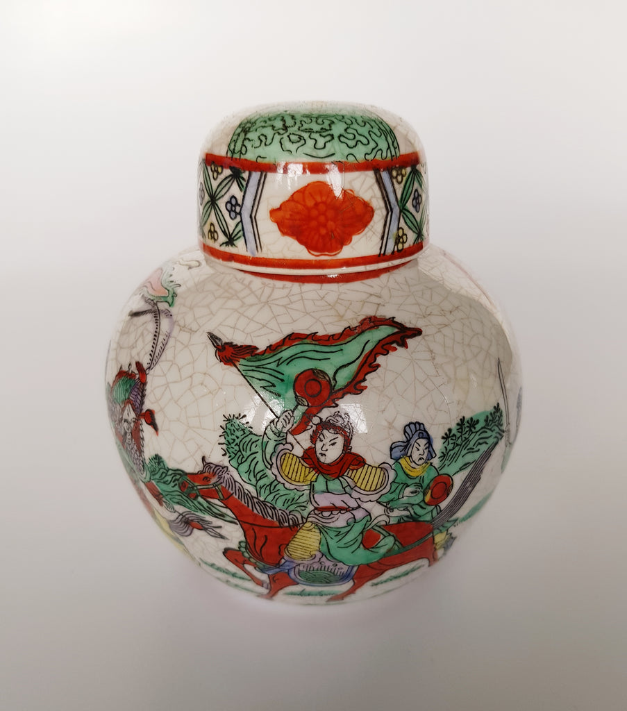 An antique early 20th century Chinese Famille Verte crackle finish lidded ginger jar painted with warriors in the battleground. It has a Chinese red hallmark at the base, possibly representing the Great Qing Dynasty. It weighs 242 g. Its measurements are 11 cm diameter at its widest and 11 cm height. In excellent condition, no chips, no cracks and no restoration. A great addition to your antique Chinese pottery / Jar collection.