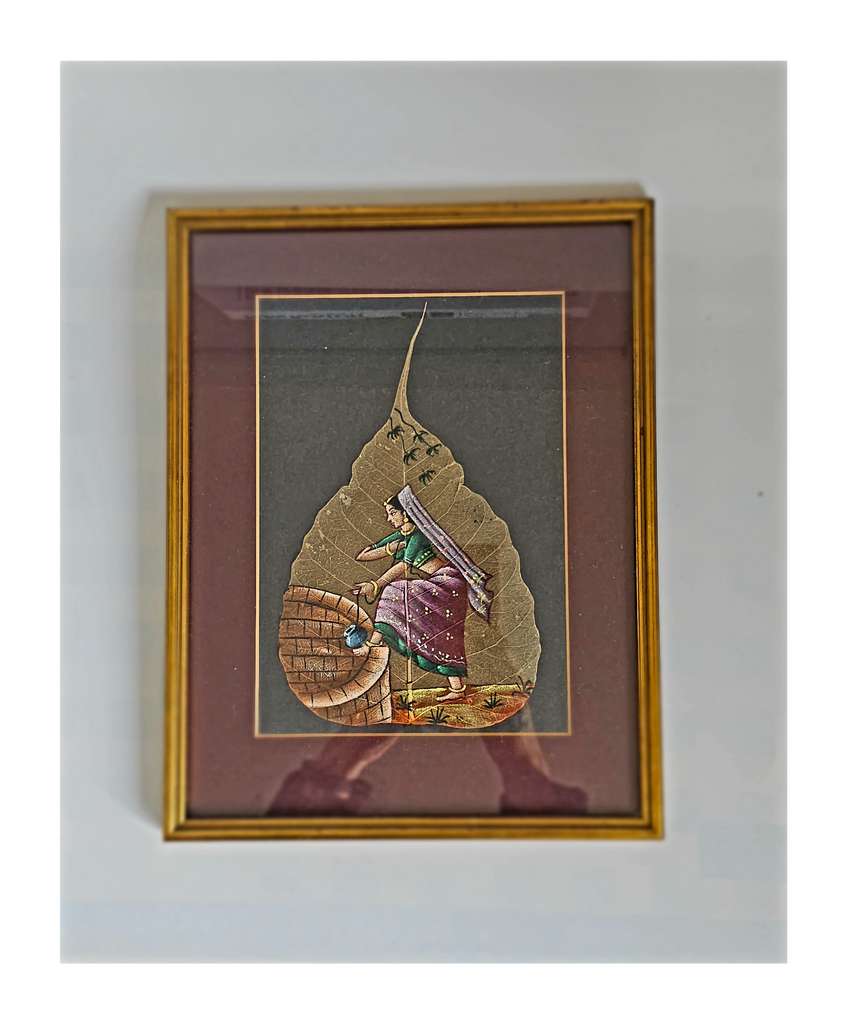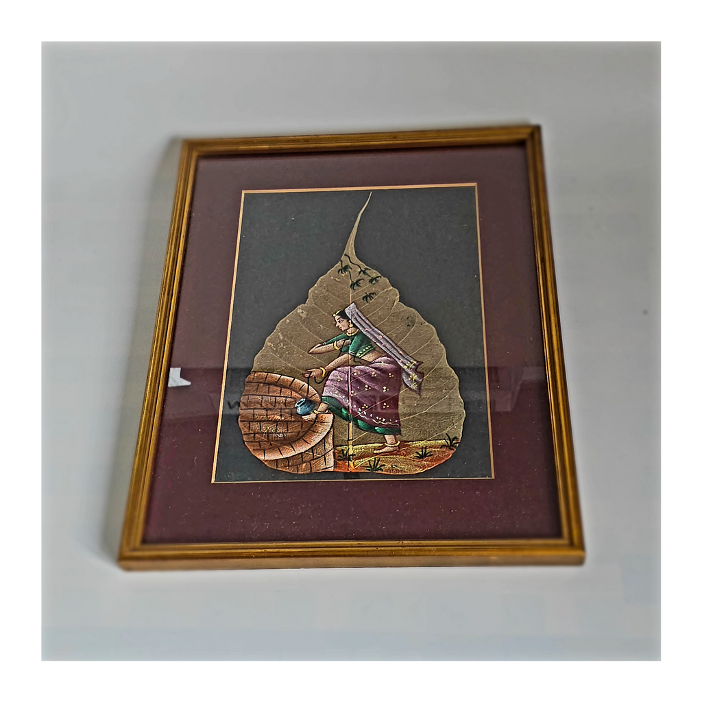 A vintage 1970's Indian hand painted dried banana leaf painting of a Woman Lowering a Water Pitcher into a Well. It weighs 644 g. Its measurements are 32.4 cm height, 25 cm width and 1 cm depth. In excellent condition, no chips, no scratches. A great addition to your Wall Art / Indian Art & Craft collection. Collectable. Collector's item.