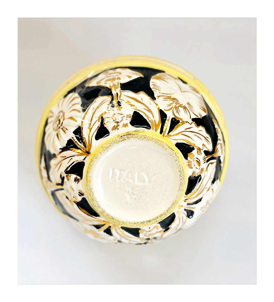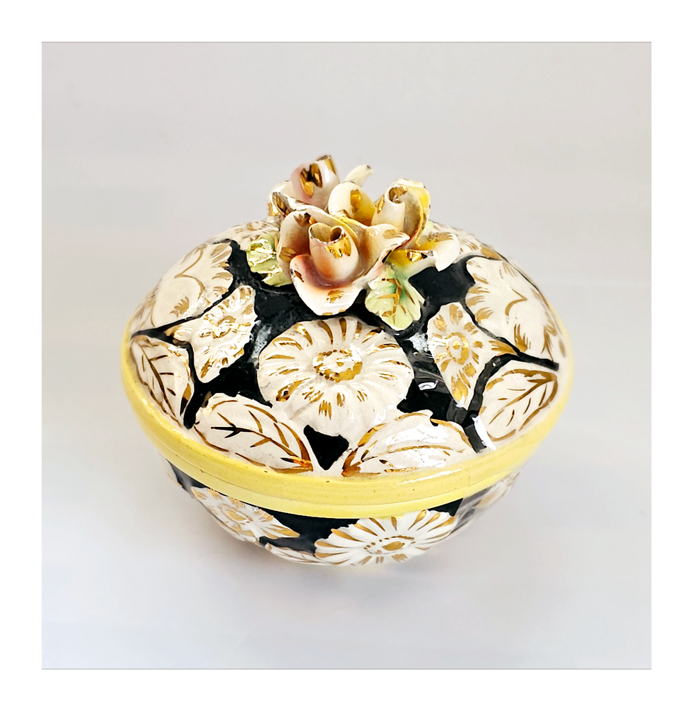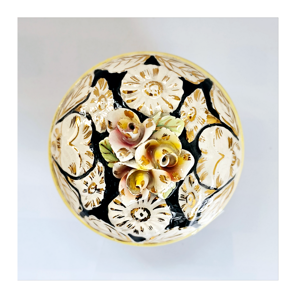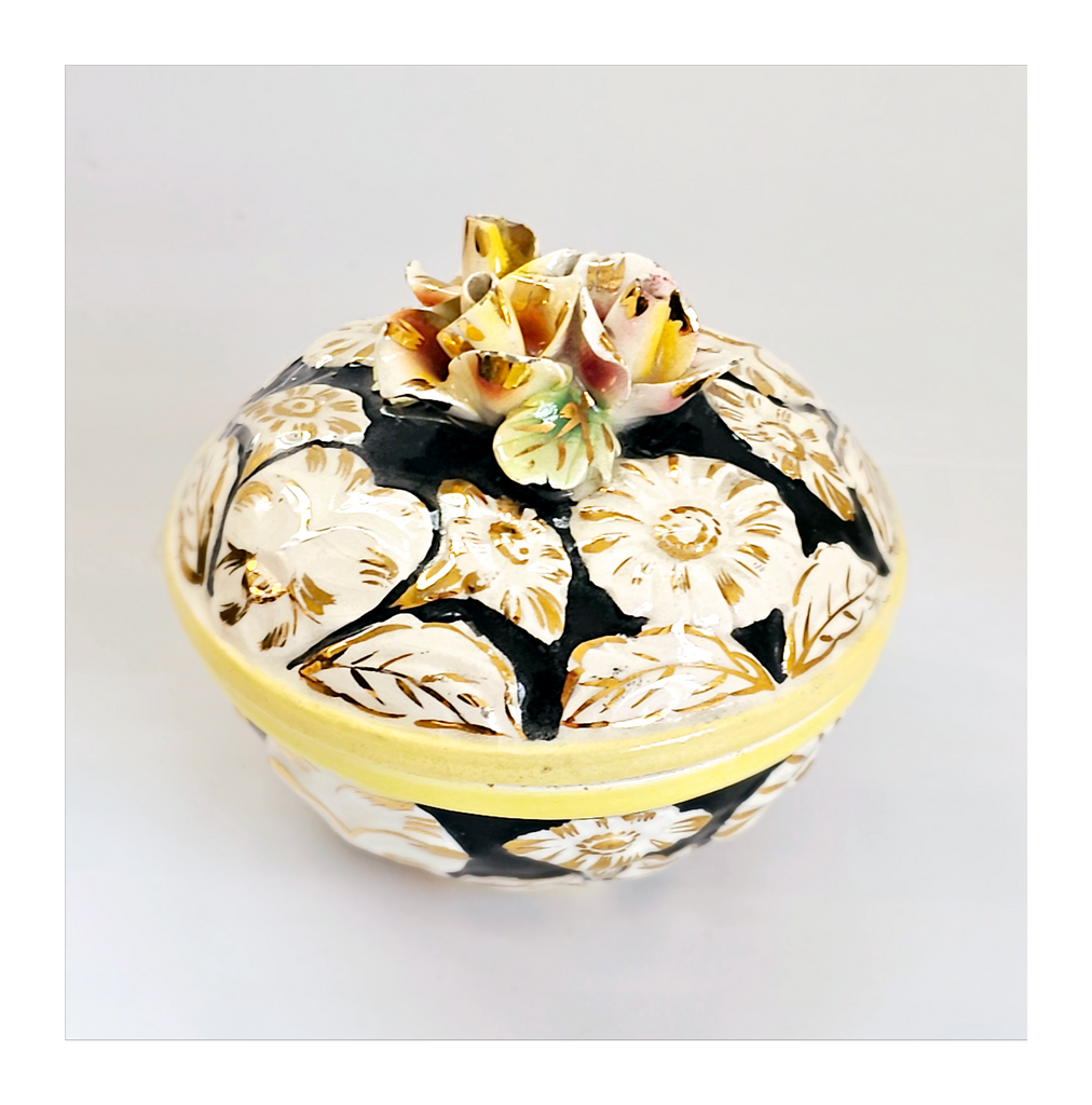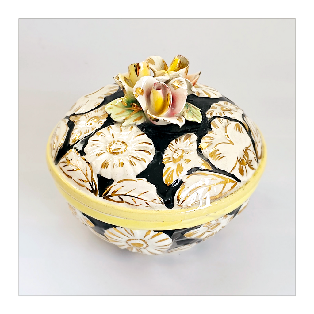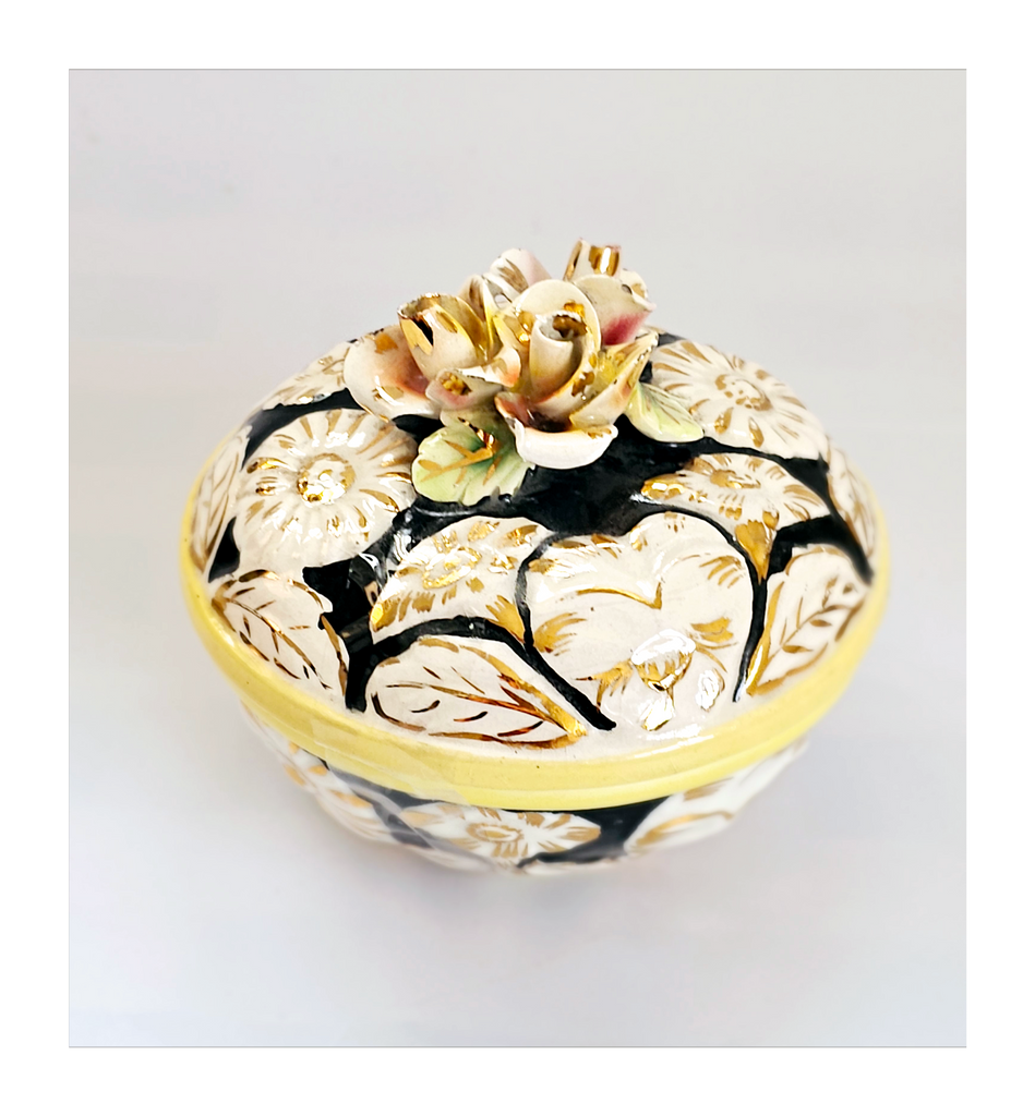 A beautiful rare vintage Italian hand painted Majolica floral embossed lidded sweet bowl / jewellery box. It is marked as "ITALY 7". It weighs 239 g. Its measurements are 9.5 cm diameter, 8 cm height. In excellent condition, no chips, no cracks, no restoration. A great addition to your Bowl / Jewellery collection. Collectable. Collector's item.