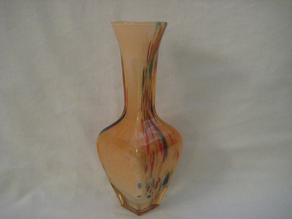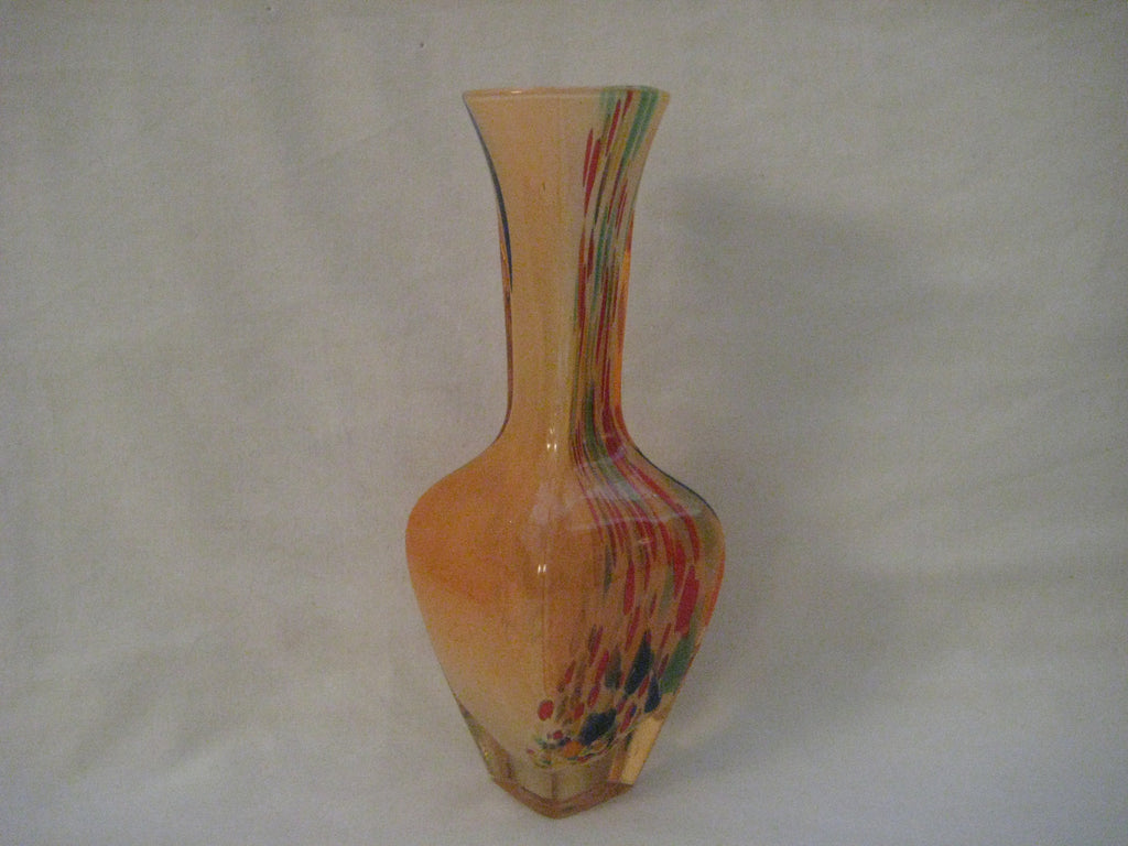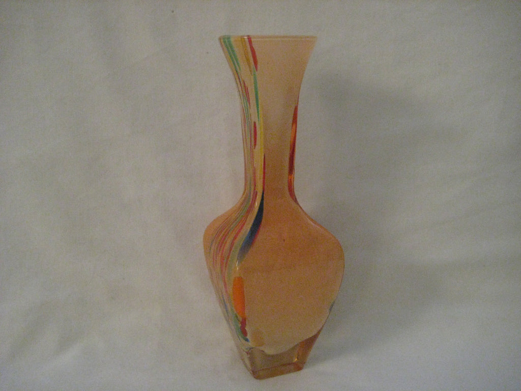 A very beautiful Vintage Silvestri Arte Murano Crystal Glass vase in amber with streaks of red, blue, orange, green, brown colours. It weighs 0.48 kg and its size is 23 by 7.5 by 7.5 cm. Collectors item.