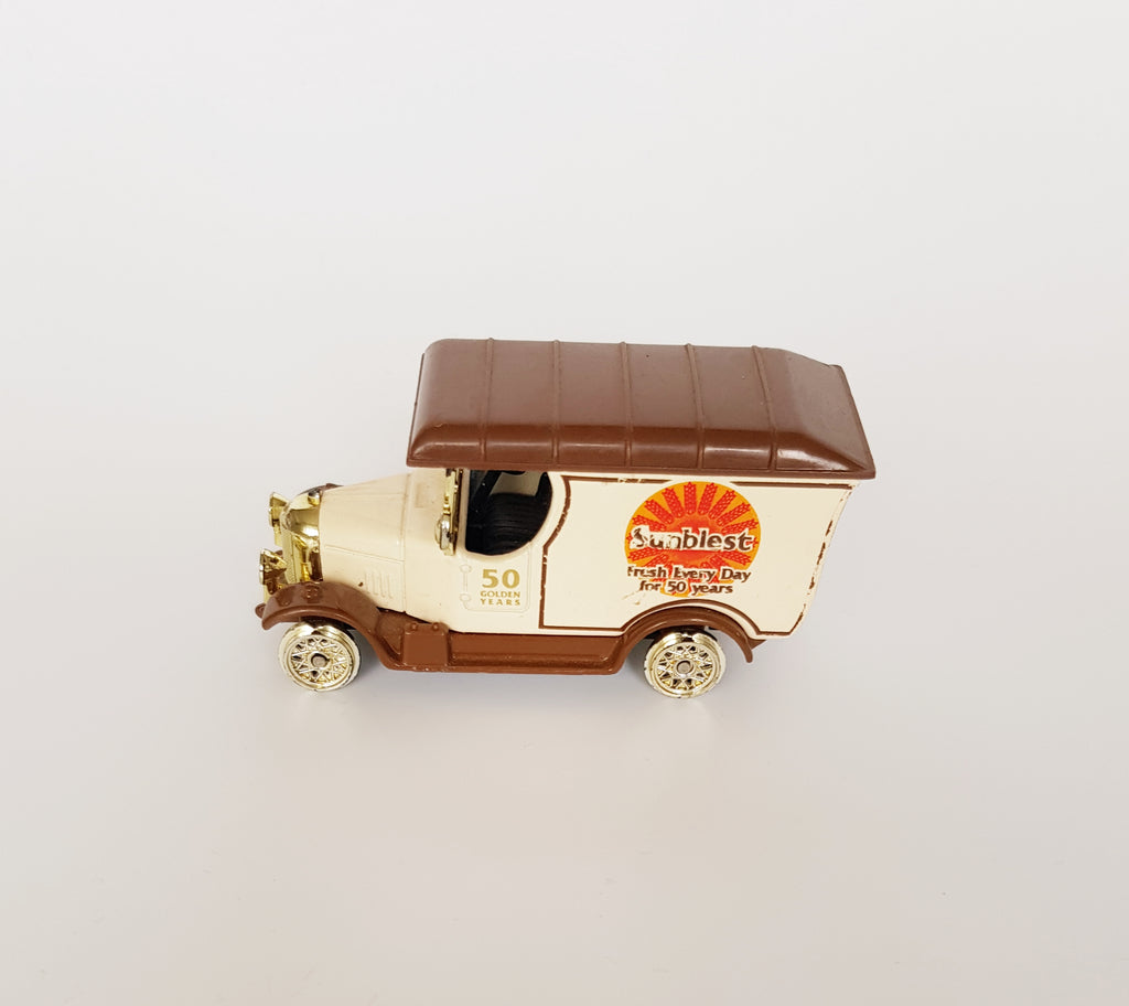 Limited Edition Miniature Oxford Die Cast Sunblest Truck Model 050G. It weighs 77gr. Its measurements are Width 8.5 cm, Height 4 cm, Depth 3 cm. It is in good condition, but the tyres are missing. Collectable. Collectors' item.