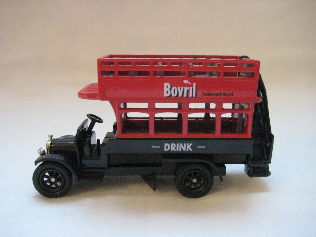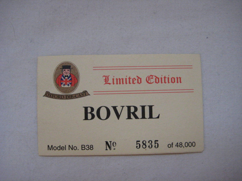 An Oxford Die-Cast Model No B 38 open staircase bus Bovril, Limited Edition No 5835 of 48,000. It is in its original box, it weighs 0.13 kg and the box size is 14 by 7 by 3.8 cm. Collectable. Collectors' item.