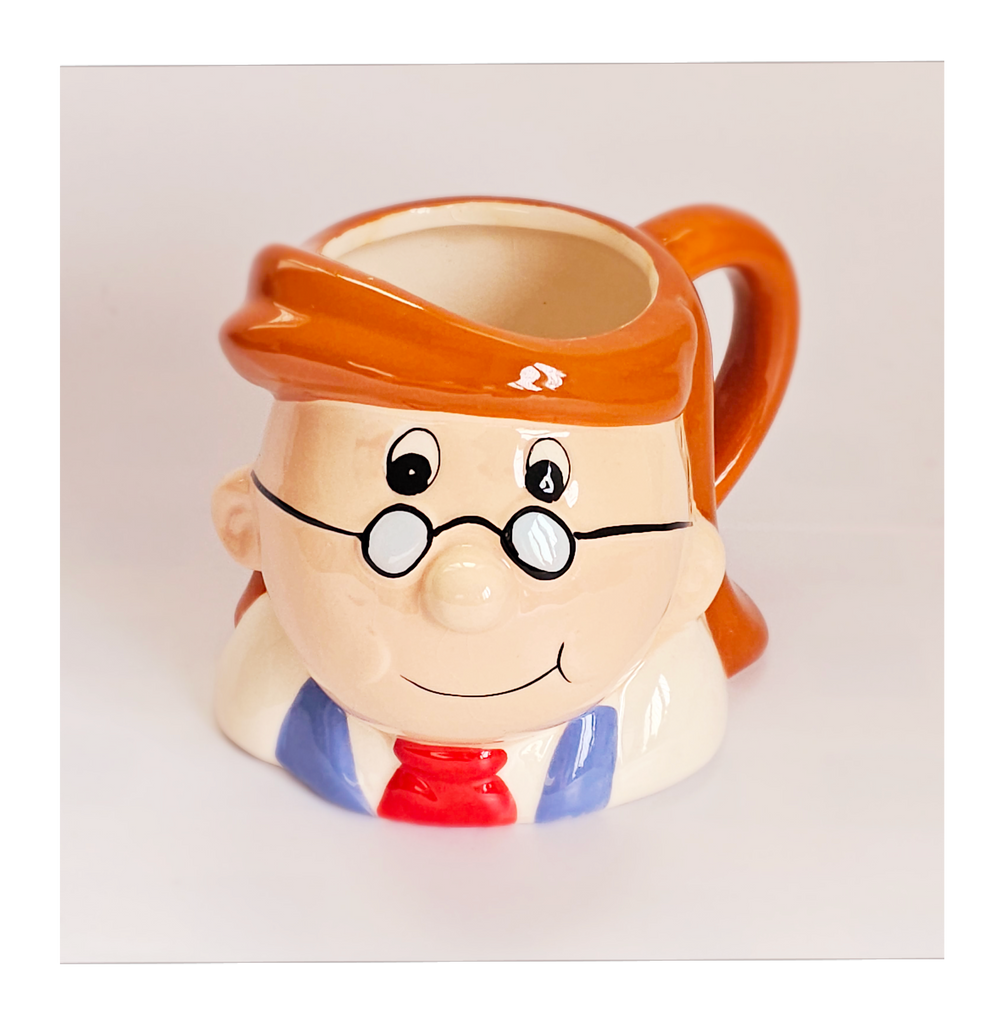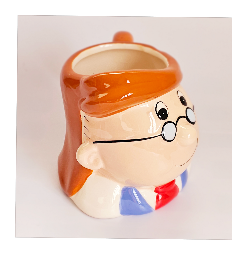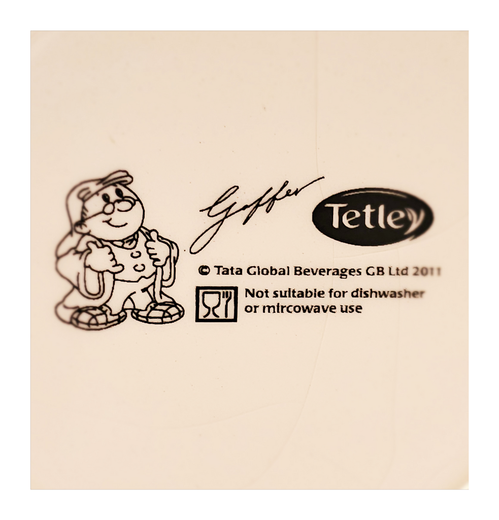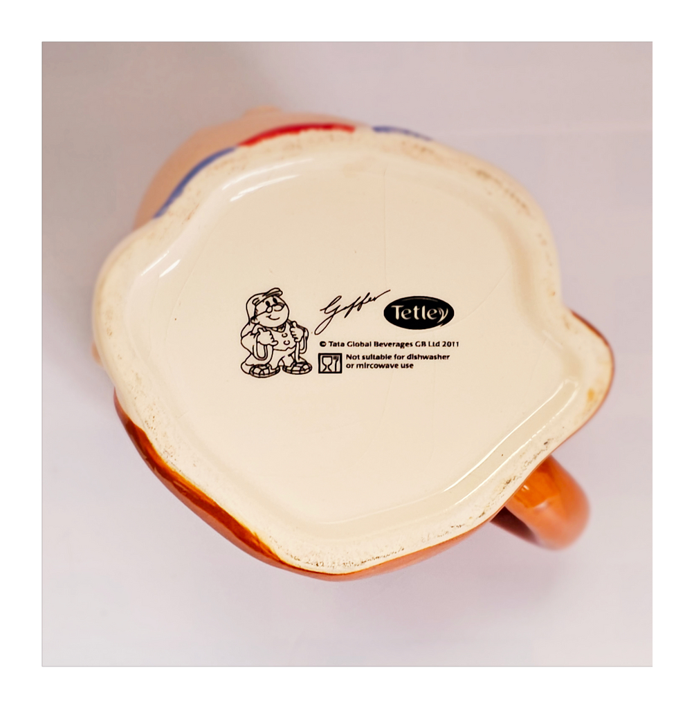 A rare Tetley Tea folk Gaffer mug collectable limited edition Tata Global 2011. It weighs 339 g. Its measurements are 11.5 cm diameter at the base, 8 cm diameter at the top, 15.5 cm width at its widest, and 9 cm height. It's in an overall very good condition, with slight crazing on the white colour and the base, hardly noticeable. A great addition to your Tetley Tea Gaffer / Novelty Mug collection. Collectable. Collector's item.