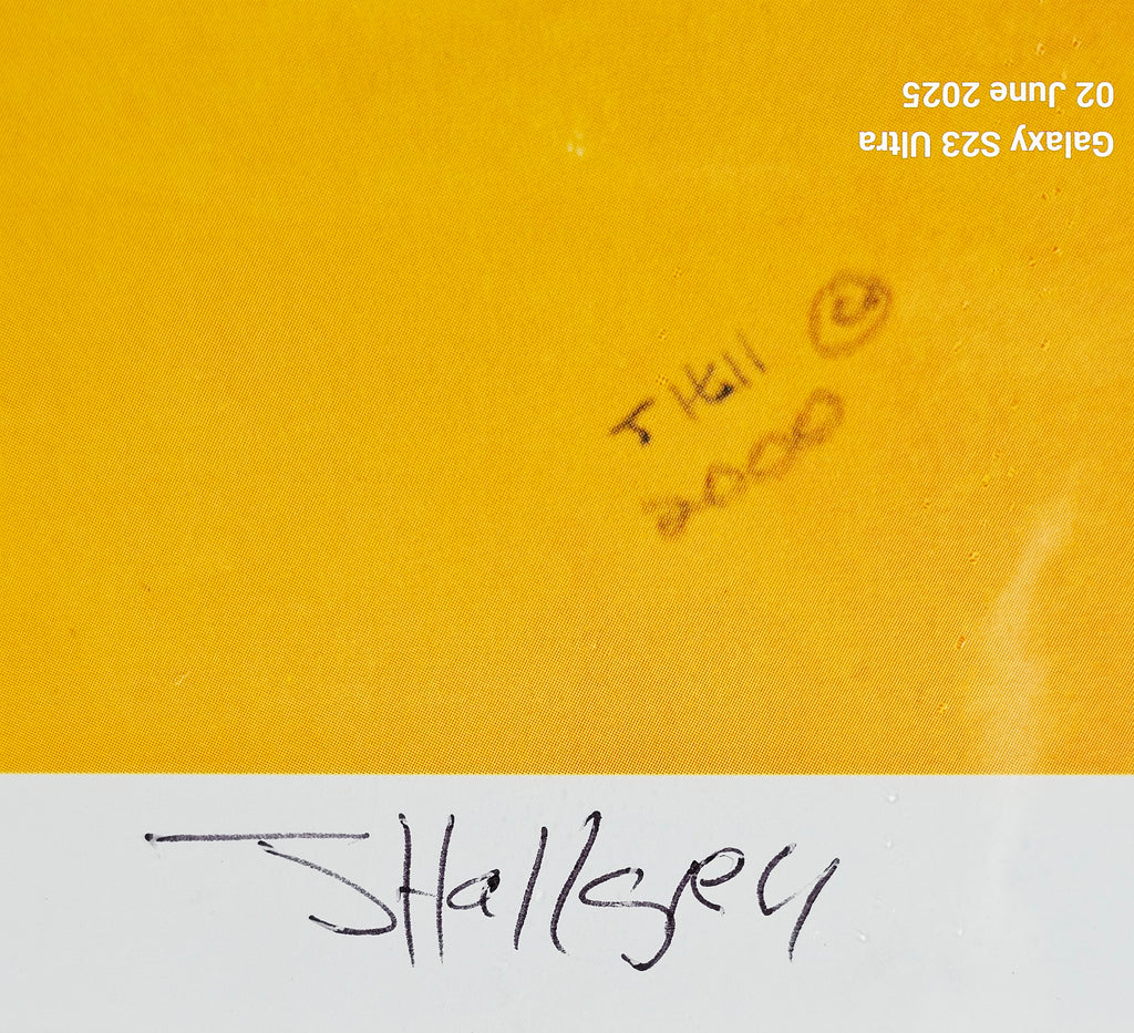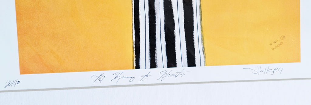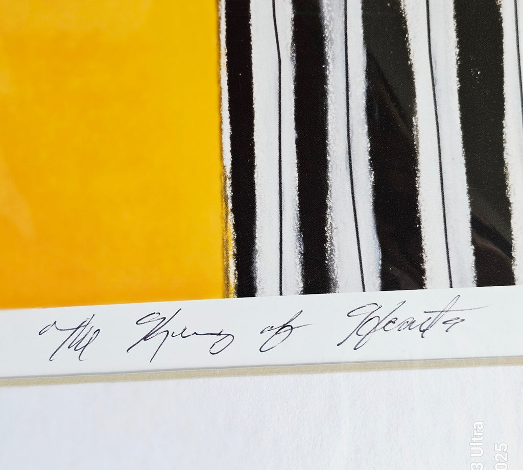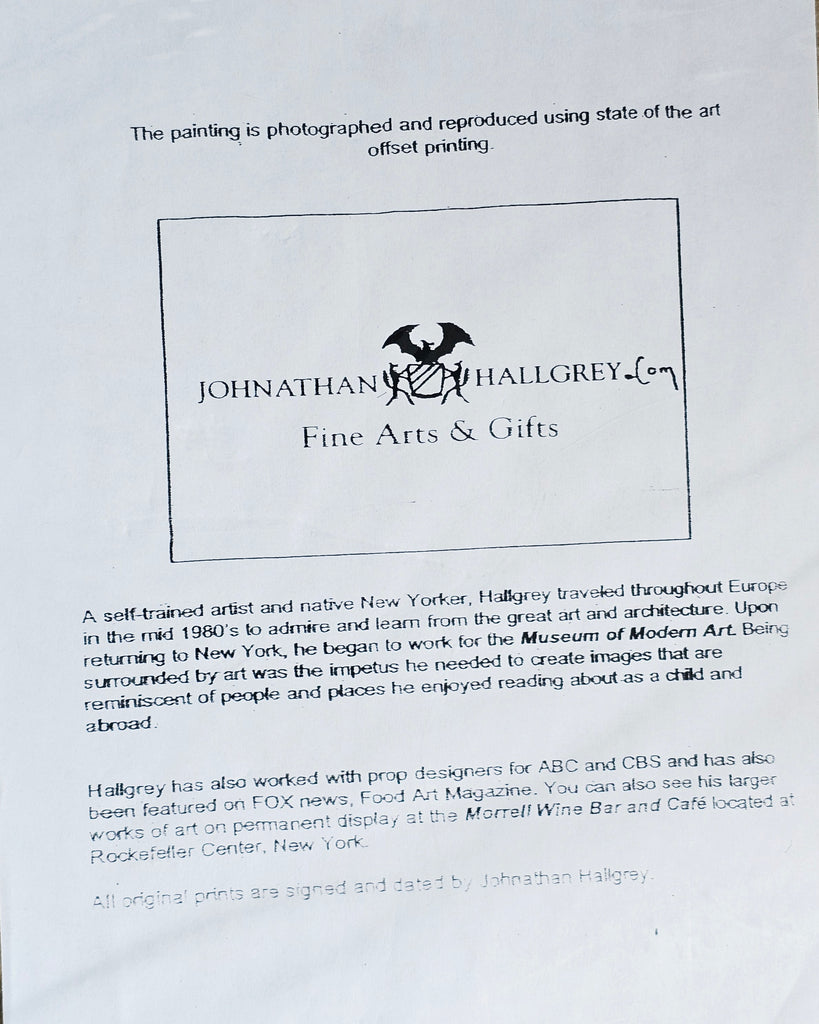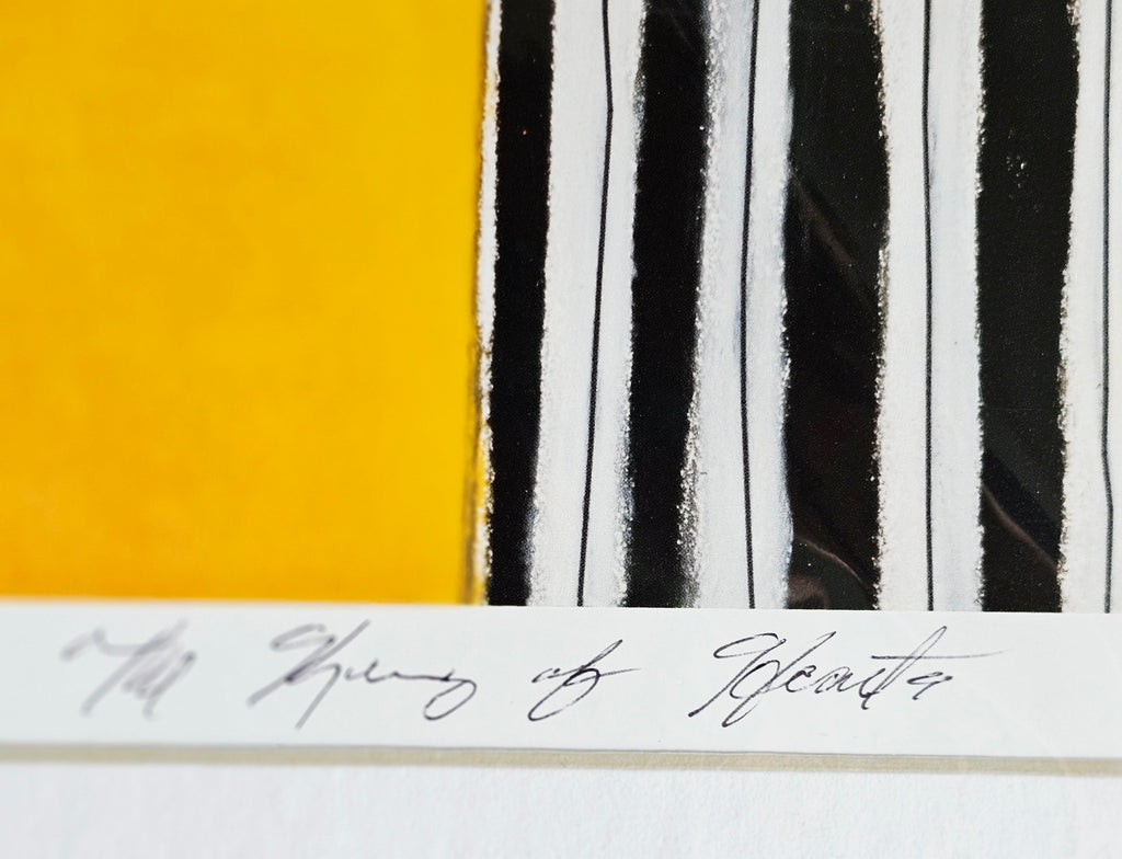This is a signed, rare limited edition lithograph print by Johnathan Hallgrey, titled "The King of Hearts". The print is numbered 20/40 and signed by the artist in the lower right corner. It depicts a stylized figure of a man in a black and white striped suit with a red heart on his chest, smoking a cigarette. Johnathan Hallgrey is a self-taught artist from New York City who draws inspiration from the Jazz Age, Broadway, and Hollywood film magic. His works often feature stylized figures and are reminiscent of the people and places he enjoyed reading about as a child. This particular piece, "The King of Hearts", is part of his Costume Series. It weighs 305g. Its measurements are 40cm width, 55cm height and 0.2cm depth. In excellent condition. A great addition to your original lithograph prints / Limited Edition collection. Collectible. Collector's item.