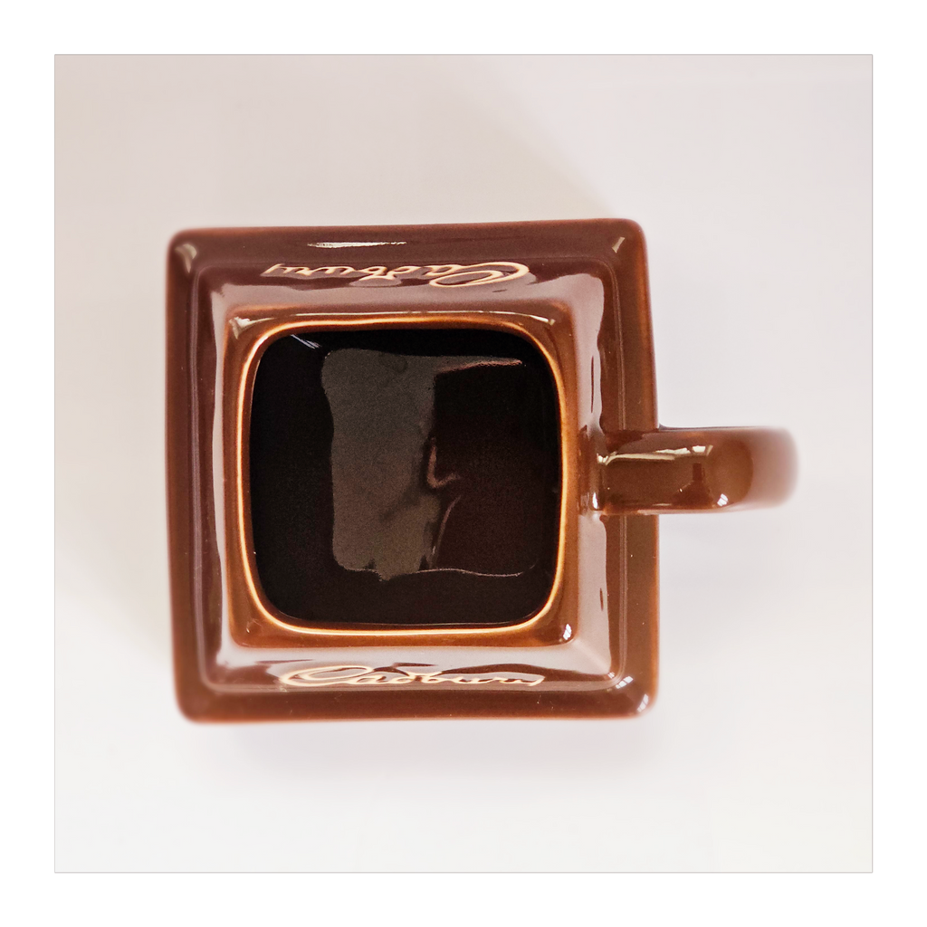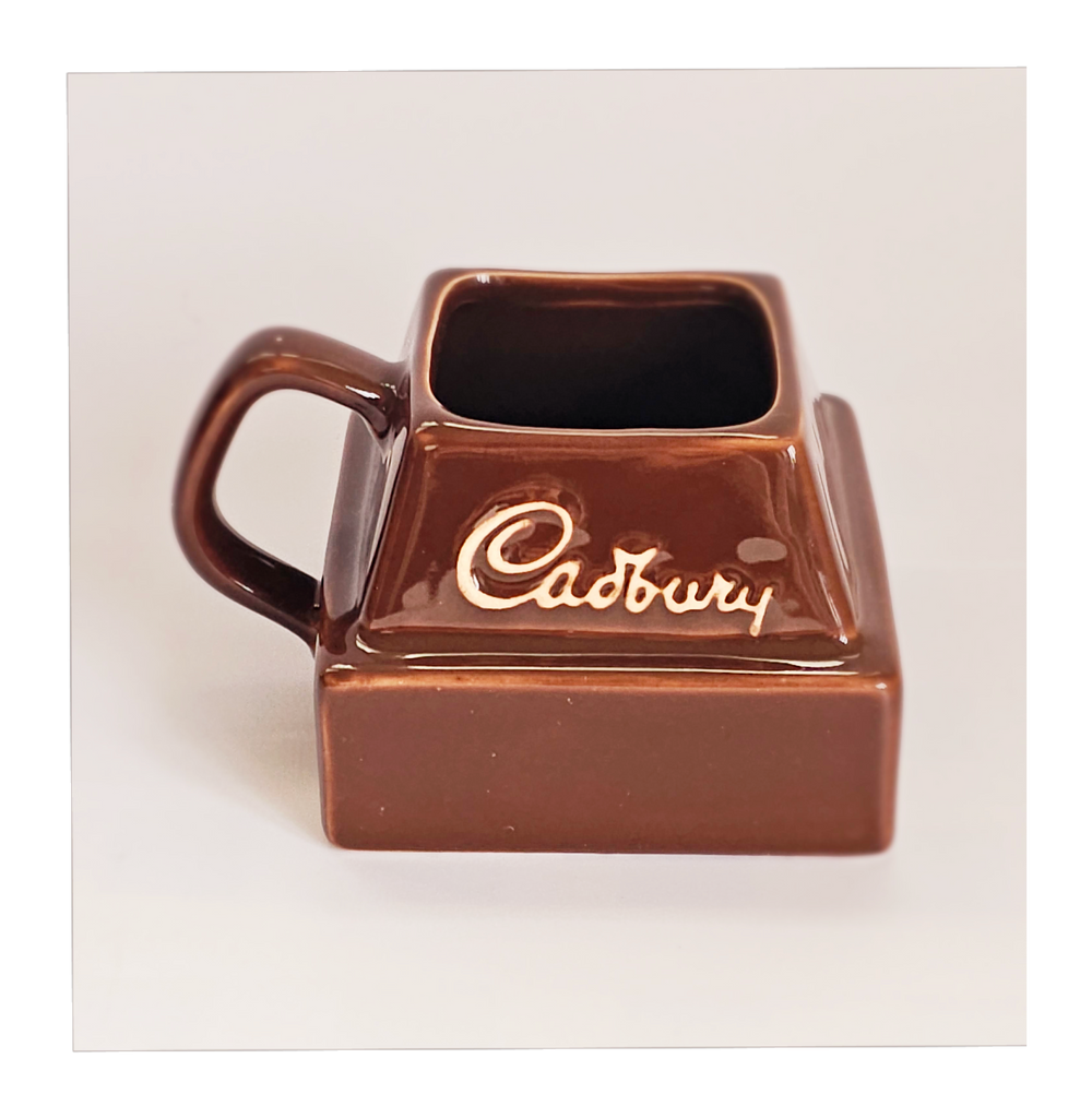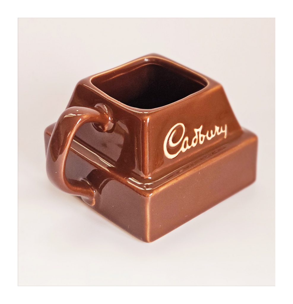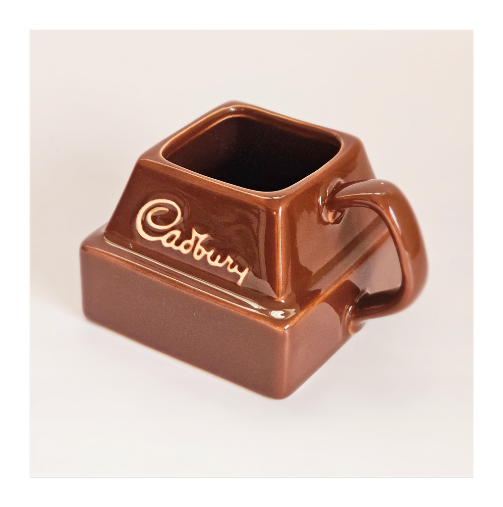 A vintage limited edition 1980's Cadbury ceramic chocolate chunk advertising mug. It weighs 291g. Its measurements are 9 cm width, 9 cm depth, and 7 cm height. In excellent condition, no chips, no cracks. A great addition to your novelty mug collection. Collectable. Collector's item.
