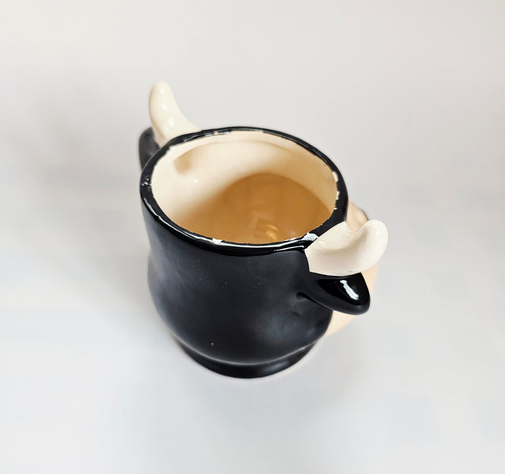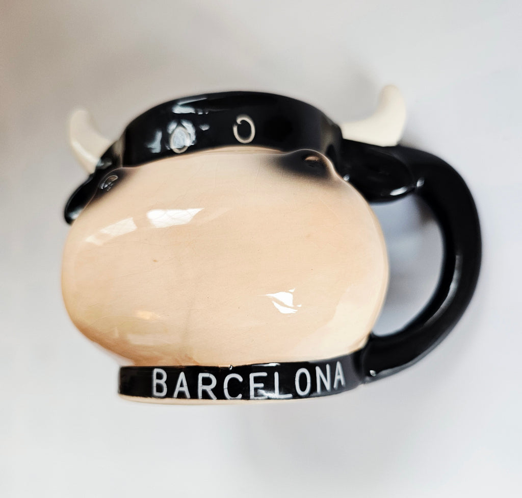 A Rare Vintage Collectible Novelty Hand-Painted Ceramic 3D Bull Head Mug, Souvenir from Barcelona. It weighs 287g. Its measurements are 15cm width at its widest, 9.5cm depth, and 10.5cm height. In excellent condition, no chips (with the exception of a tiny paint chip on the top rim as shown in the image and reflected in the price) , no cracks, and no restoration. Makes a quirky gift, or a great addition to your novelty tea / coffee mug collection. collectible. Collector's item.