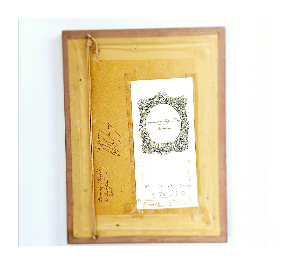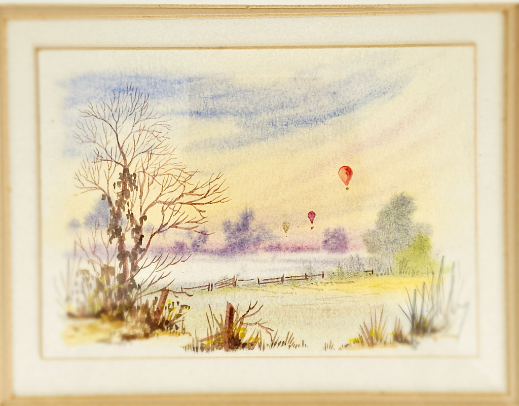 Original Watercolour Painting "Morning Flight" Beautiful framed original watercolour on paper by Christopher Hope-King RMS, HS - a prize winning member of the Royal Society of Miniature Painters, Sculptors and Gravers and also a member of the Hilliard Society. Titled "Morning Flight" Depicting three balloons flying in the horizon over the fields. Signed by the artist on the painting and also in pencil at the back of the frame. Framed in natural wooden frame. It weighs 849 g. Its measurements are 34.8 cm height and 26.2 cm width. In excellent condition. A great addition to your Original Artwork collection. Collectable. Collector's item.