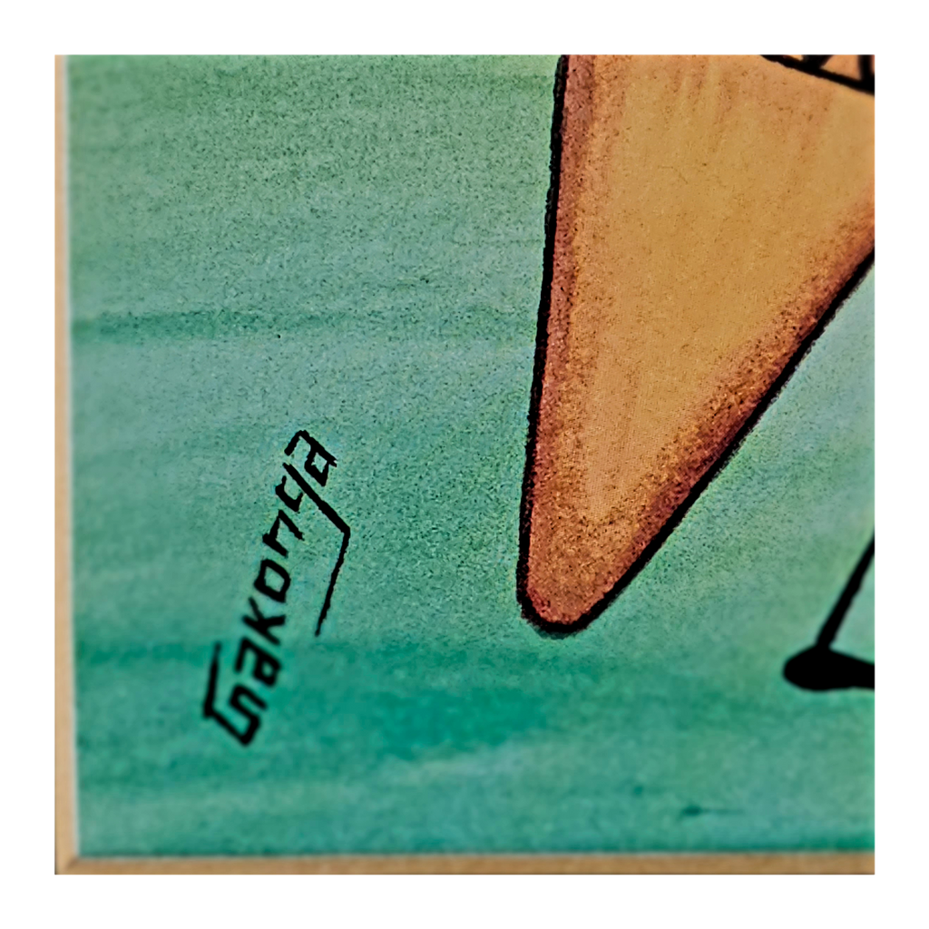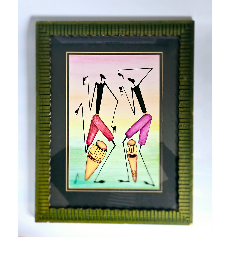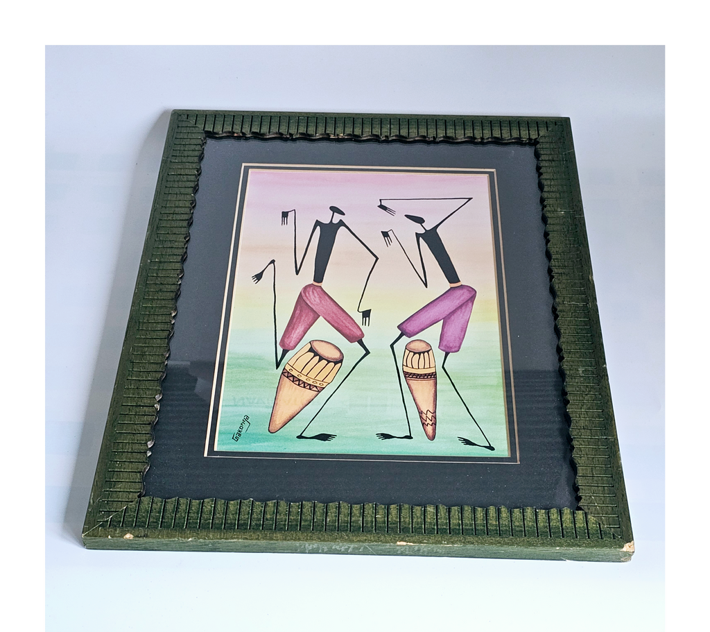 Gakonga African Art Lithograph Print depicting two African drummers, mounted and framed in a wood carved wooden frame. It weighs 1050 g. Its measurements are 41.7 cm height, 32.5 cm width and 1.5 cm depth. In overall very good condition, just small scuffs at the bottom part of the wooden frame as shown in the image. A great addition to your Original Artwork collection. Collectable. Collector's item.