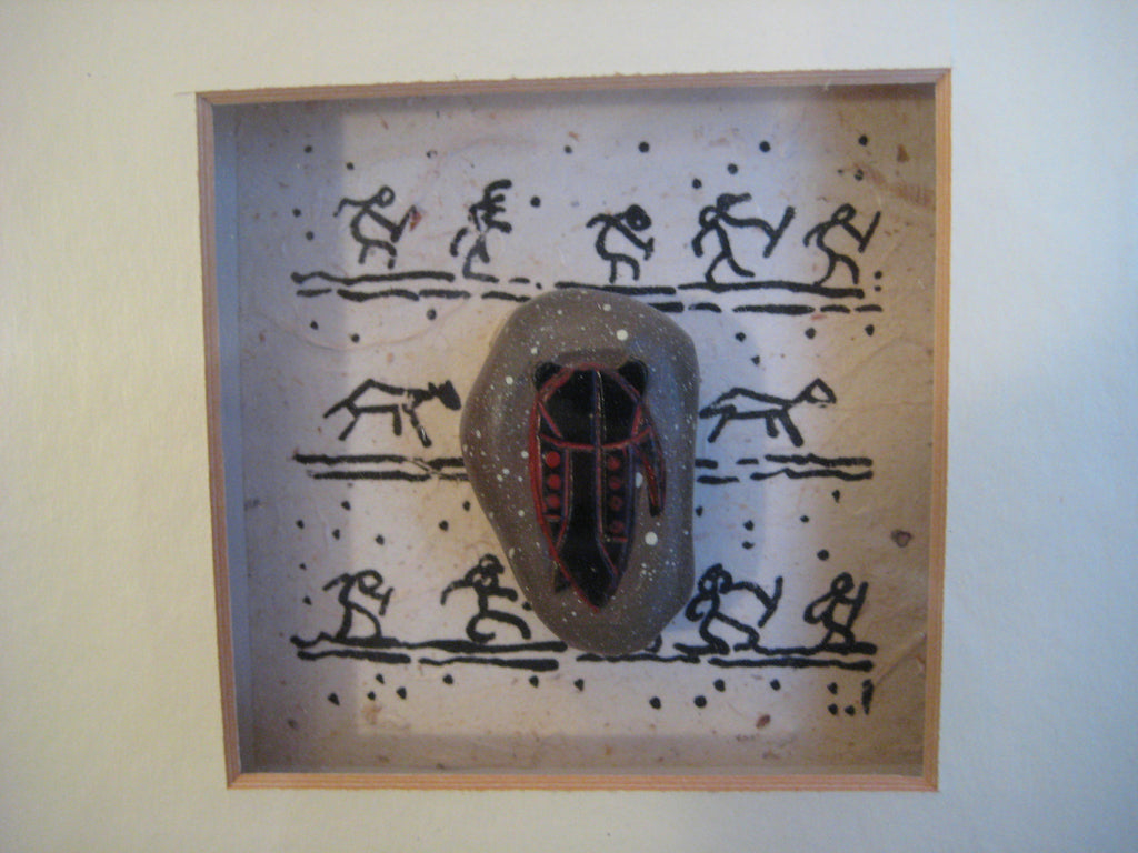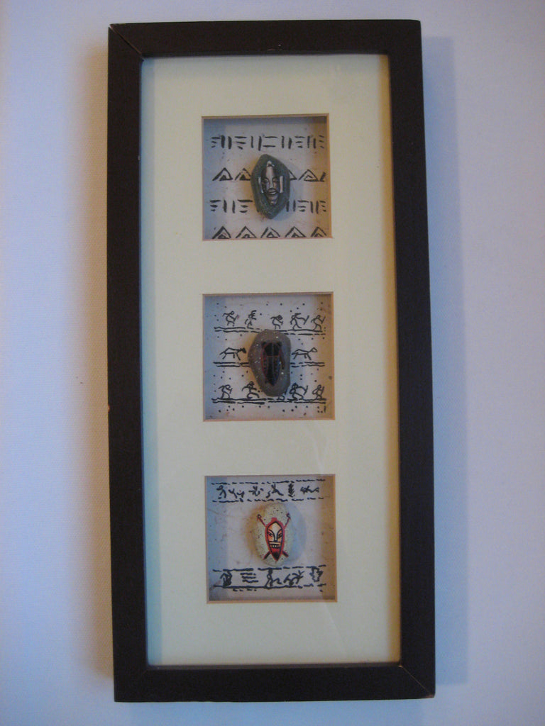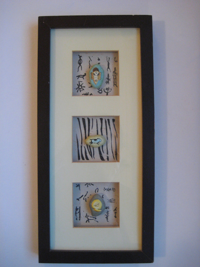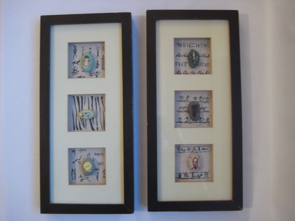 A pair of pebble art pictures. They would look great in a beach house or a contemporary design house. The pair weigh 1.15 kg. Each measures 36.5 cm H, 17 cm W, 2.5 cm D. The pictures are in a very good condition, the wooden picture frames are a bit worn out. Collectable. Collectors' item.