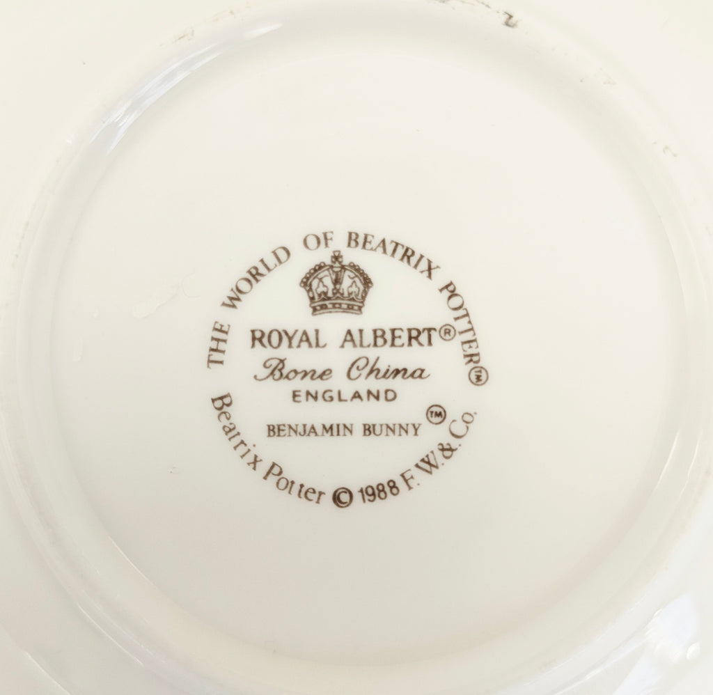 A Rare Vintage 1980's Royal Albert , Frederick Warne & Co., The World of Beatrix Potter "Benjamin Bunny" Fine Bone China Pin Dish. It weighs 123g. Its measurements are 12cm diameter and 2 cm height. In excellent condition, no chips, no cracks, no restoration. A great addition to your Royal Albert / Beatrix Potter collection. Collectable. Collector's item.