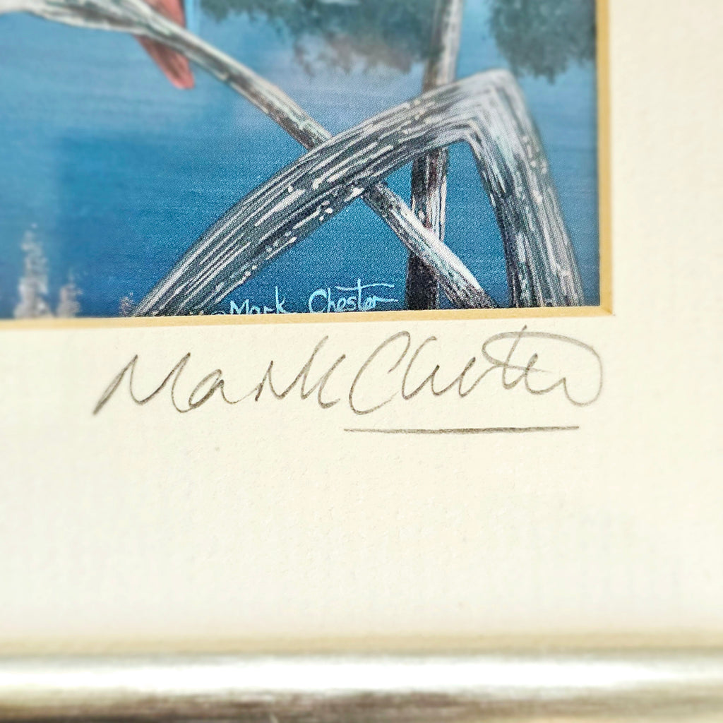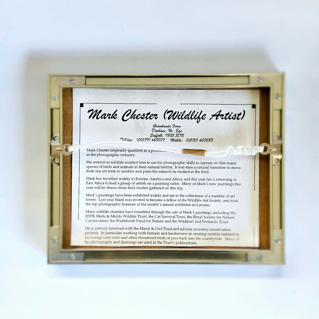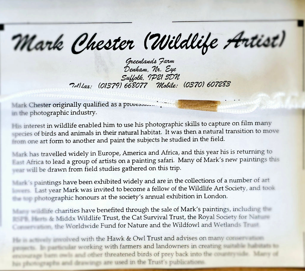 A beautifully Framed Painting of Two Kingfisher Birds Signed by the Wildlife Artist, Mark Chester. It weighs 632 g. It's measurements are 21 cm height, 25.8 cm width and 2.2 cm depth. In excellent condition.  A great addition to your collection of original paintings by professional artists. Collectable. Collector's item.