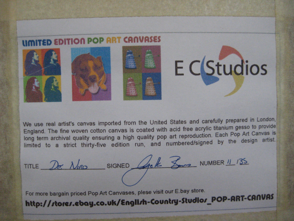 A limited edition 1 of 35 pop art fine woven cotton canvas of Robert De Niro in Casino. It weighs 1.13 kg. Its size is 43.5 by 35 by 1 cm. Collector's item. Free shipping to UK & Northern Ireland, only £5 to Europe and £10 to the rest of the world.