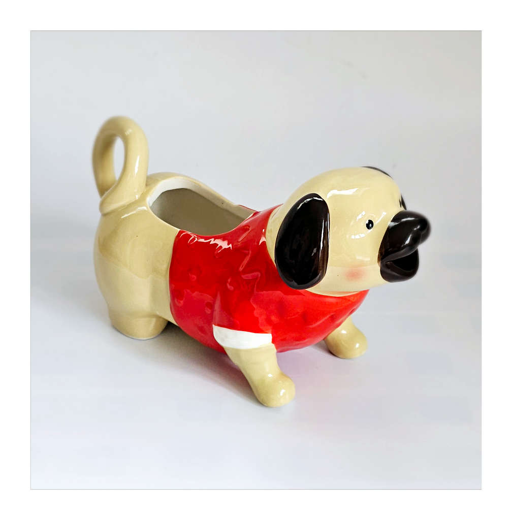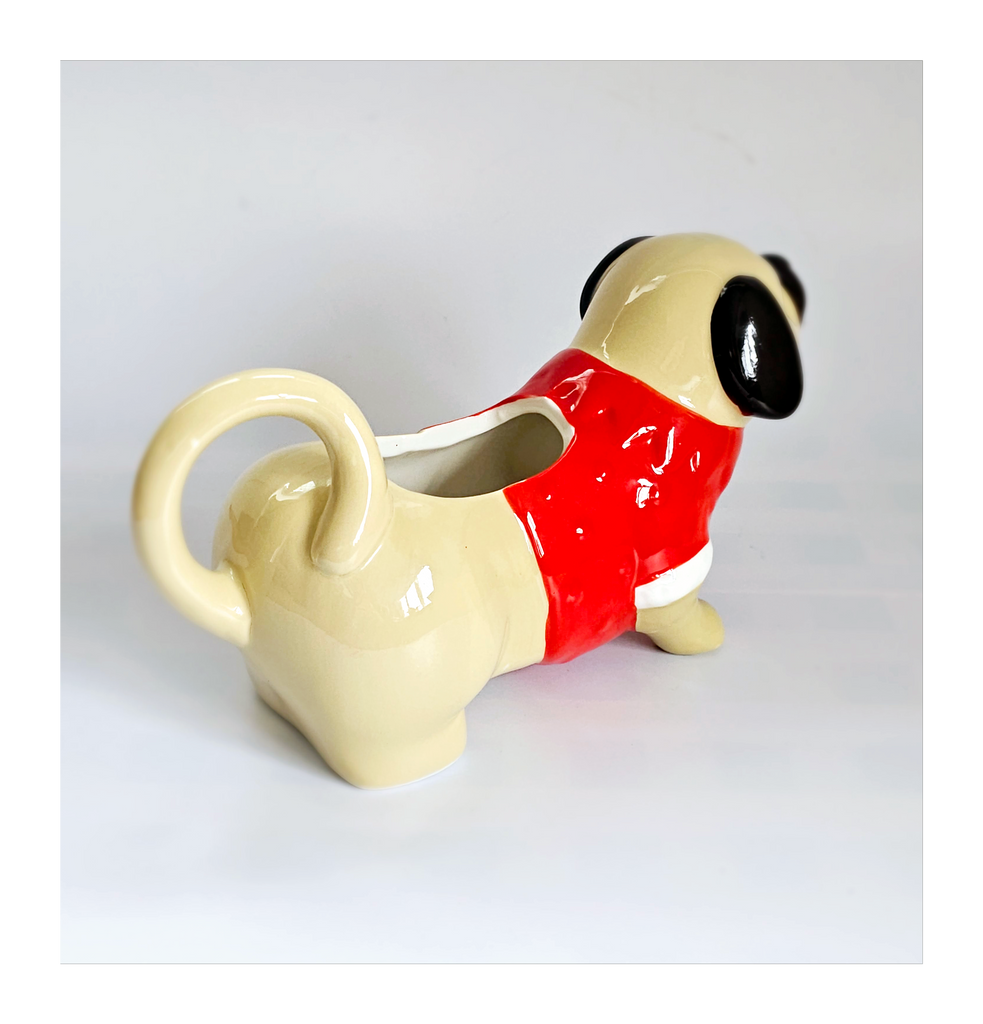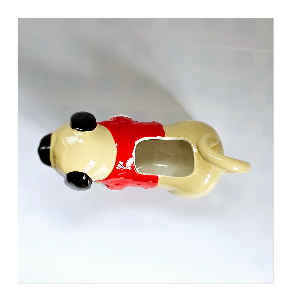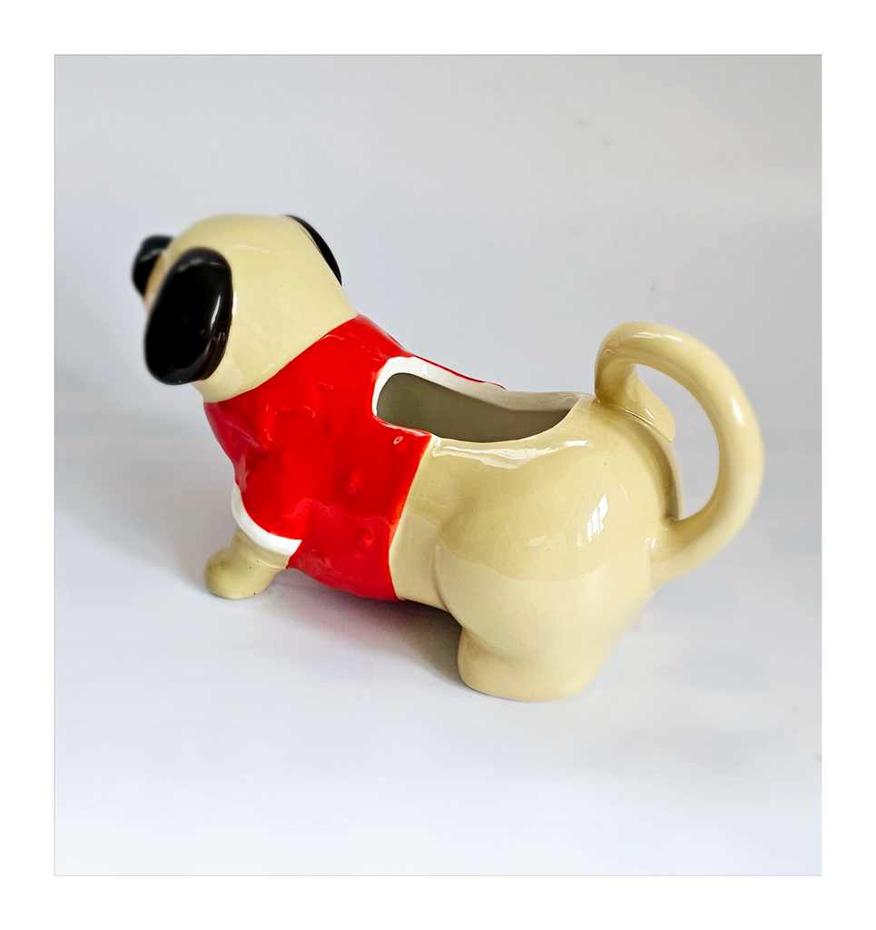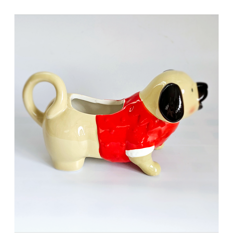 A rare very cute glazed ceramic poppy dog creamer / milk jug. It weighs 726 g. Its measurements are 21 cm width, 9 cm depth and 12 cm height. In excellent condition, no chips, no cracks and no restoration. A great addition to your Novelty Creamer collection. Collectable. Collector's item.