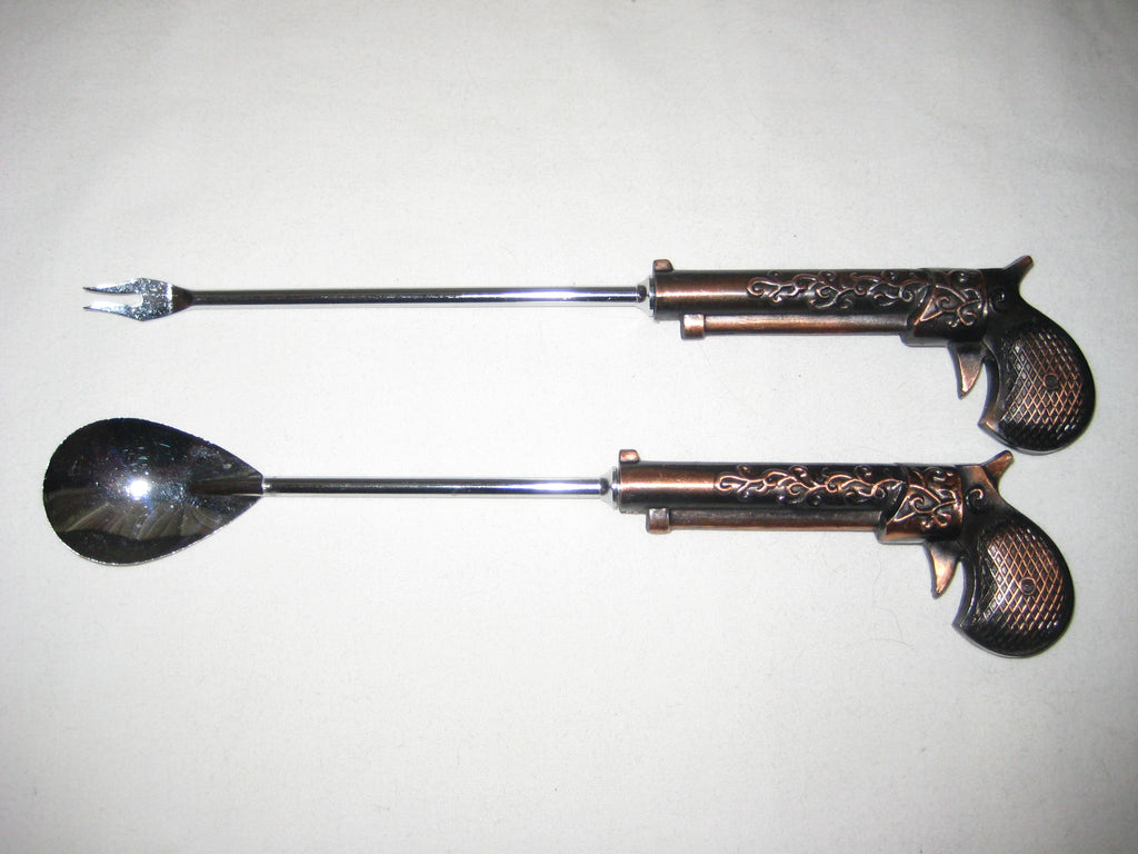 Decorative spoon and fork, with the handles in the shape of a gun. Made in Japan. It weighs 0.22 kg and its length is 24cm. In Excellent condition,. A great addition to your Japanese Art & craft / Novelty Items collection. Collectible. Collectors' item.