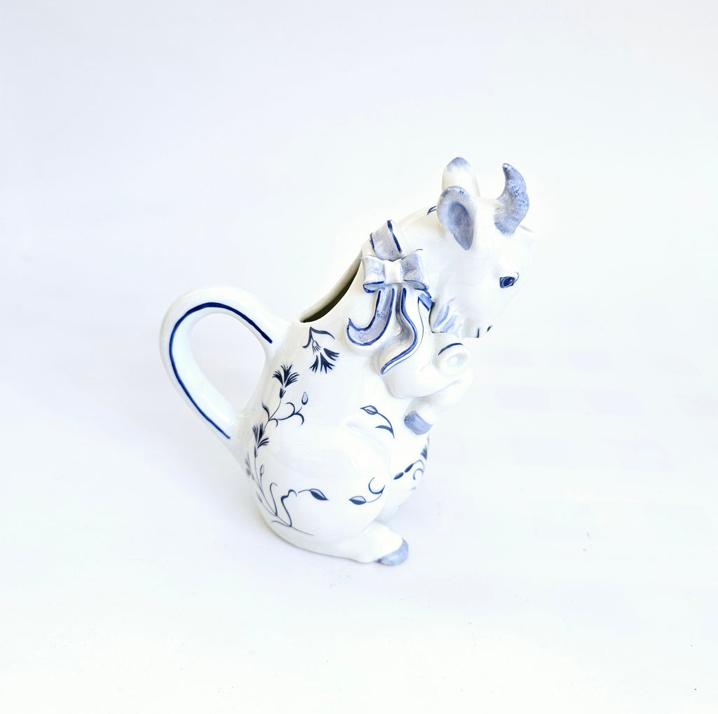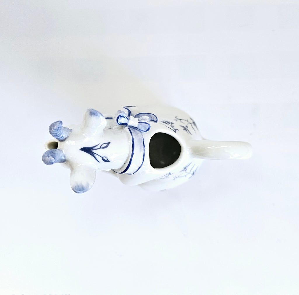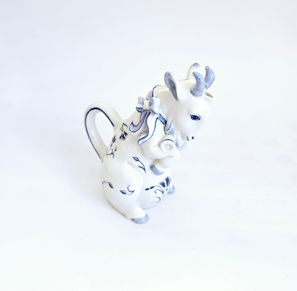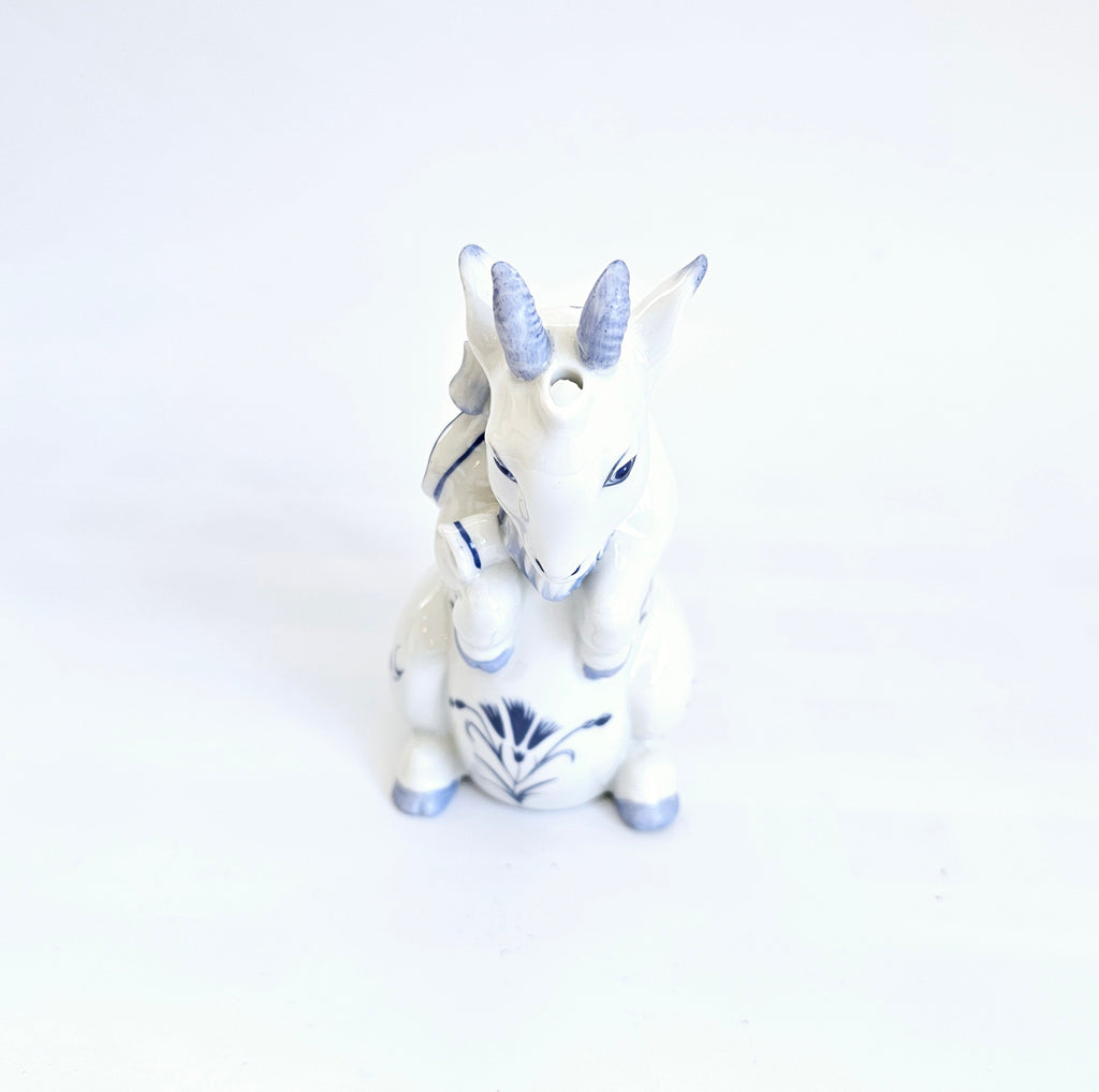 A vintage 1980's Franklin Mint Country Friends by Hallie Greer ceramic goat creamer / milk jug in Delft blue and white style. It weighs 147g. Its measurements are 11cm width at its widest, 12.5cm height, and 6cm depth. In excellent condition, no chips, no cracks and no restoration. A great addition to your Creamer / Novelty Items collection. Collectable, Collector's item.