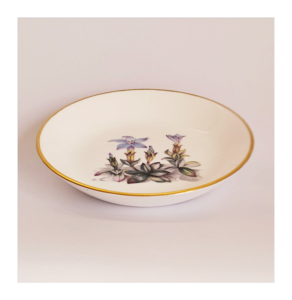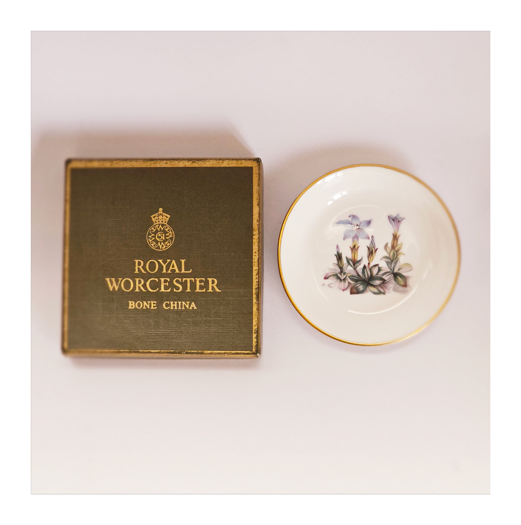 A rare vintage Royal Worcester Blue Gentian Flower Fine Bone China pin dish. It weighs 99 g. Its measurements are 1.5 cm height, 9.6 cm diameter. In excellent condition, no chips, no cracks, and in its original box. A great addition to your pin dish collection. Collectable. Collectors' item.