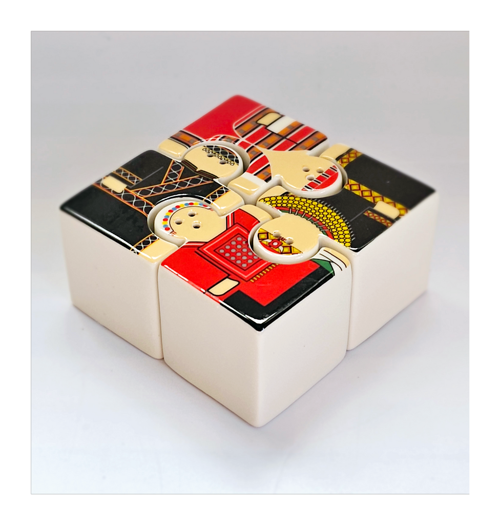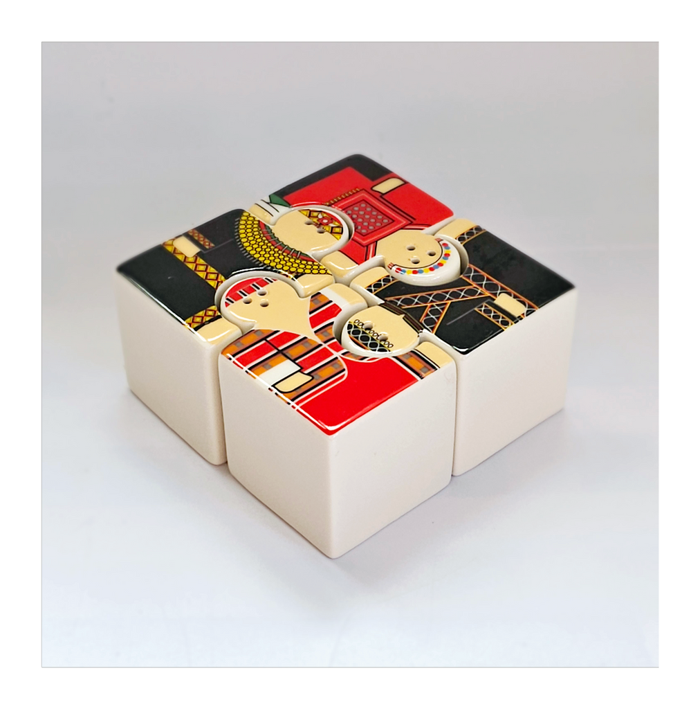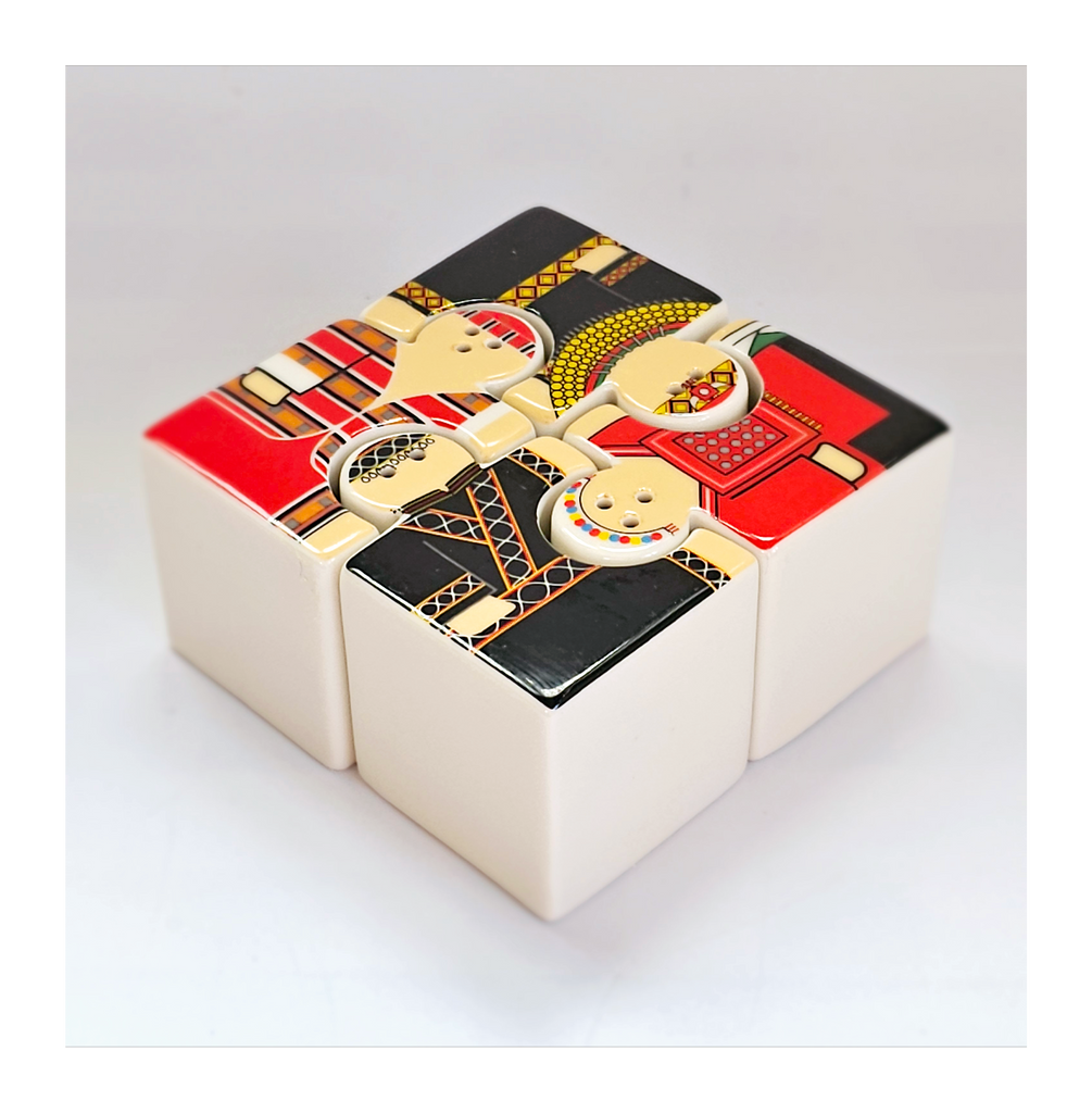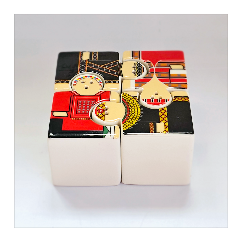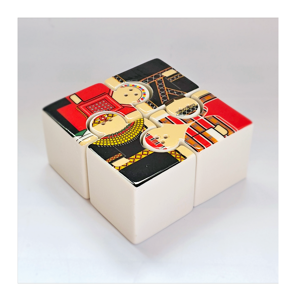 A unique contemporary design cube shaped porcelain salt and pepper shaker, made of two pairs fitted into each other like a jigsaw as seen in the images. It weighs 264 g. Its measurements are 8.5 cm by 8.5 cm, and 4 cm height. In perfect condition, no cracks, no chipping. A great addition to your salt and pepper shaker collection. Collectable. Collector's item.